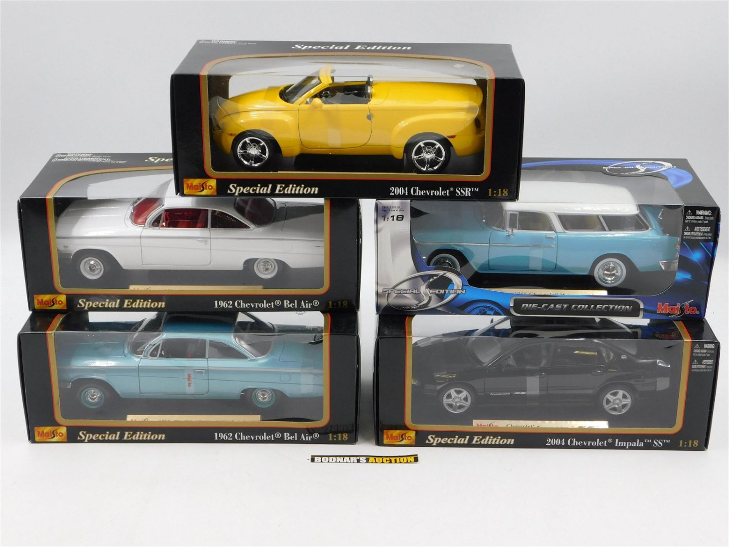 Lot of 5 Maisto Chevrolet Diecast Cars. Including (2) 1962 Chevrolet Bel Air (White and Blue), 1955 Chevrolet Nomad, 2004 Chevrolet Impala SS, and 2004 Chevrolet SSR All 1:18 Scale in Original Box. All invoices must be paid within 24 hours of the sale. All items are shipped USPS or UPS and will be billed separately. A $10 handling fee is added to the shipping price per lot. Local pickups are in our South Brunswick location on Friday, Saturday and Monday ONLY! All pickups are by appointment only. Any condition issues will be listed in the description. Please read the terms for full information.