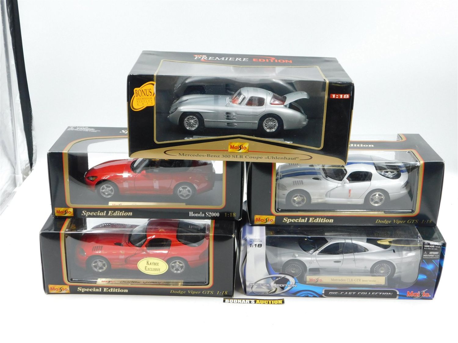 Lot of 5 Maisto Diecast Cars. Including Mercedes 300 SLR Coupe Unlenhaut, Mercedes CLK-GTR Street Version, (2) Dodge Viper GTS (White w/Blue Stripe and Red) and Honda S2000. All 1:18 Scale in Original Box. All invoices must be paid within 24 hours of the sale. All items are shipped USPS or UPS and will be billed separately. A $10 handling fee is added to the shipping price per lot. Local pickups are in our South Brunswick location on Friday, Saturday and Monday ONLY! All pickups are by appointment only. Any condition issues will be listed in the description. Please read the terms for full information.