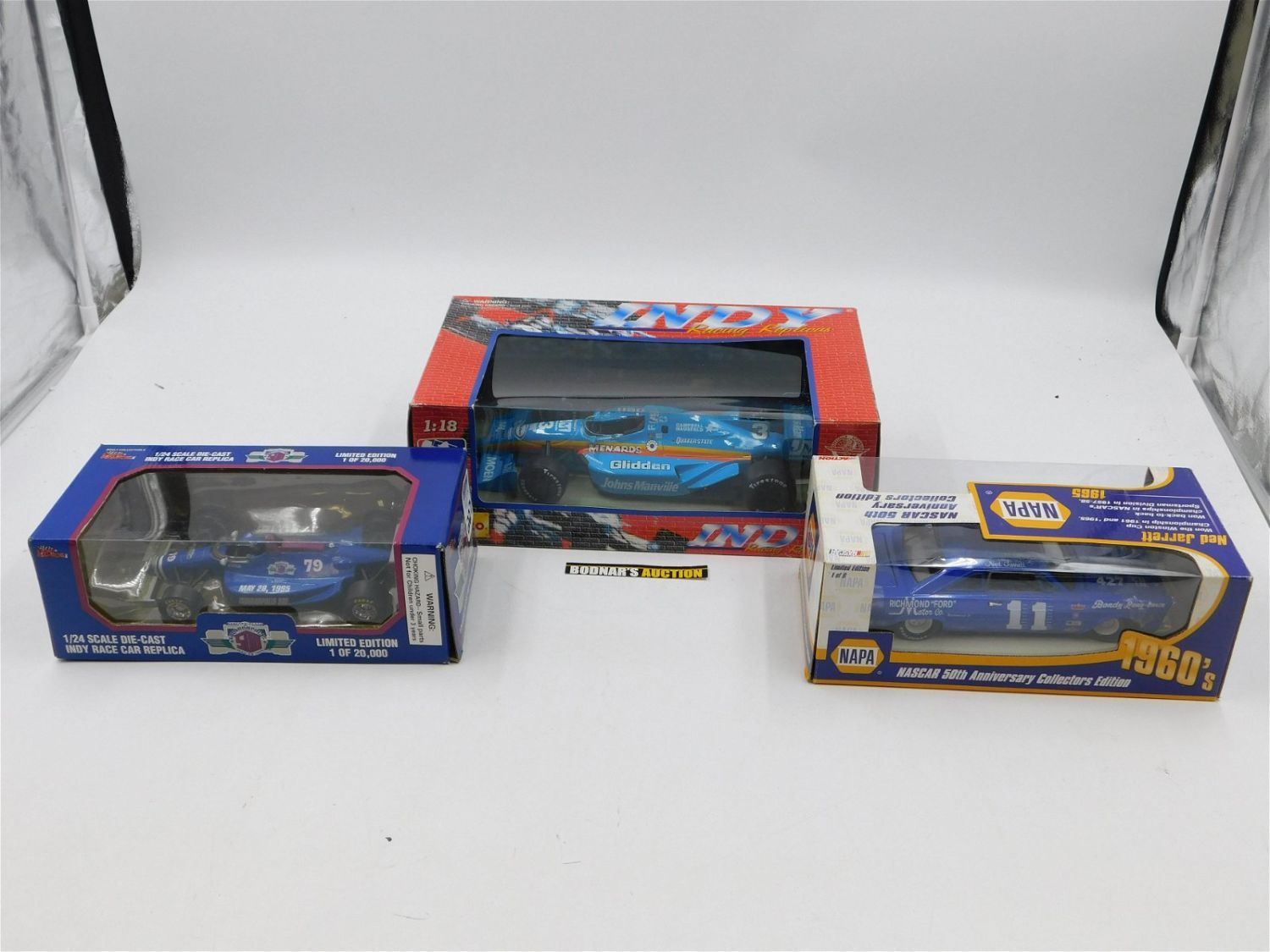 Lot of 3 Racing Diecast Cars including NAPA Nascar 50th Anniversary Collectors Edition 1960’s – Ned Jarrett 1:24 Scale, Racing Champions 79th Indianapolis 500 – May 28 1995 1:24 Scale and Maisto Indy Racing Replicas 1:18 Scale. All come in Original Boxes. All invoices must be paid within 24 hours of the sale. All items are shipped USPS or UPS and will be billed separately. A $10 handling fee is added to the shipping price per lot. Local pickups are in our South Brunswick location on Friday, Saturday and Monday ONLY! All pickups are by appointment only. Any condition issues will be listed in the description. Please read the terms for full information.