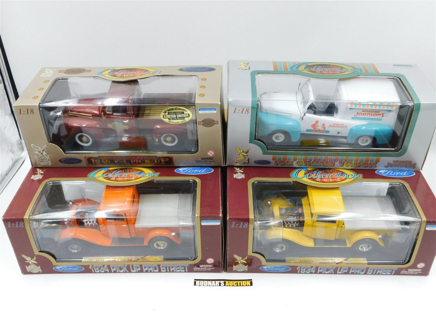 Lot of 4 Road Legends Ford Diecast Trucks including (2) 1934 Pick Up Pro Street (Yellow and Orange), 1948 Ford F-1 Pick Up – Limited Gold Edition, and 1948 Ford F-1 Howard Johnson’s Ice Cream Truck. 1:18 Scale Diecast. Comes in Original Box. All invoices must be paid within 24 hours of the sale. All items are shipped USPS or UPS and will be billed separately. A $10 handling fee is added to the shipping price per lot. Local pickups are in our South Brunswick location on Friday, Saturday and Monday ONLY! All pickups are by appointment only. Any condition issues will be listed in the description. Please read the terms for full information.