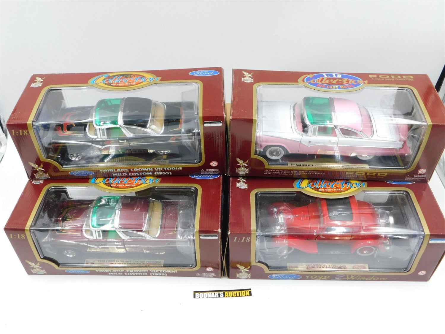 Lot of 4 Road Legends Ford Diecast Cars including (2) 1955 Fairlane Crown Victoria Mild Custom (Black and Maroon), 1955 Ford Fairlane Crown Victoria, and 1932 Ford 3-Window. 1:18 Scale Diecast. Comes in Original Box. All invoices must be paid within 24 hours of the sale. All items are shipped USPS or UPS and will be billed separately. A $10 handling fee is added to the shipping price per lot. Local pickups are in our South Brunswick location on Friday, Saturday and Monday ONLY! All pickups are by appointment only. Any condition issues will be listed in the description. Please read the terms for full information.