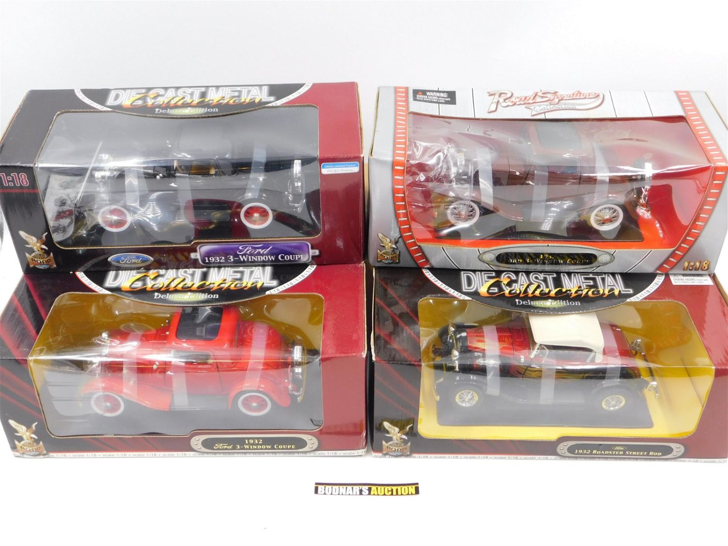 Lot of 4 Road Signature Ford Diecast Cars including (3) 1932 3-Window Coupes (Maroon, Red, and Black) and 1932 Roadster Street Rod. 1:18 Scale Diecast. Comes in Original Box. All invoices must be paid within 24 hours of the sale. All items are shipped USPS or UPS and will be billed separately. A $10 handling fee is added to the shipping price per lot. Local pickups are in our South Brunswick location on Friday, Saturday and Monday ONLY! All pickups are by appointment only. Any condition issues will be listed in the description. Please read the terms for full information.