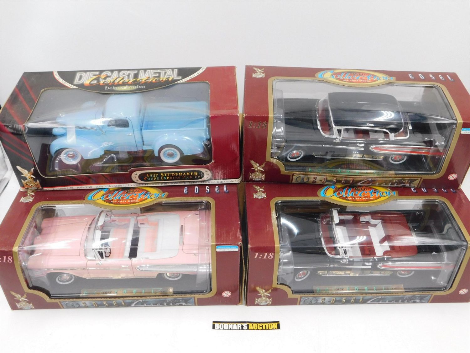 Lot of 4 Road Signature/Legends Diecast Cars including (3) 1958 Edsel Citation (Black Hardtop, Black Convertible, and Pink), and 1937 Studebaker Coupe Express Pick Up. 1:18 Scale Diecast. Comes in Original Box. All invoices must be paid within 24 hours of the sale. All items are shipped USPS or UPS and will be billed separately. A $10 handling fee is added to the shipping price per lot. Local pickups are in our South Brunswick location on Friday, Saturday and Monday ONLY! All pickups are by appointment only. Any condition issues will be listed in the description. Please read the terms for full information.