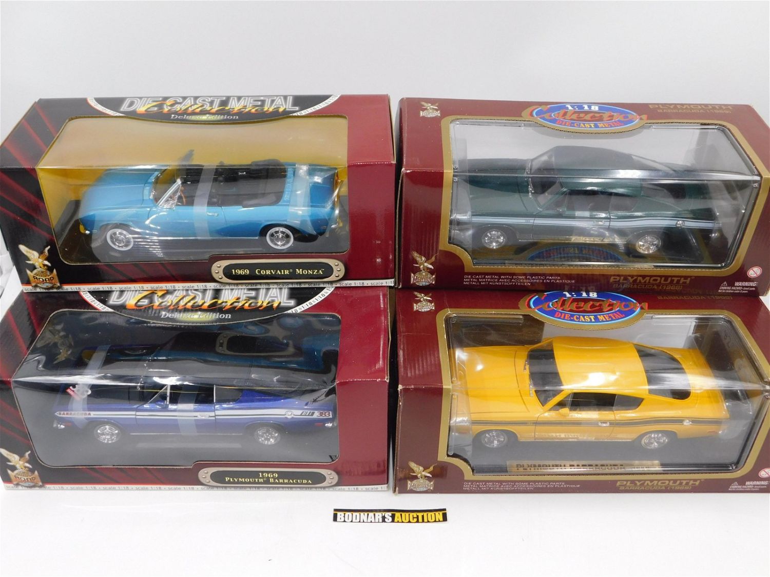 Lot of 4 Road Signature/Legends Diecast Cars including (3) 1969 Plymouth Barracuda (Purple, Green and Yellow) and 1969 Corvair Monza. 1:18 Scale Diecast. Comes in Original Box. All invoices must be paid within 24 hours of the sale. All items are shipped USPS or UPS and will be billed separately. A $10 handling fee is added to the shipping price per lot. Local pickups are in our South Brunswick location on Friday, Saturday and Monday ONLY! All pickups are by appointment only. Any condition issues will be listed in the description. Please read the terms for full information.