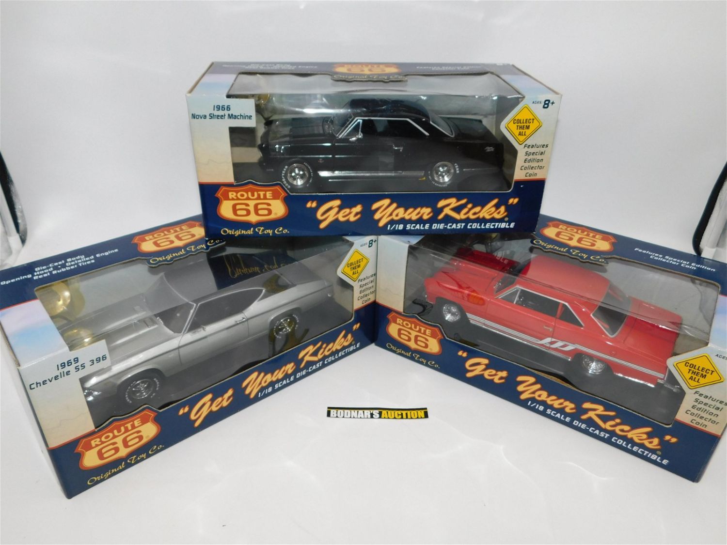 Lot of 3 Route 66 "Get Your Kicks" Original Toy Co. Diecast Cars including 1966 Pro Stock Nova, 1966 Nova Street Machine, and 1969 Chevelle SS 396. 1:18 Scale Diecast. Comes in Original Box. All invoices must be paid within 24 hours of the sale. All items are shipped USPS or UPS and will be billed separately. A $10 handling fee is added to the shipping price per lot. Local pickups are in our South Brunswick location on Friday, Saturday and Monday ONLY! All pickups are by appointment only. Any condition issues will be listed in the description. Please read the terms for full information.