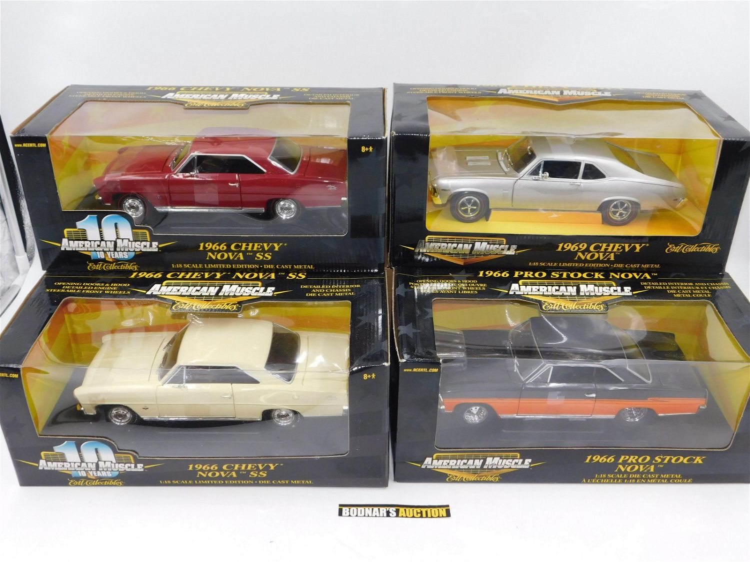 Lot of 4 American Muscle Nova Diecast Cars including (2) 1966 Chevy Nova SS (Cream and Red), 1966 Pro Stock Nova, and 1969 Chevy Nova. Three Cars are Limited Edition and all are 1:18 Scale Diecast. Comes in Original Box. All invoices must be paid within 24 hours of the sale. All items are shipped USPS or UPS and will be billed separately. A $10 handling fee is added to the shipping price per lot. Local pickups are in our South Brunswick location on Friday, Saturday and Monday ONLY! All pickups are by appointment only. Any condition issues will be listed in the description. Please read the terms for full information.