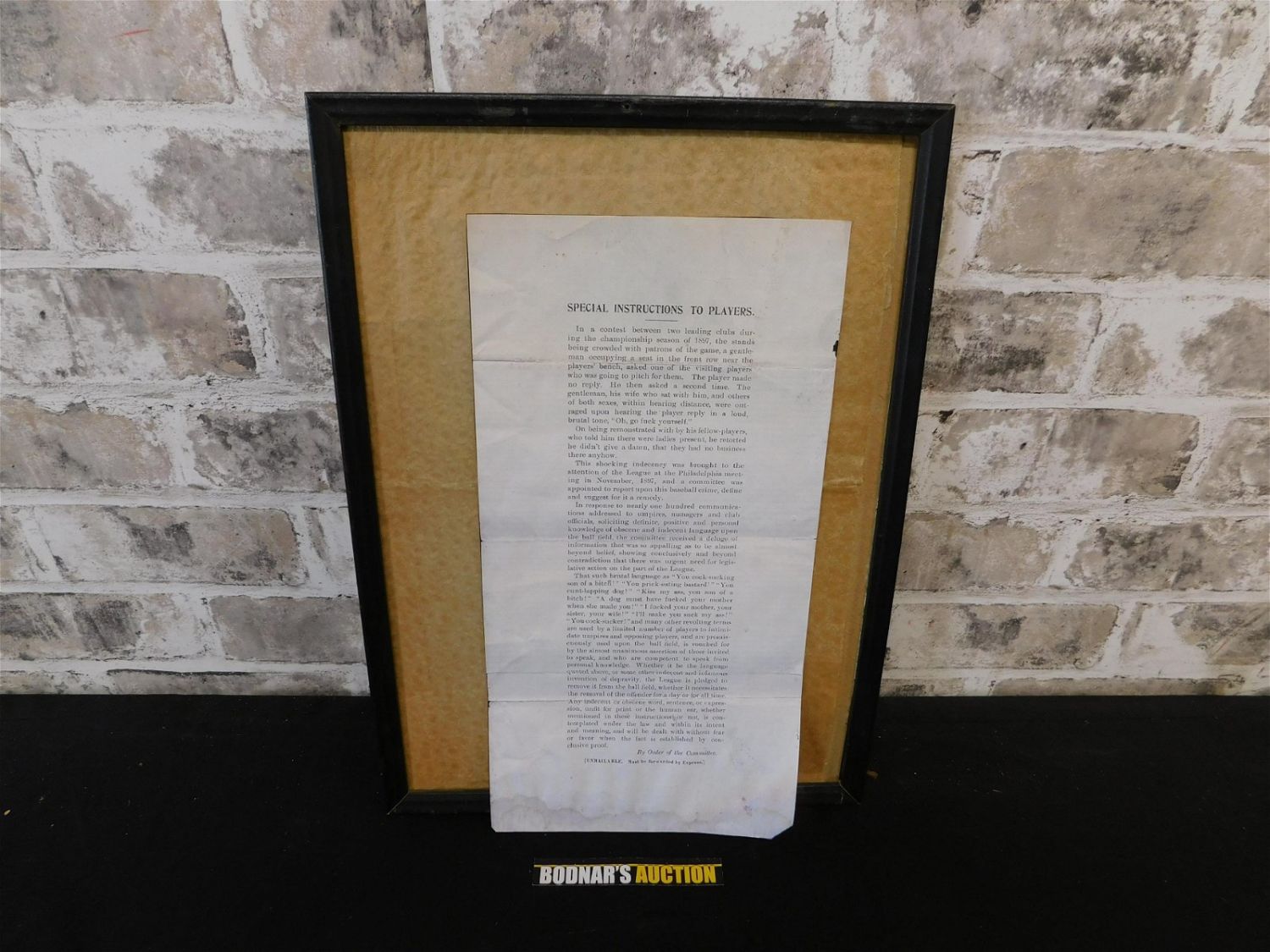 Copy of 1897 Instructions to all National League Players regarding Profanity on the field. Was framed. Glass came loose. Paper is not mounted. Framed measures 14.75" tall x 10.75" wide. Some water damage on bottom edge. All lots in this auction came from the Historic McGreevy’s Sports Bar in Boston Massachusetts. These items were hanging or displayed in the bar until the closure of the bar in 2020. All items in this sale are copies from the original archives from the Boston Public Library unless noted in the description as "original". Please read the terms and conditions. This sale will be broadcast live on sale day with full descriptions of each lot being sold, as well as video feed of each lot. All items MUST be paid for within 24 HOURS of the sale. Anyone who has not paid within 24 hours will have a dispute opened against them and will not be able to bid at future sales. All items in this sale are local pick up only, or shipping via UPS store in Kendall Park, NJ.. If you need your items shipped, we will send your items to the UPS store in Kendall Park, NJ . They will pack it and ship it to you and you will pay them separately and directly. Please call them to get a quote before bidding. Their phone number is 732-422-7242. If you are picking your items up you must contact us NO LATER than 24 hours after the sale to schedule an appointment to pick up. Pick up dates are Thursday, Friday, Saturday, and Monday ONLY, and are BY APPOINTMENT ONLY!! After Monday, if you have not picked up your items, they will be disposed of.