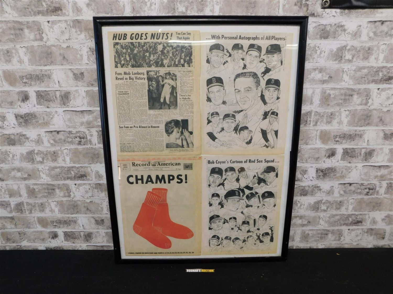 Framed 1967 Record American Cover of Newspaper Honoring AL Champions Red Sox. Measures 32" tall x 24.5" wide. All lots in this auction came from the Historic McGreevy’s Sports Bar in Boston Massachusetts. These items were hanging or displayed in the bar until the closure of the bar in 2020. All items in this sale are copies from the original archives from the Boston Public Library unless noted in the description as "original". Please read the terms and conditions. This sale will be broadcast live on sale day with full descriptions of each lot being sold, as well as video feed of each lot. All items MUST be paid for within 24 HOURS of the sale. Anyone who has not paid within 24 hours will have a dispute opened against them and will not be able to bid at future sales. All items in this sale are local pick up only, or shipping via UPS store in Kendall Park, NJ.. If you need your items shipped, we will send your items to the UPS store in Kendall Park, NJ . They will pack it and ship it to you and you will pay them separately and directly. Please call them to get a quote before bidding. Their phone number is 732-422-7242. If you are picking your items up you must contact us NO LATER than 24 hours after the sale to schedule an appointment to pick up. Pick up dates are Thursday, Friday, Saturday, and Monday ONLY, and are BY APPOINTMENT ONLY!! After Monday, if you have not picked up your items, they will be disposed of.