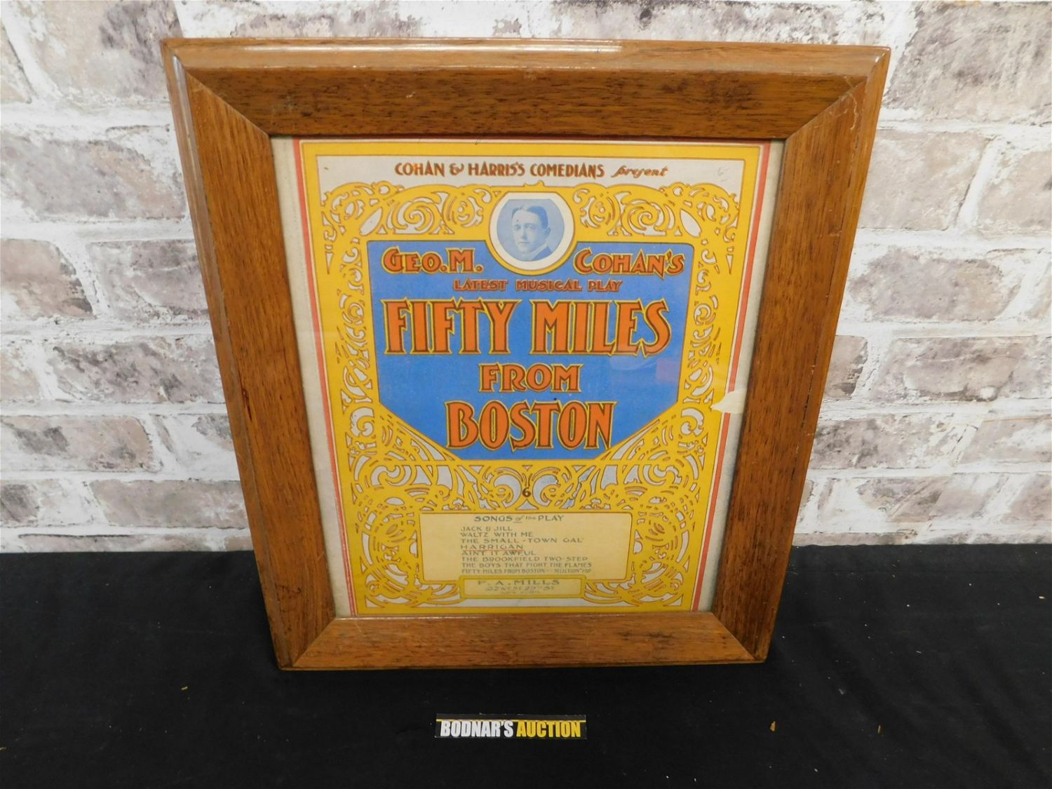 Framed Sheet Music from George M. Cohan "Fifty Miles from Boston" with Cohan Portrait. Measures 16" tall x 14" wide. All lots in this auction came from the Historic McGreevy’s Sports Bar in Boston Massachusetts. These items were hanging or displayed in the bar until the closure of the bar in 2020. All items in this sale are copies from the original archives from the Boston Public Library unless noted in the description as "original". Please read the terms and conditions. This sale will be broadcast live on sale day with full descriptions of each lot being sold, as well as video feed of each lot. All items MUST be paid for within 24 HOURS of the sale. Anyone who has not paid within 24 hours will have a dispute opened against them and will not be able to bid at future sales. All items in this sale are local pick up only, or shipping via UPS store in Kendall Park, NJ.. If you need your items shipped, we will send your items to the UPS store in Kendall Park, NJ . They will pack it and ship it to you and you will pay them separately and directly. Please call them to get a quote before bidding. Their phone number is 732-422-7242. If you are picking your items up you must contact us NO LATER than 24 hours after the sale to schedule an appointment to pick up. Pick up dates are Thursday, Friday, Saturday, and Monday ONLY, and are BY APPOINTMENT ONLY!! After Monday, if you have not picked up your items, they will be disposed of.