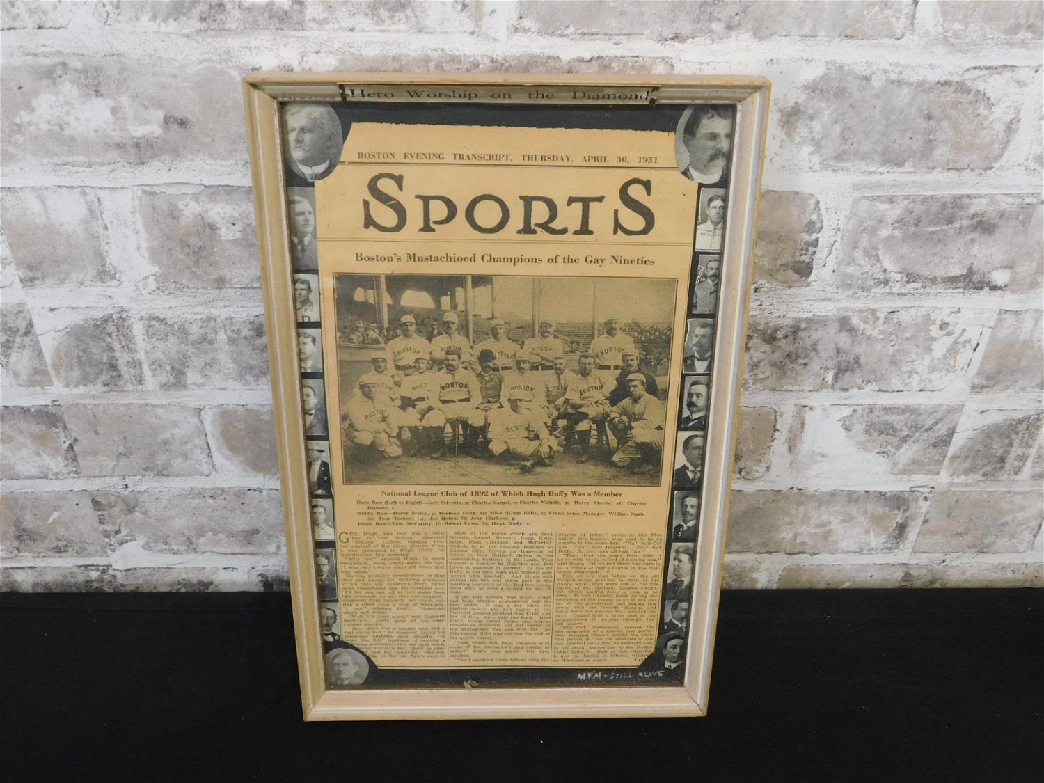 Framed 1931 Sports Article with photo of Boston’s National League Club of 1892 with Hall of Fame Players Mike (King) Kelly, Tom McCarthy and Hugh Duffy. This was a personal item of McGreevy’s. Measures 14" tall x 9" wide. Please read the terms and conditions. This sale will be broadcast live on sale day with full descriptions of each lot being sold, as well as video feed of each lot. All items MUST be paid for within 24 HOURS of the sale. Anyone who has not paid within 24 hours will have a dispute opened against them and will not be able to bid at future sales. All items in this sale are local pick up only, or shipping via UPS store in Kendall Park, NJ.. If you need your items shipped, we will send your items to the UPS store in Kendall Park, NJ . They will pack it and ship it to you and you will pay them separately and directly. Please call them to get a quote before bidding. Their phone number is 732-422-7242. If you are picking your items up you must contact us NO LATER than 24 hours after the sale to schedule an appointment to pick up. Pick up dates are Thursday, Friday, Saturday, and Monday ONLY, and are BY APPOINTMENT ONLY!! After Monday, if you have not picked up your items, they will be disposed of.