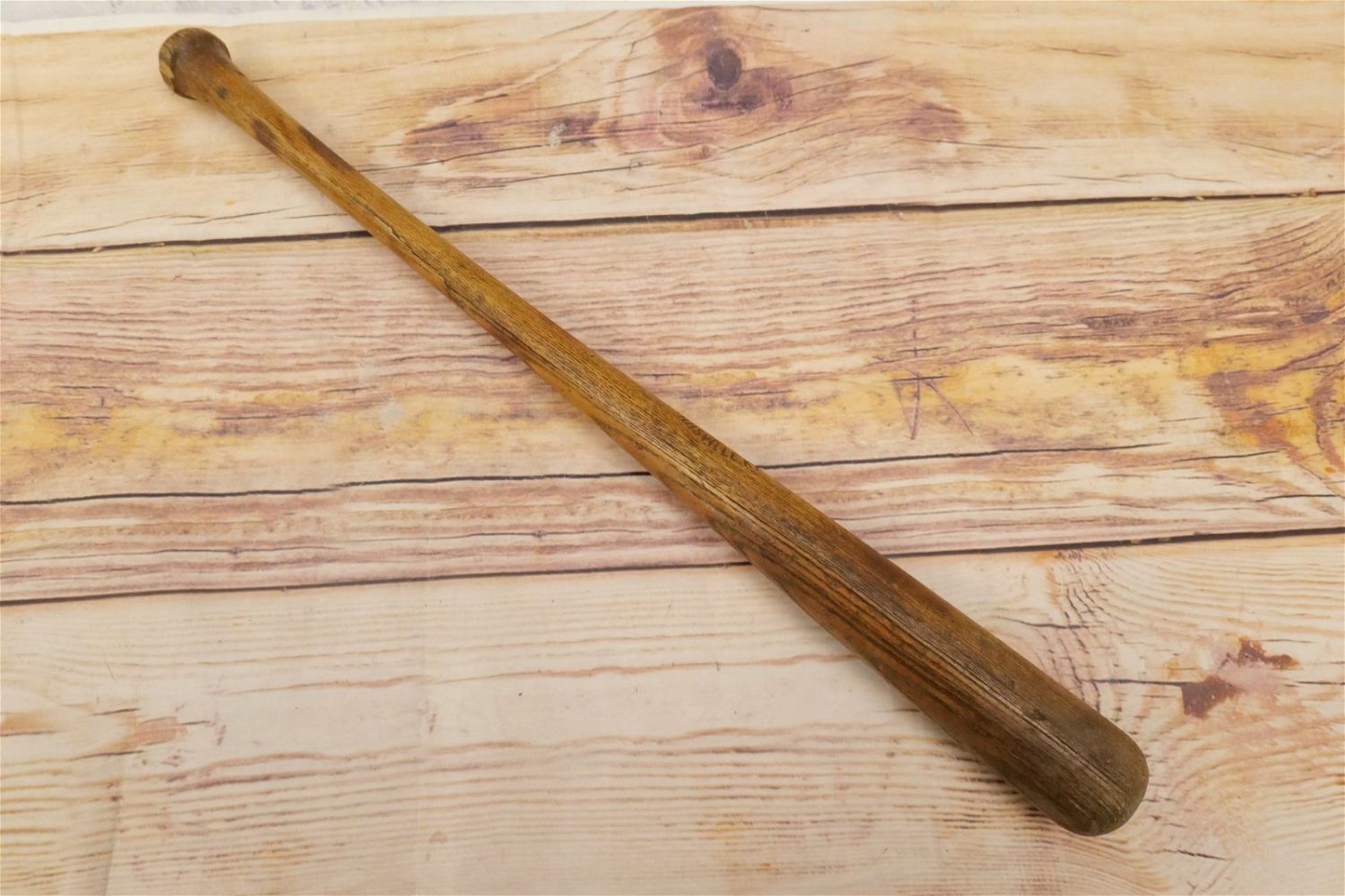 Hillerich & Bradsby Co. Champion Bat. Circa 1914 – 1938. Bat has a crack on lower grip/handle area and some chipping on the knob. Measures 31" long. All bats are considered to be in used condition. All invoices must be paid within 24 hours of the sale. We offer multiple shipping options, the estimate on this page is ONLY the Liveauctioneers Live Ship Option, we also offer Pick-Ups Thursday, Friday, Saturday, and Monday immediately following the sale. BY APPOINTMENT ONLY.