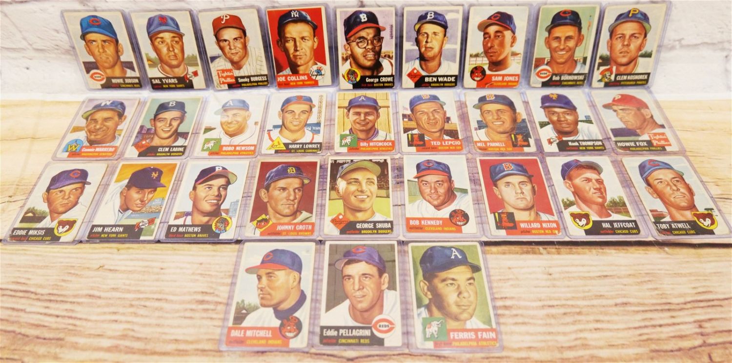 Lot of 30 Topps 1953 Baseball Cards. Including #3,4, 6-20, 22-24, 26, 28-30, 33, 34, and 36-39. Including Ed Mathews. All invoices must be paid within 24 hours of the sale. We offer multiple shipping options, the estimate on this page is ONLY the Liveauctioneers Live Ship Option, we also offer Pick-Ups Thursday, Friday, Saturday, and Monday immediately following the sale. BY APPOINTMENT ONLY.
