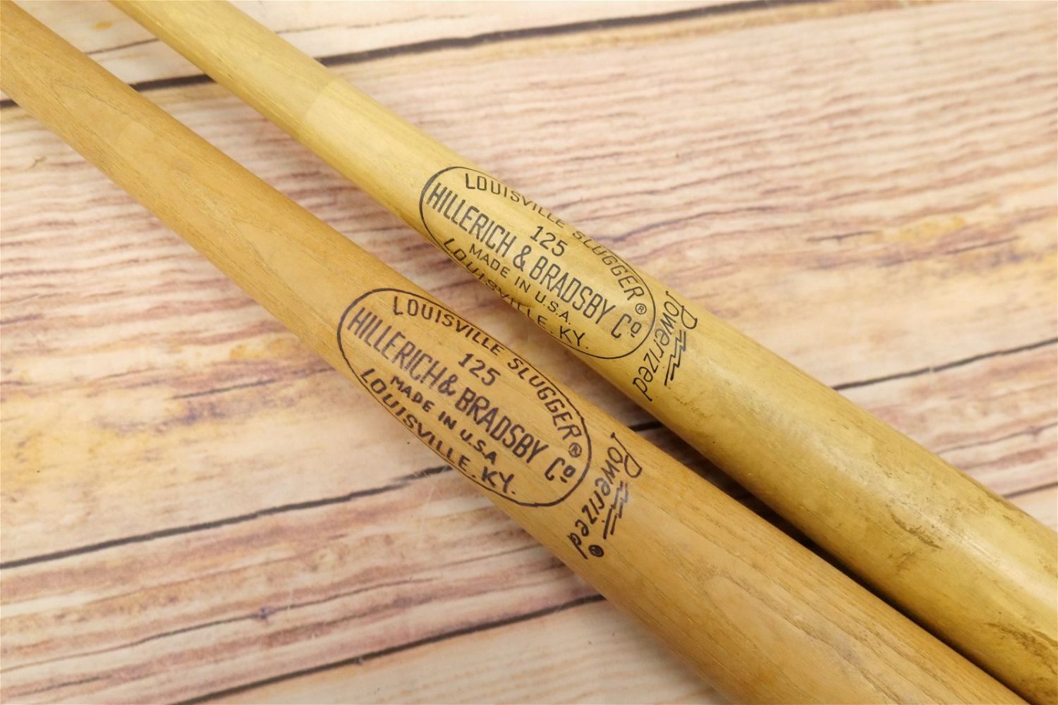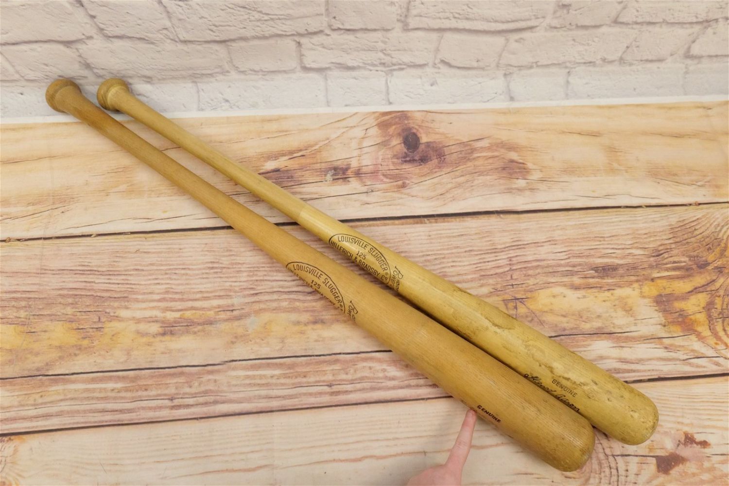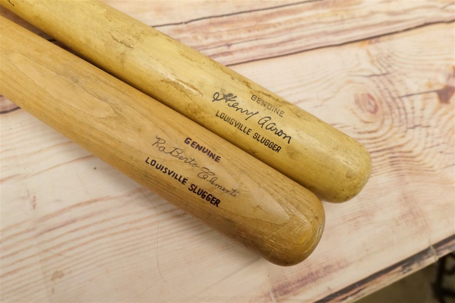 Lot of 2 Hillerich & Bradsby Co. Louisville Sluggers. Circa 1965-1979. Lot includes Henry Aaron 125 and Roberto Clemente 125. Largest measures 34" long. All bats are considered to be in used condition. All invoices must be paid within 24 hours of the sale. We offer multiple shipping options, the estimate on this page is ONLY the Liveauctioneers Live Ship Option, we also offer Pick-Ups Thursday, Friday, Saturday, and Monday immediately following the sale. BY APPOINTMENT ONLY.