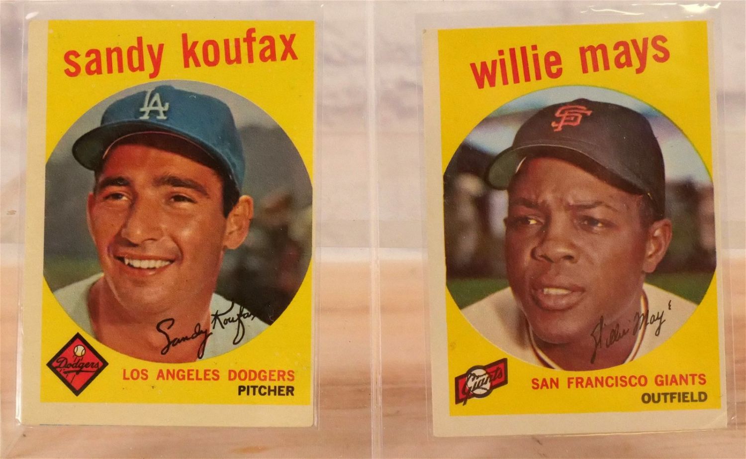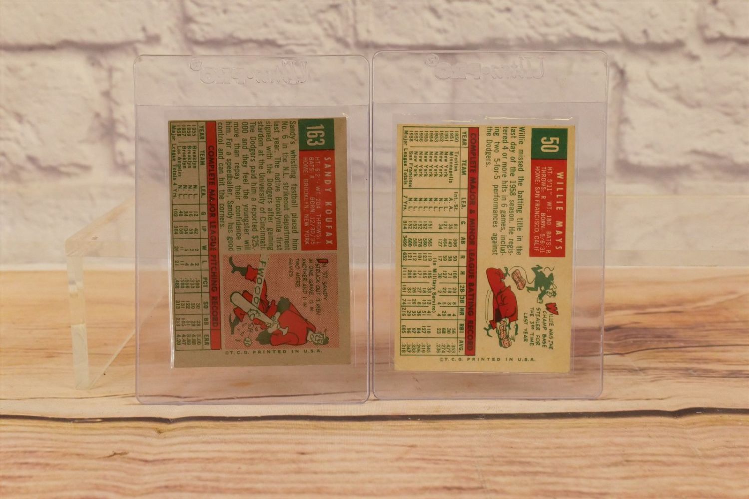 Lot of 2 Topps 1959 Baseball Cards including Willie Mays #50 and Sandy Koufax #163. All invoices must be paid within 24 hours of the sale. We offer multiple shipping options, the estimate on this page is ONLY the Liveauctioneers Live Ship Option, we also offer Pick-Ups Thursday, Friday, Saturday, and Monday immediately following the sale. BY APPOINTMENT ONLY.