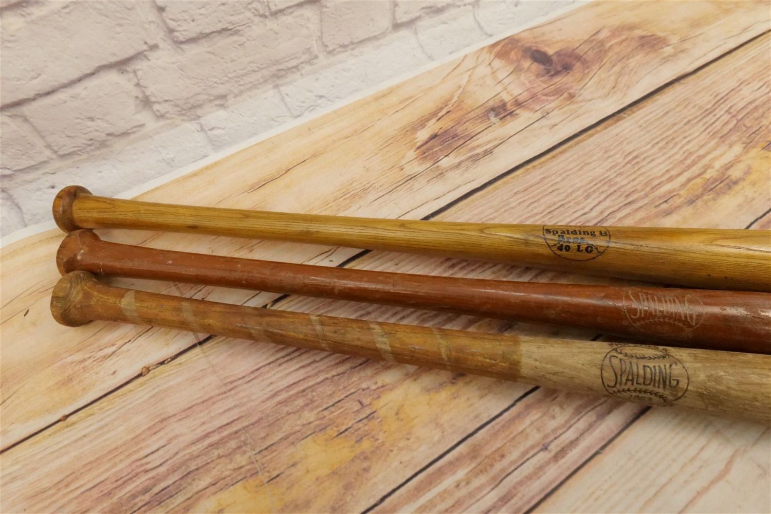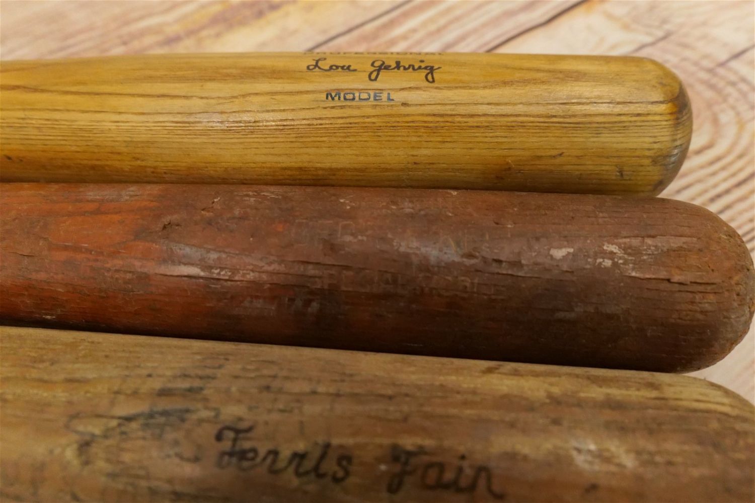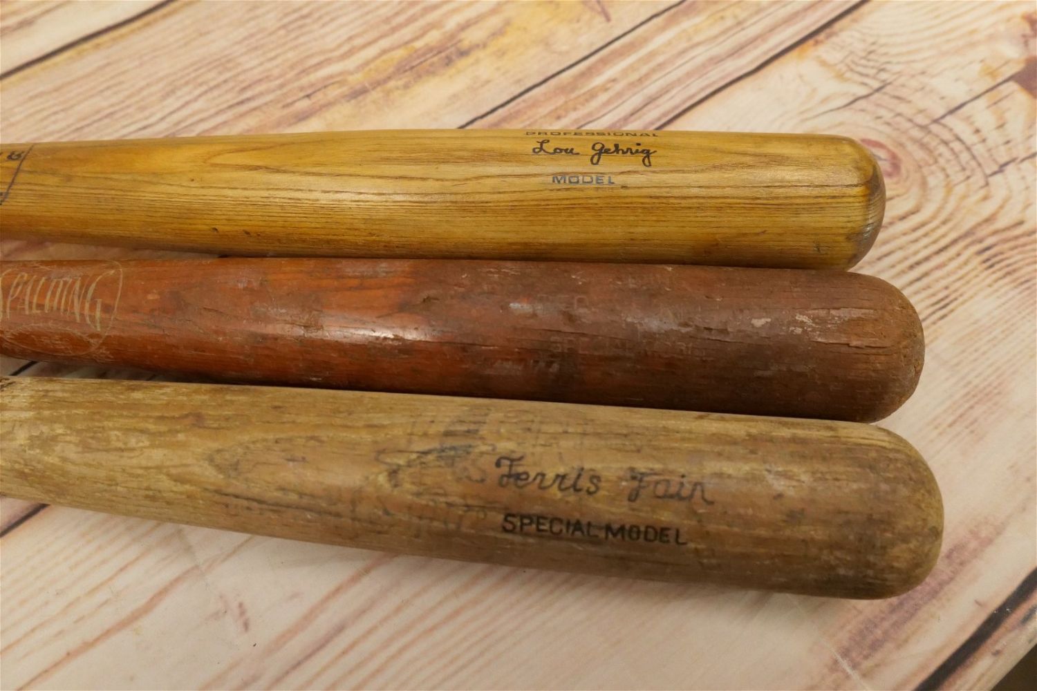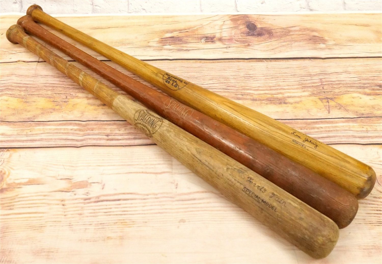 Lot of 3 Spalding Baseball Bats. Circa 1953-60. Lot includes Lou Gehrig Spalding & Bros Bat, George Kell – Chip on knob, and Ferris Fain Special Model – Chip on knob. Largest bat measures 33.5" long. All bats are considered to be in used condition. All invoices must be paid within 24 hours of the sale. We offer multiple shipping options, the estimate on this page is ONLY the Liveauctioneers Live Ship Option, we also offer Pick-Ups Thursday, Friday, and , Saturday, and Monday immediately following the sale. BY APPOINTMENT ONLY.