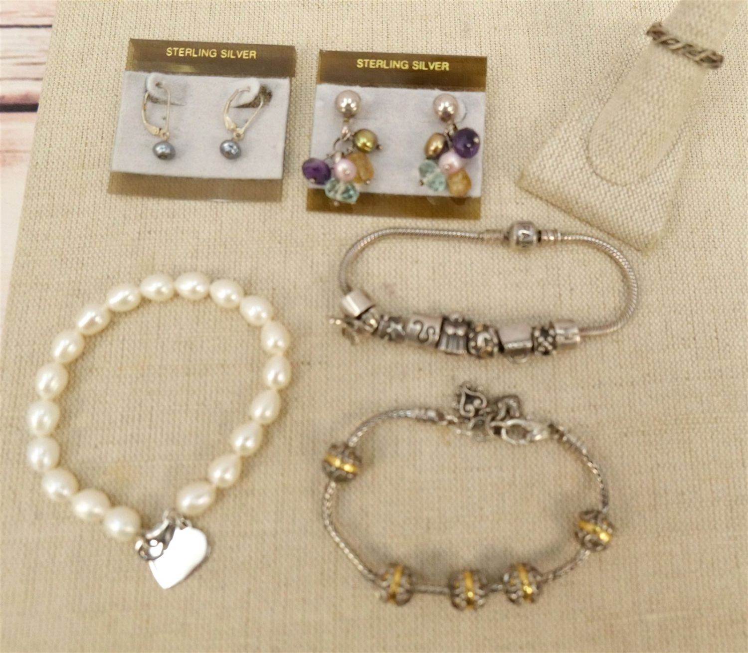 Lot of Sterling Silver Jewelry including Brighton Charm Bracelet, Pandora Charm Bracelet, 2 Drop Earrings, Twisted Wire Ring, and Pearl Bracelet with Sterling Clasp. All invoices must be paid within 24 hours of the sale. We offer multiple shipping options besides the Liveauctioneers Liveship quoted on this listing., We also offer Pick-Ups Friday, Saturday, and Monday immediately following the sale. BY APPOINTMENT ONLY.