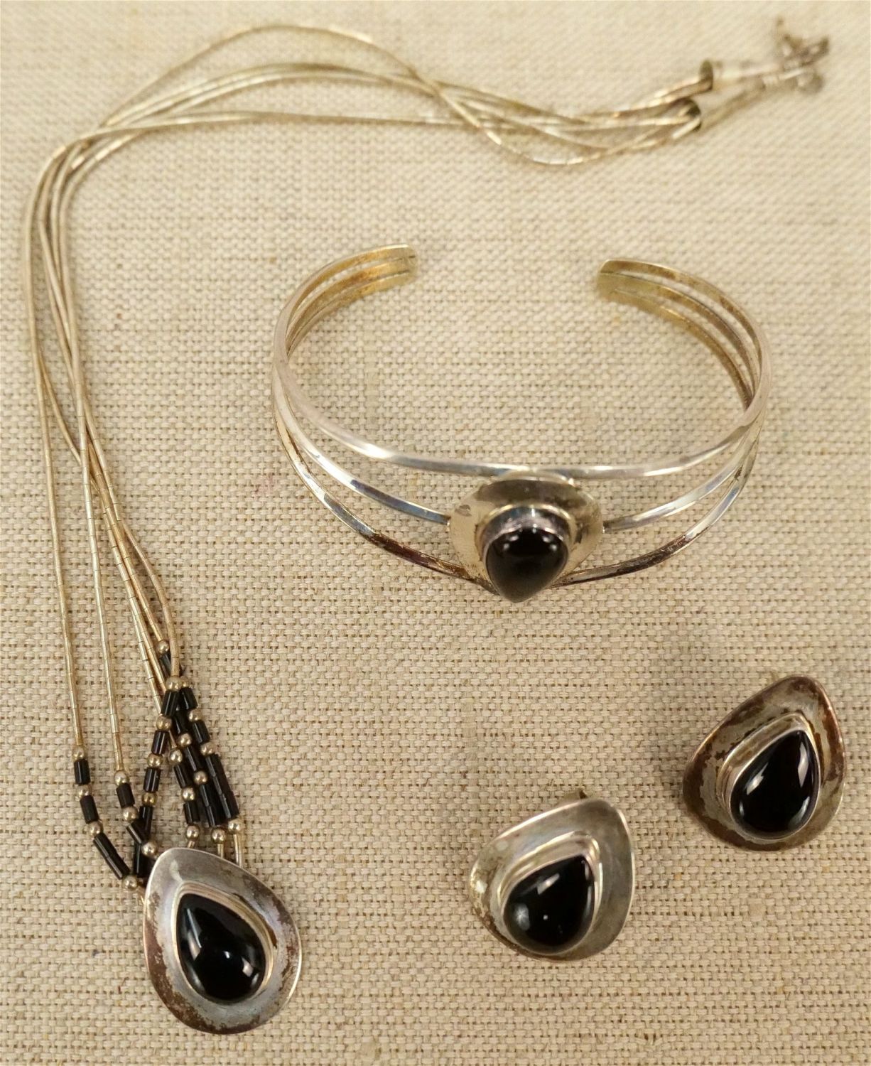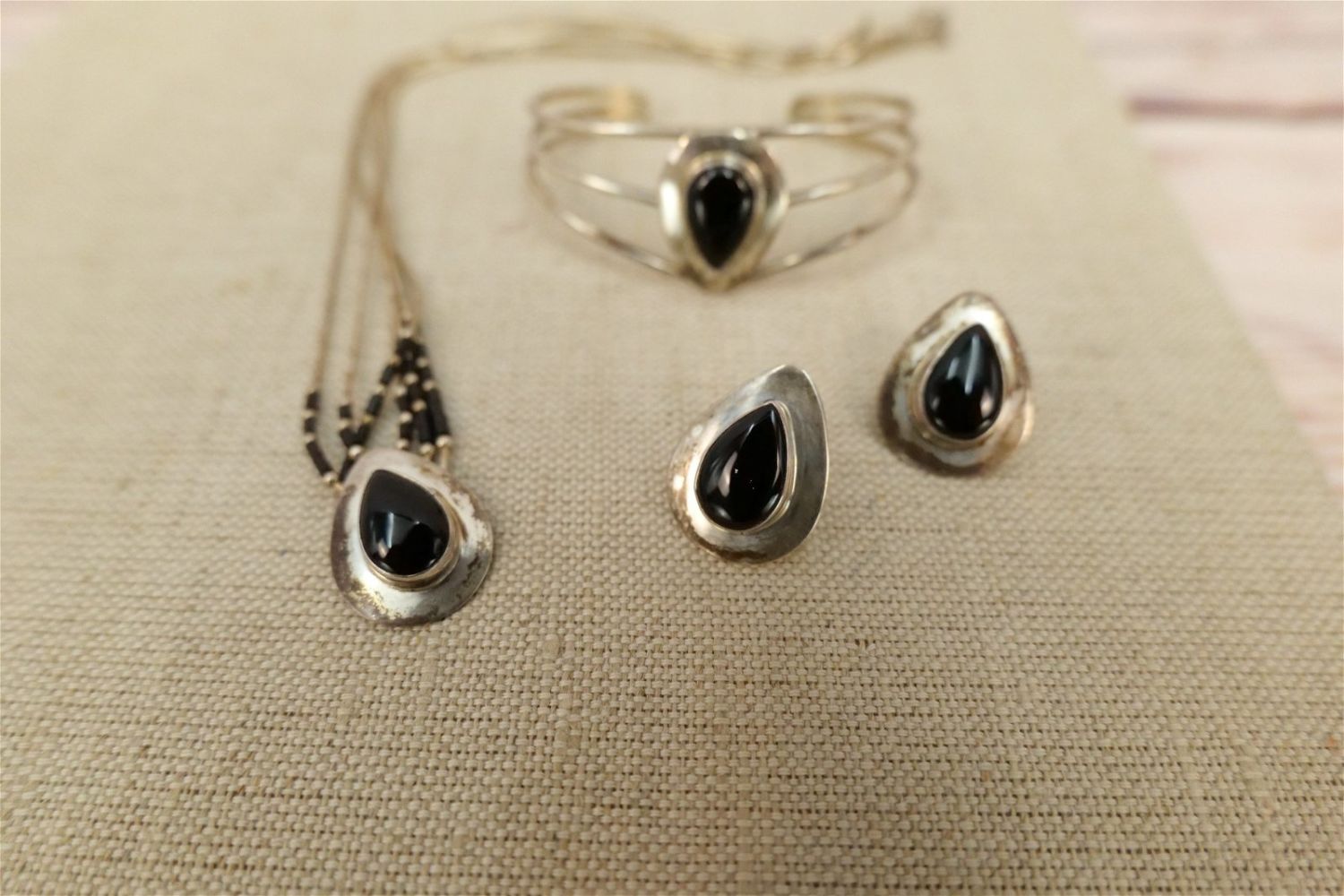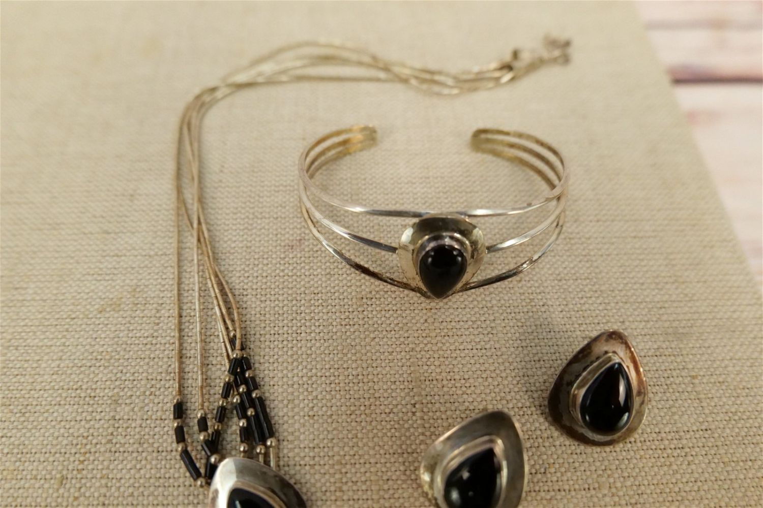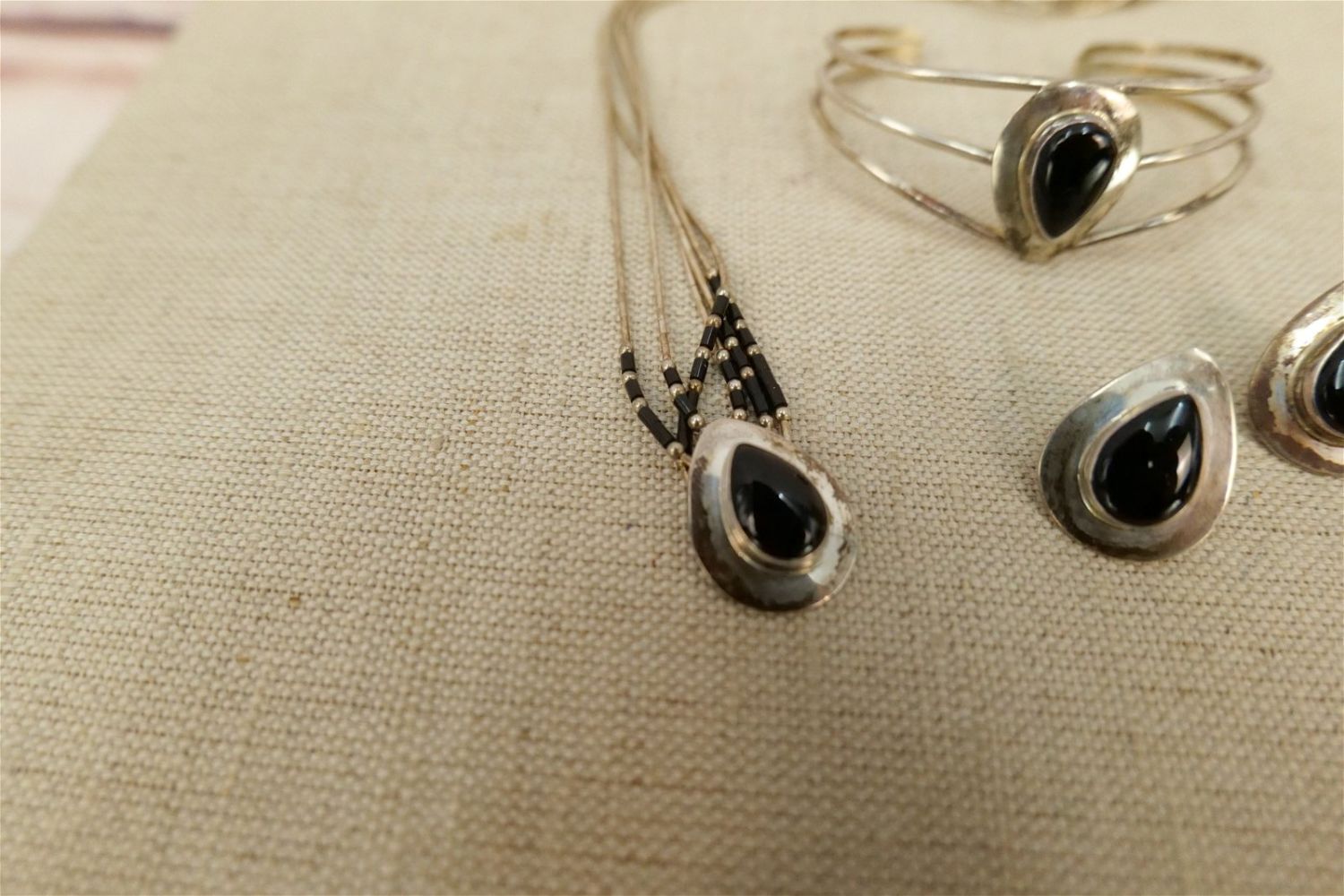 Sterling Silver Jewelry Set including Necklace, Cuff, and Earrings which is a liquid sterling necklace with a black stone pendant, matching earrings and matching cuff. All invoices must be paid within 24 hours of the sale. We offer multiple shipping options besides the Liveauctioneers Liveship quoted on this listing., We also offer Pick-Ups Friday, Saturday, and Monday immediately following the sale. BY APPOINTMENT ONLY.