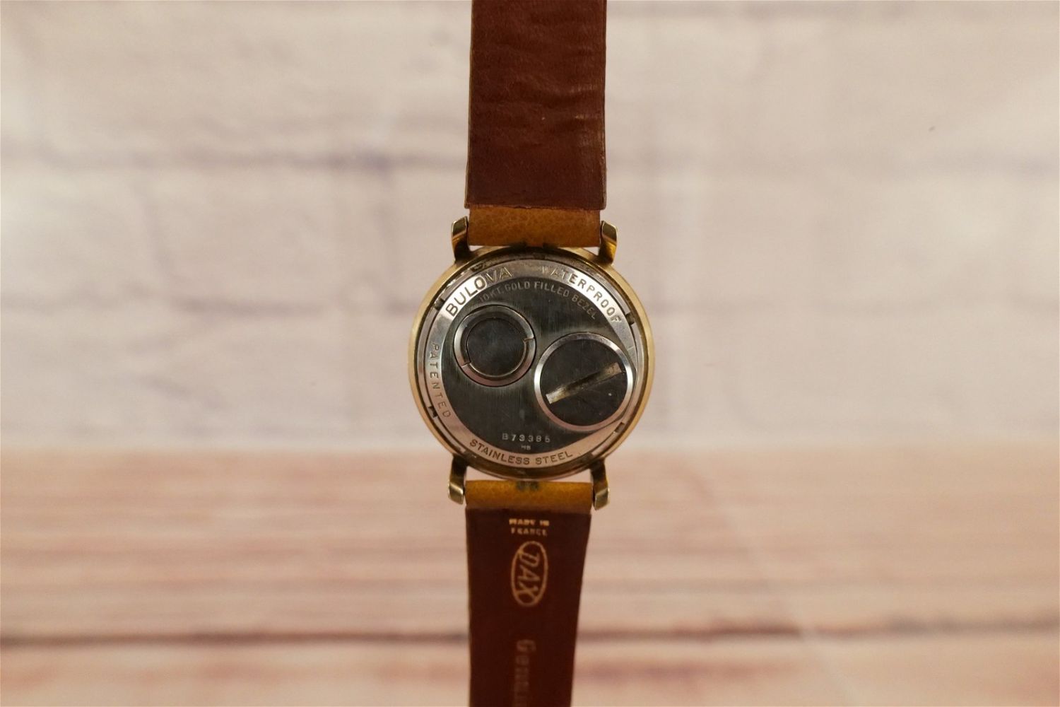 10k Gold Filled Bulova Accutron 214 Spaceview M5 Men’s Watch. No. B73385. Not Tested. Measures 8.5" with a genuine calf band. All invoices must be paid within 24 hours of the sale. We offer multiple shipping options besides the Liveauctioneers Liveship quoted on this listing., We also offer Pick-Ups Friday, Saturday, and Monday immediately following the sale. BY APPOINTMENT ONLY.