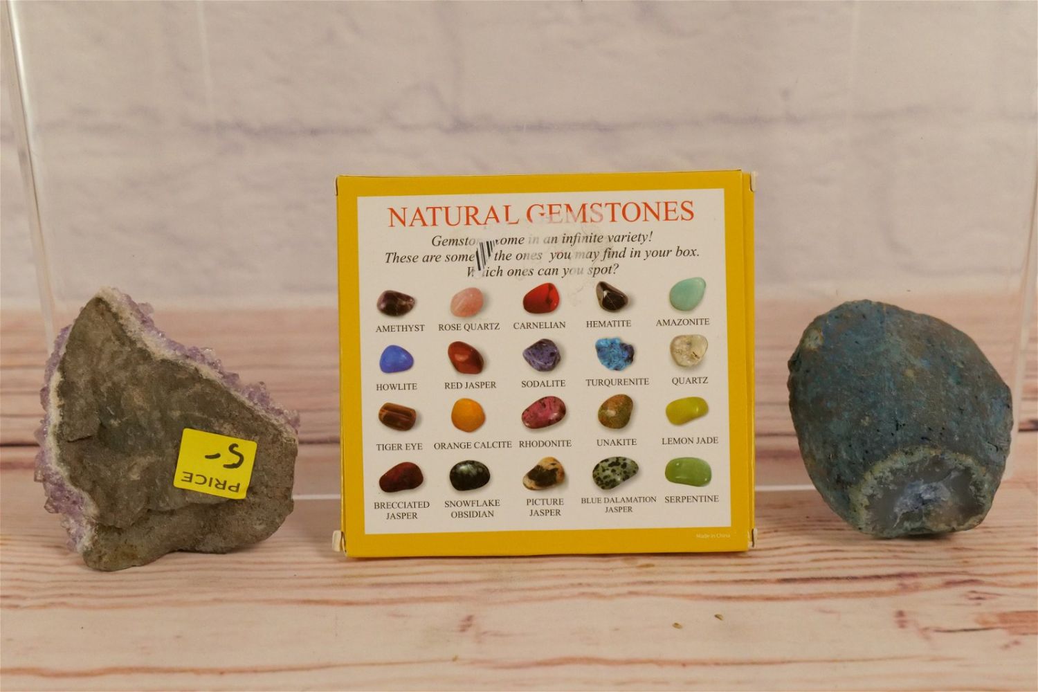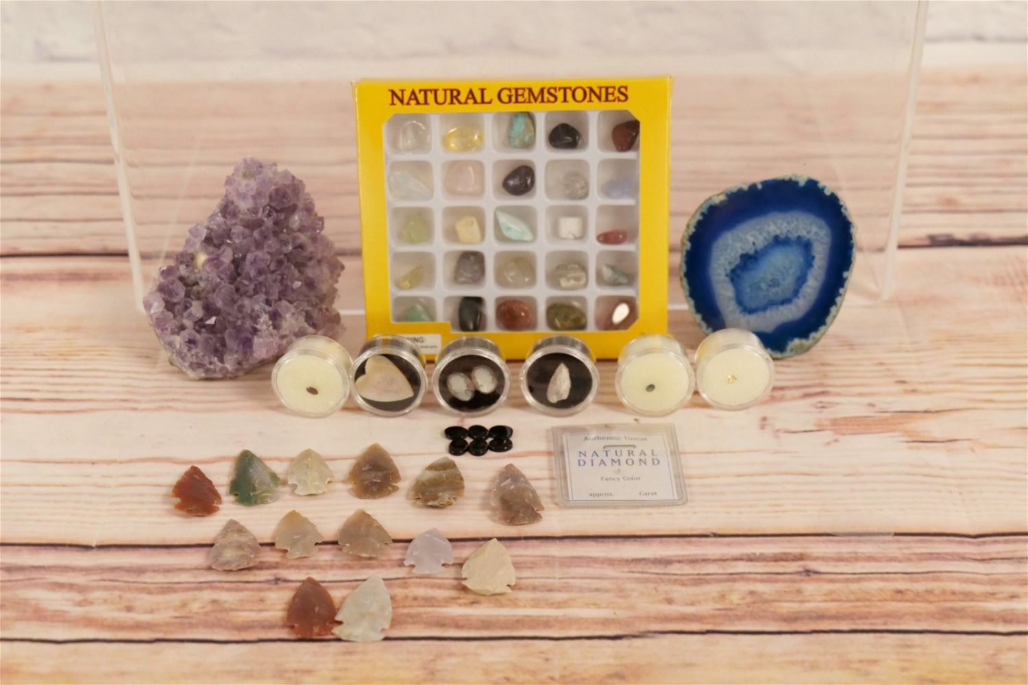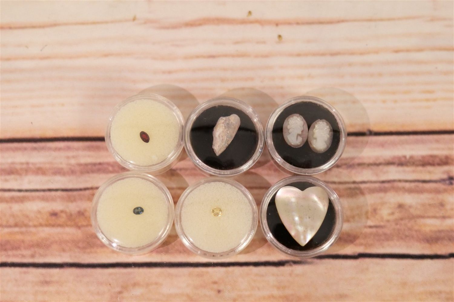 Mixed Gemstone Lot including Several Oval Black Onyx Cabochons, 2-3mm Natural Diamond with light yellow body color, Piece of Amethyst Geode, 1/2 Dyed Blue Banded Agate, Mixed Lot of Arrow Heads, Mix of Faceted Garnets and Possible Sapphire, and Citrine, Opal Rough, Polished Mother of Pearl Heart, Pair of Possibly Vintage Abalone/Mother of Pearl Cameos (Earrings) and Box Set of Tumbled Natural Gemstones. All invoices must be paid within 24 hours of the sale. We offer multiple shipping options besides the Liveauctioneers Liveship quoted on this listing., We also offer Pick-Ups Friday, Saturday, and Monday immediately following the sale. BY APPOINTMENT ONLY.