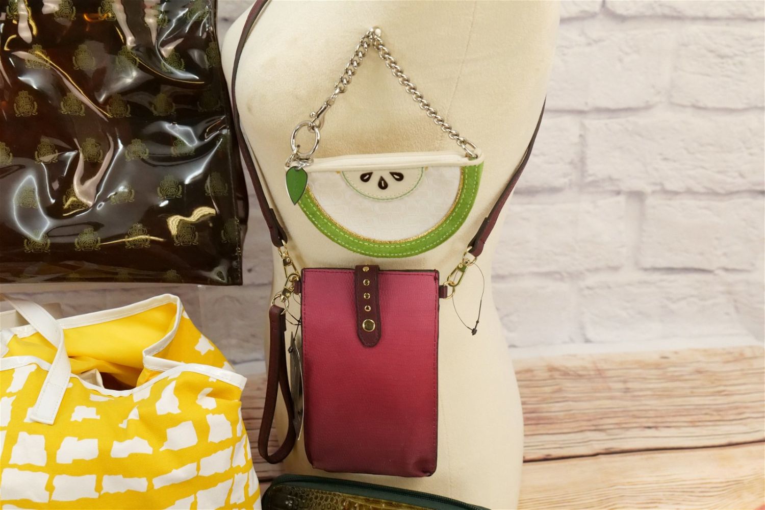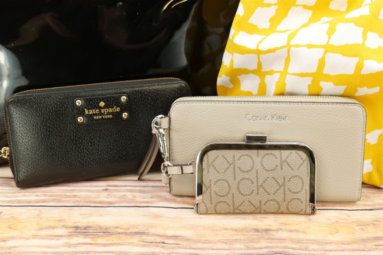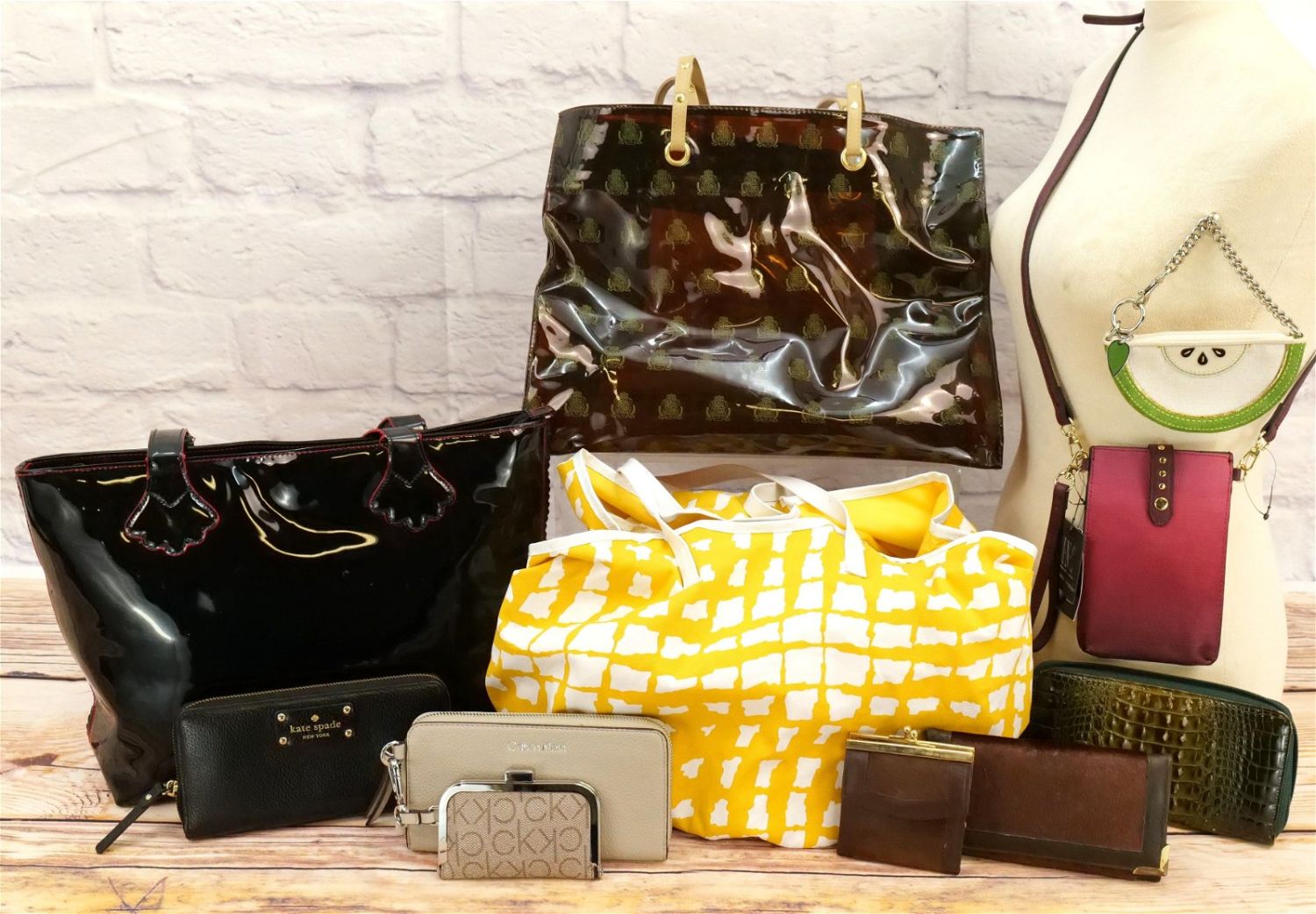 Lot of Ladies Handbags and Wallets including Saks 5th Avenue Yellow Scrunch Bag, Pleather Stephanie Johnson for Saks 5th Avenue Bag, Amber Colored Clear Bag, Kate Spade Wallet, Coin Purses and More. All invoices must be paid within 24 hours of the sale. We offer multiple shipping options besides the Liveauctioneers Liveship quoted on this listing., We also offer Pick-Ups Friday, Saturday, and Monday immediately following the sale. BY APPOINTMENT ONLY.