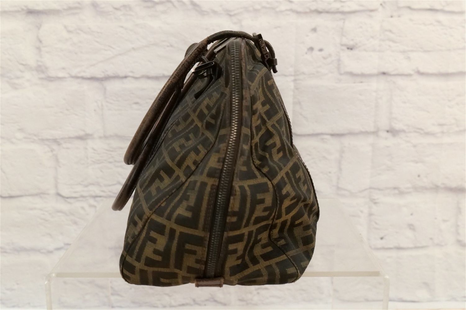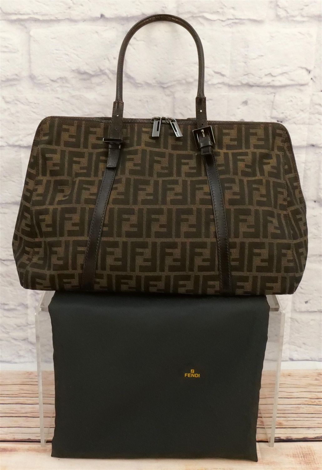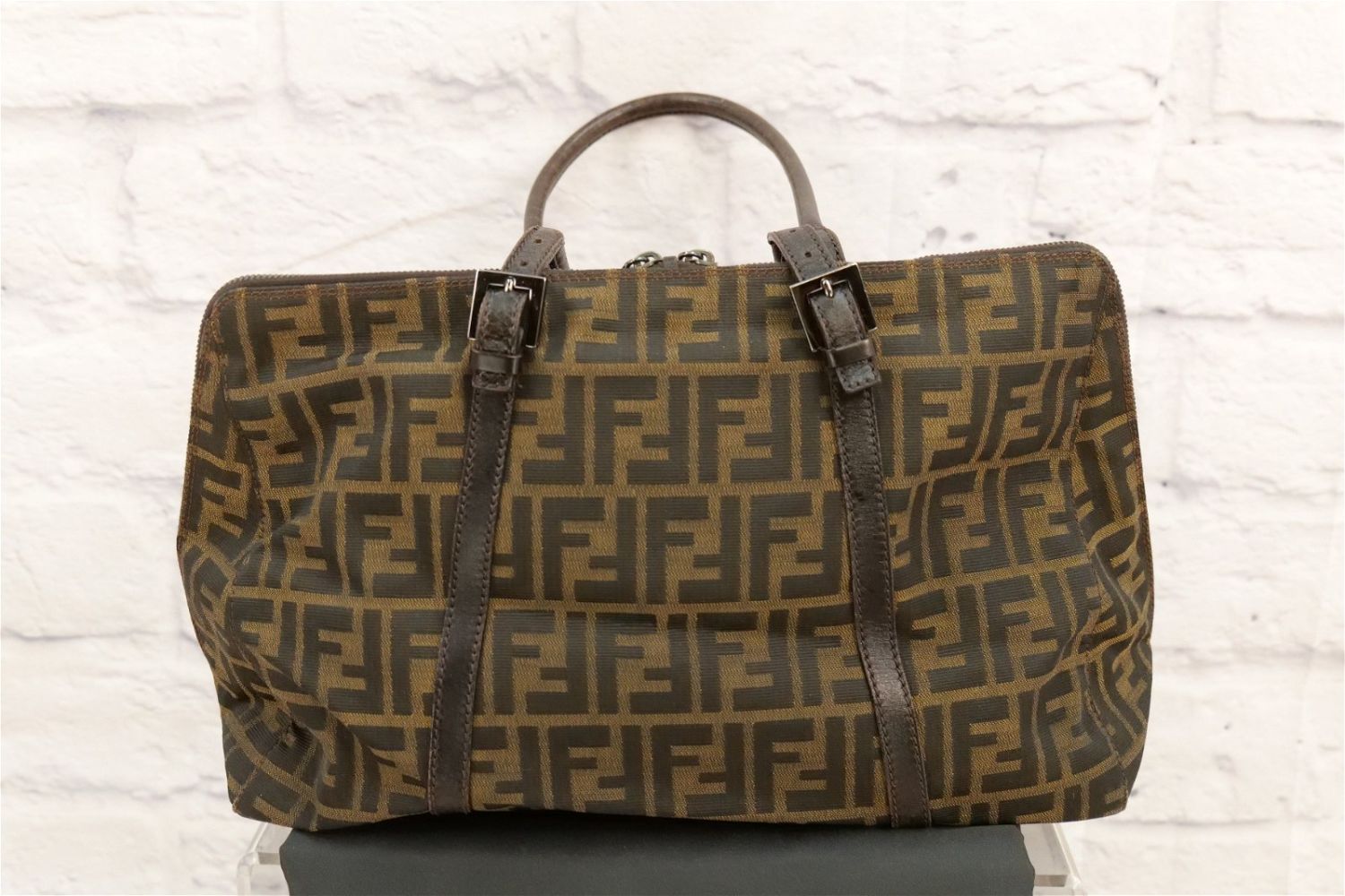 Fendi Pocketbook – Leather and Cloth Monogram. Has double zipper and inside logo. Has brown cloth Fendi lining. Shows signs of wear to inside top lining and exterior leather. Stitching has come loose where handle meets buckle. Comes with dust bag. Measures 17" wide x 10" tall. All invoices must be paid within 24 hours of the sale. We offer multiple shipping options besides the Liveauctioneers Liveship quoted on this listing., We also offer Pick-Ups Friday, Saturday, and Monday immediately following the sale. BY APPOINTMENT ONLY.