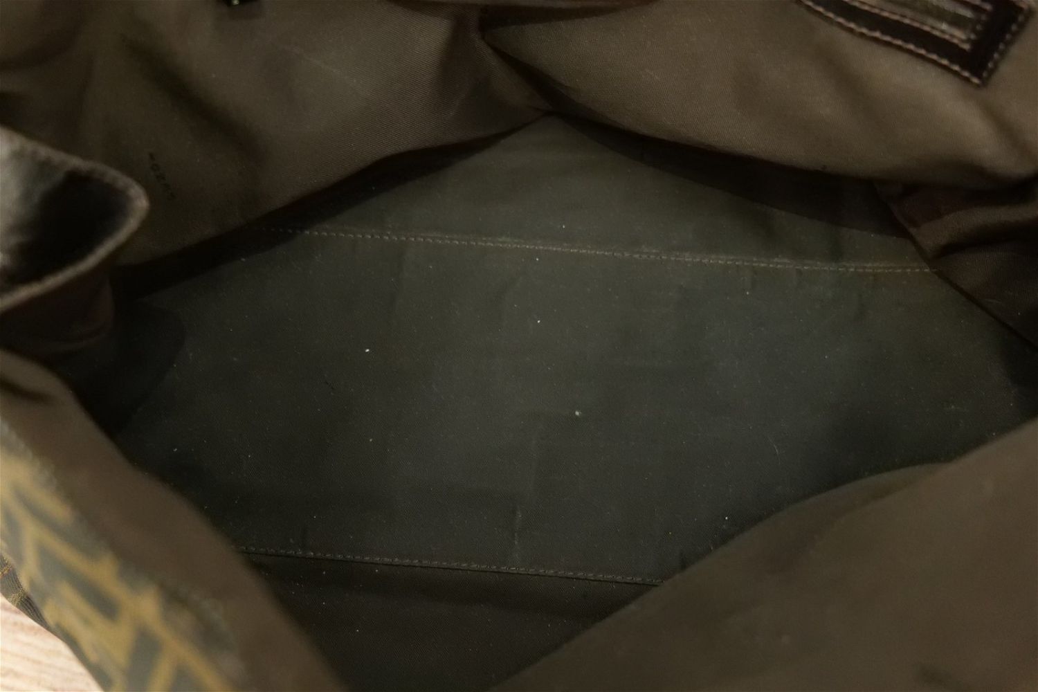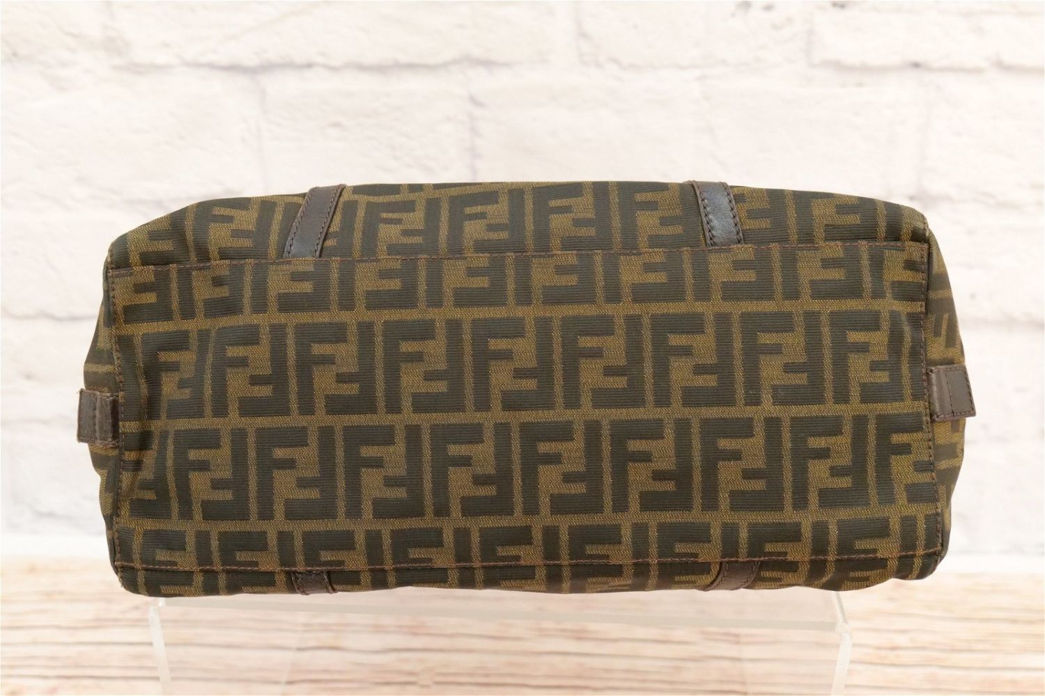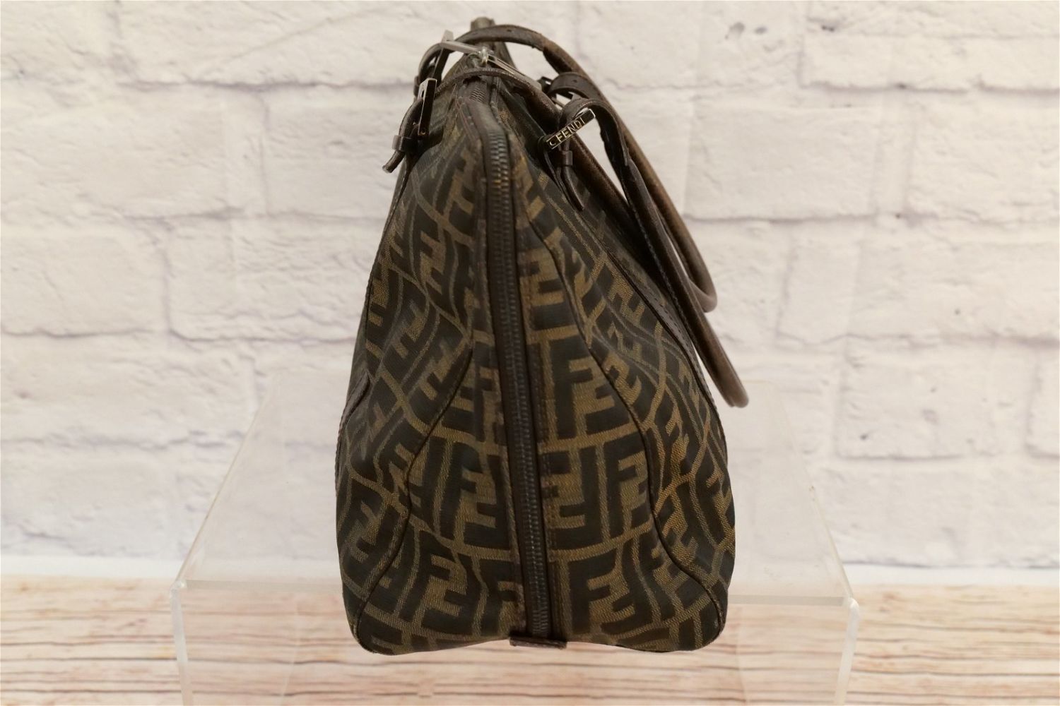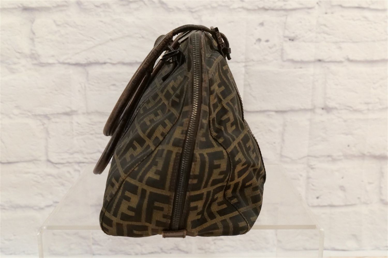 Fendi Pocketbook – Leather and Cloth Monogram. Has double zipper and inside logo. Has brown cloth Fendi lining. Shows signs of wear to inside top lining and exterior leather. Stitching has come loose where handle meets buckle. Comes with dust bag. Measures 17" wide x 10" tall. All invoices must be paid within 24 hours of the sale. We offer multiple shipping options besides the Liveauctioneers Liveship quoted on this listing., We also offer Pick-Ups Friday, Saturday, and Monday immediately following the sale. BY APPOINTMENT ONLY.
