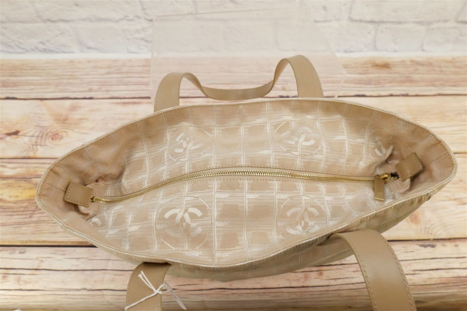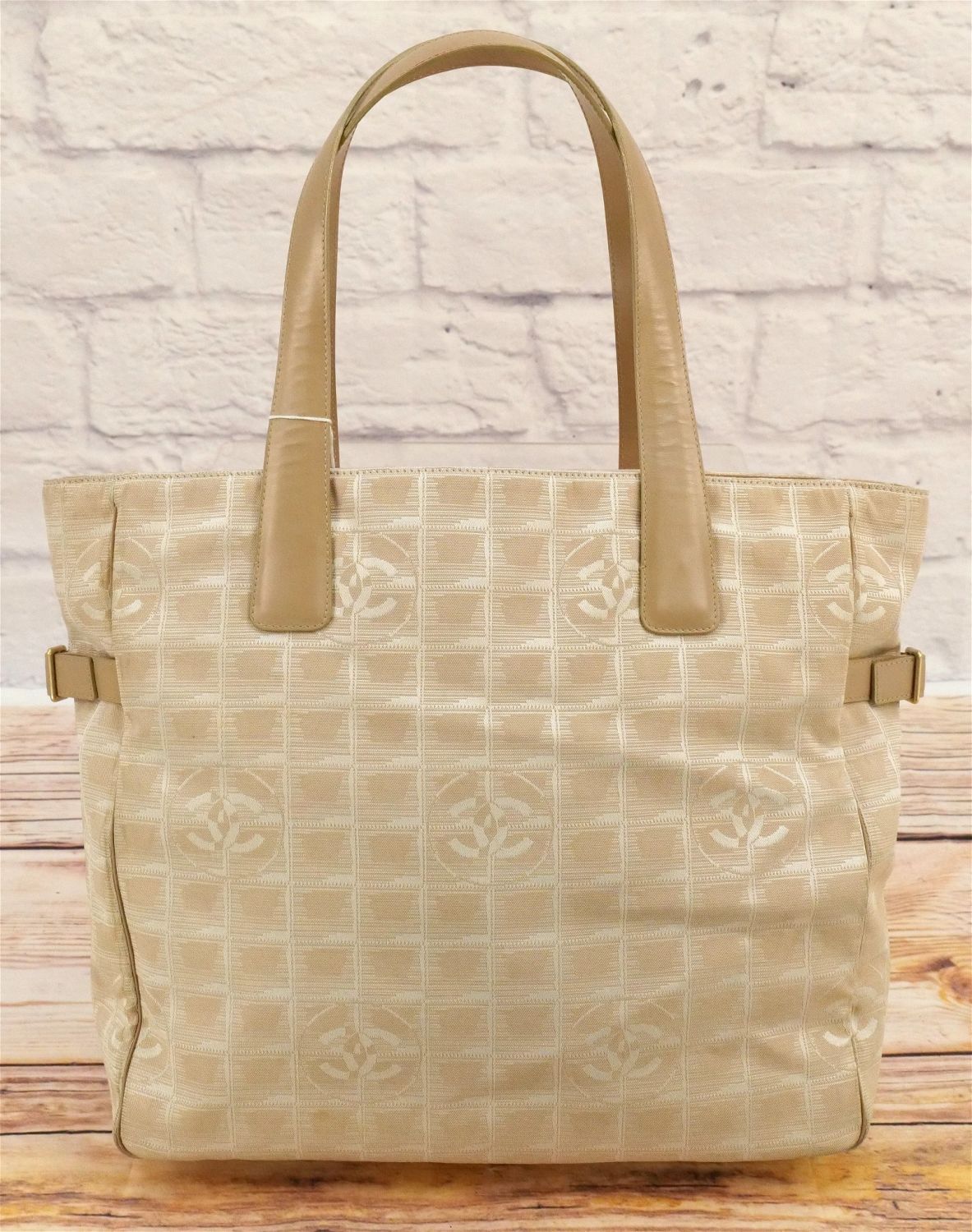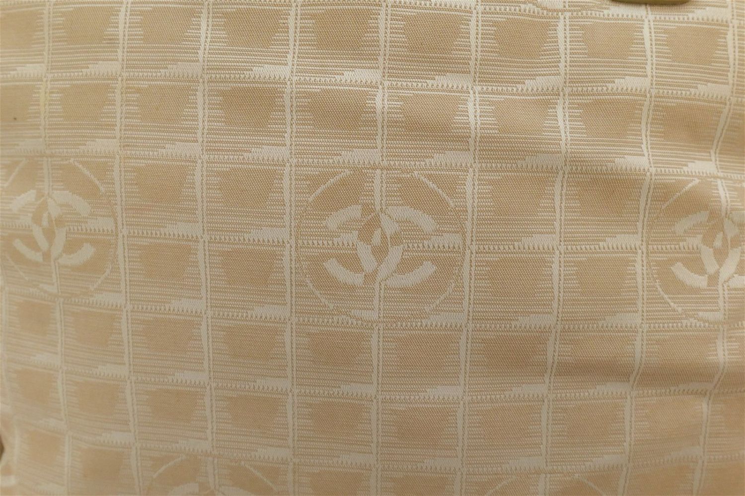 Cloth and Leather Chanel Bag. Oversized. Cream Toned with Stitched Chanel Logo on the outside. Has inside label with Lampo zippers. Has proper serial number tag – 8630932. Has some discoloration to lining around inside zipper, pen marks near outer zipper, and many small stains to the outer shell. Comes with dust bag. Measures 17" wide x 13" tall. All invoices must be paid within 24 hours of the sale. We offer multiple shipping options besides the Liveauctioneers Liveship quoted on this listing., We also offer Pick-Ups Friday, Saturday, and Monday immediately following the sale. BY APPOINTMENT ONLY.