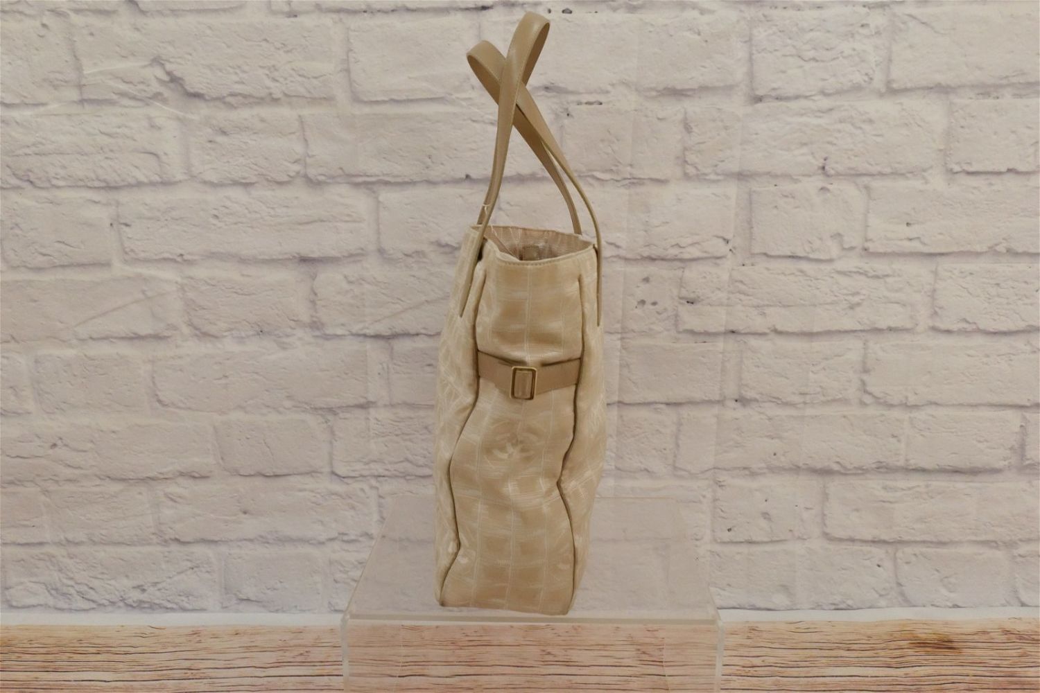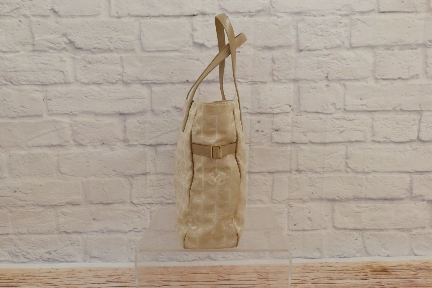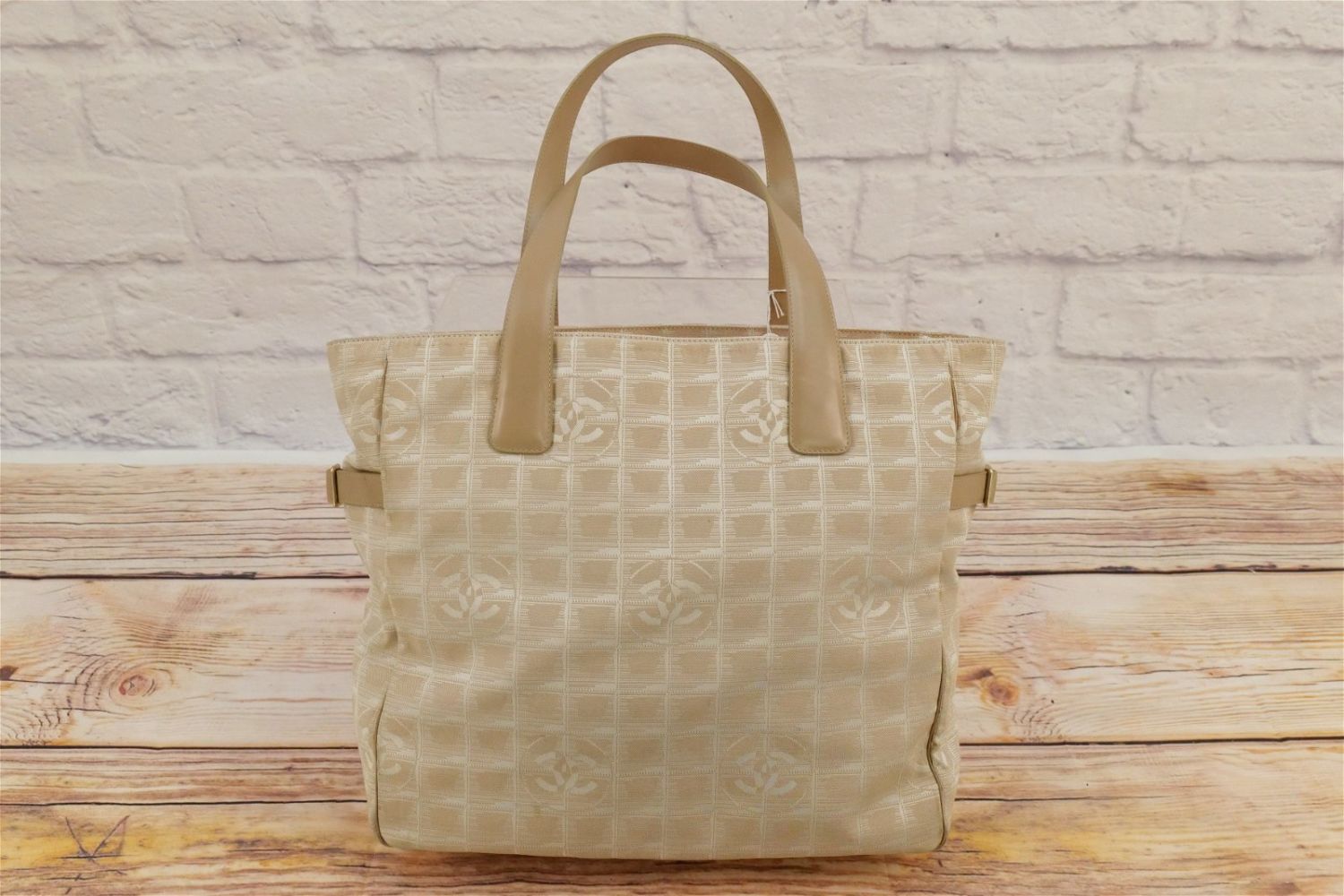 Cloth and Leather Chanel Bag. Oversized. Cream Toned with Stitched Chanel Logo on the outside. Has inside label with Lampo zippers. Has proper serial number tag – 8630932. Has some discoloration to lining around inside zipper, pen marks near outer zipper, and many small stains to the outer shell. Comes with dust bag. Measures 17" wide x 13" tall. All invoices must be paid within 24 hours of the sale. We offer multiple shipping options besides the Liveauctioneers Liveship quoted on this listing., We also offer Pick-Ups Friday, Saturday, and Monday immediately following the sale. BY APPOINTMENT ONLY.