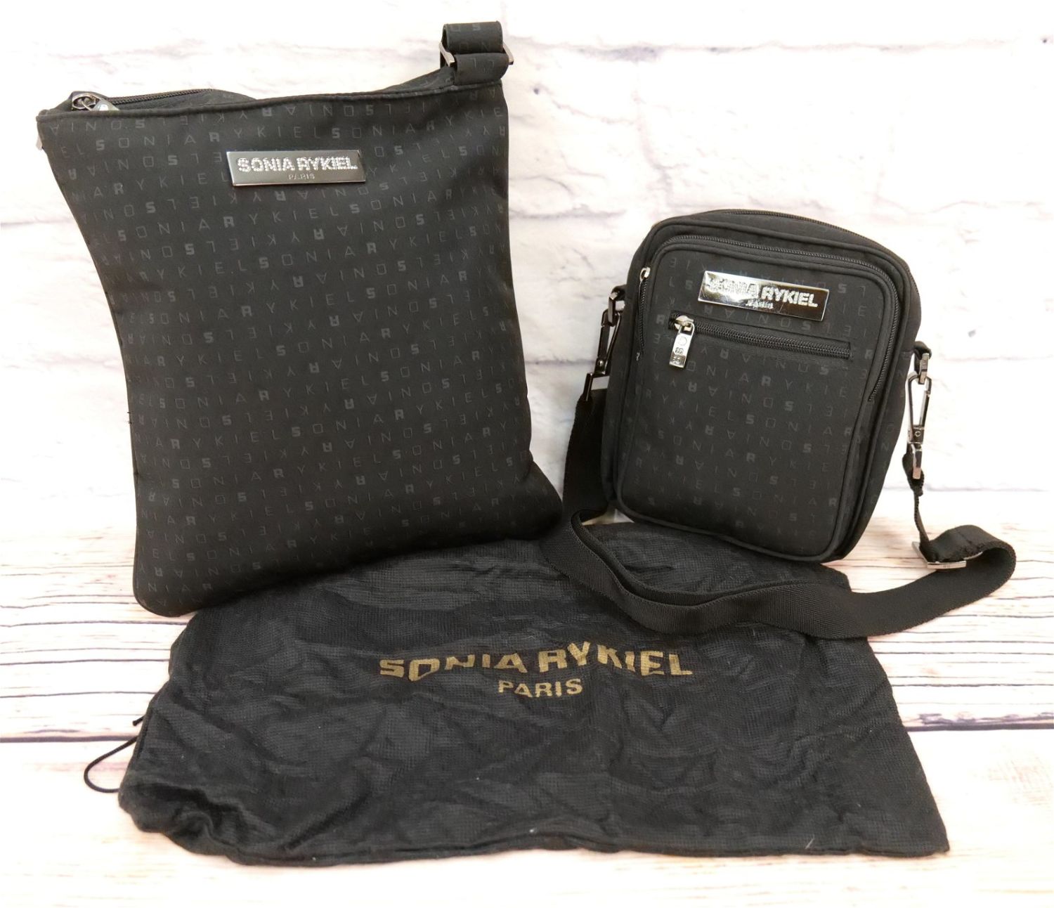 Lot of 2 Sonia Rykiel Nylon Bags. Has label with rhinestones on the front. Including a 2 Pocket crossbody style bag and letter size cross body style. Smaller bag comes with dust bag. Both in excellent condition. All invoices must be paid within 24 hours of the sale. We offer multiple shipping options besides the Liveauctioneers Liveship quoted on this listing., We also offer Pick-Ups Friday, Saturday, and Monday immediately following the sale. BY APPOINTMENT ONLY.