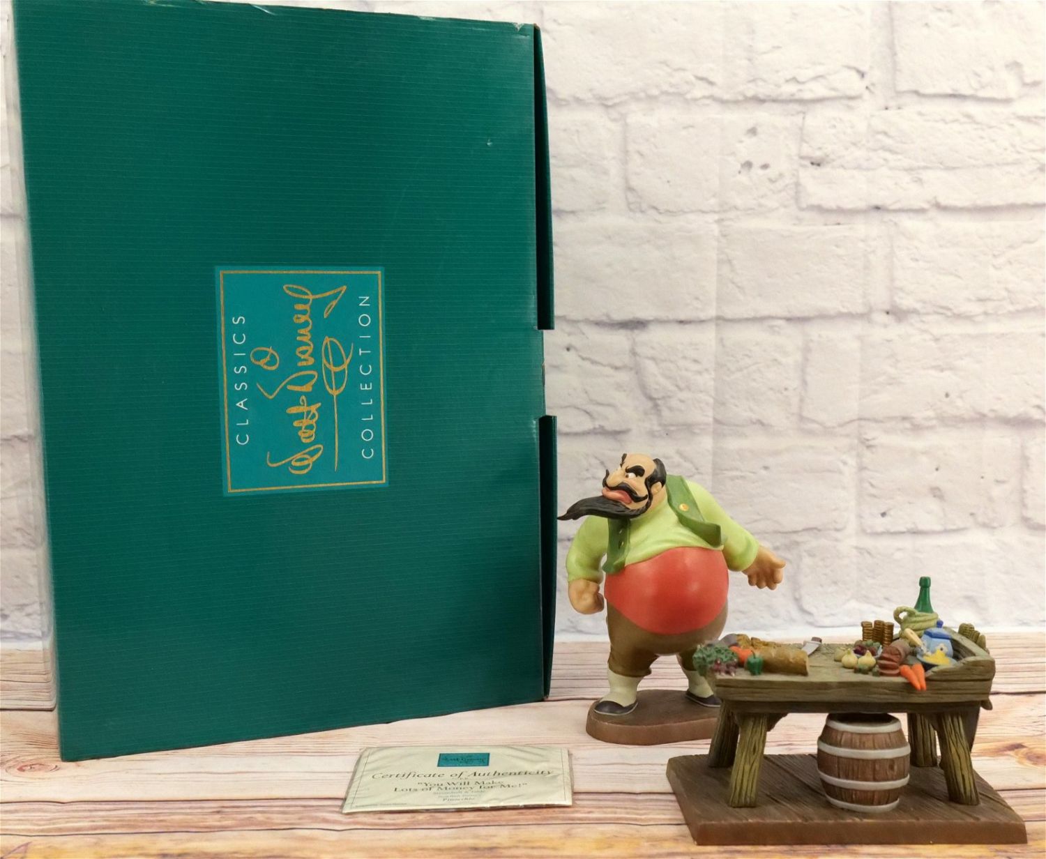 WDCC Walt Disney Classics Collection "You Will Make Lots of Money for Me" Stromboli & Table from Pinocchio – Dealer Display. Some craze present on the lighter colored paint. Artist Signed on bottom by Dusty Horner. Measures 8.25" tall. Comes with box and COA. All invoices must be paid within 24 hours of the sale. We offer multiple shipping options, We also offer Pick-Ups Thursday, Friday, Saturday, and Monday immediately following the sale. BY APPOINTMENT ONLY.