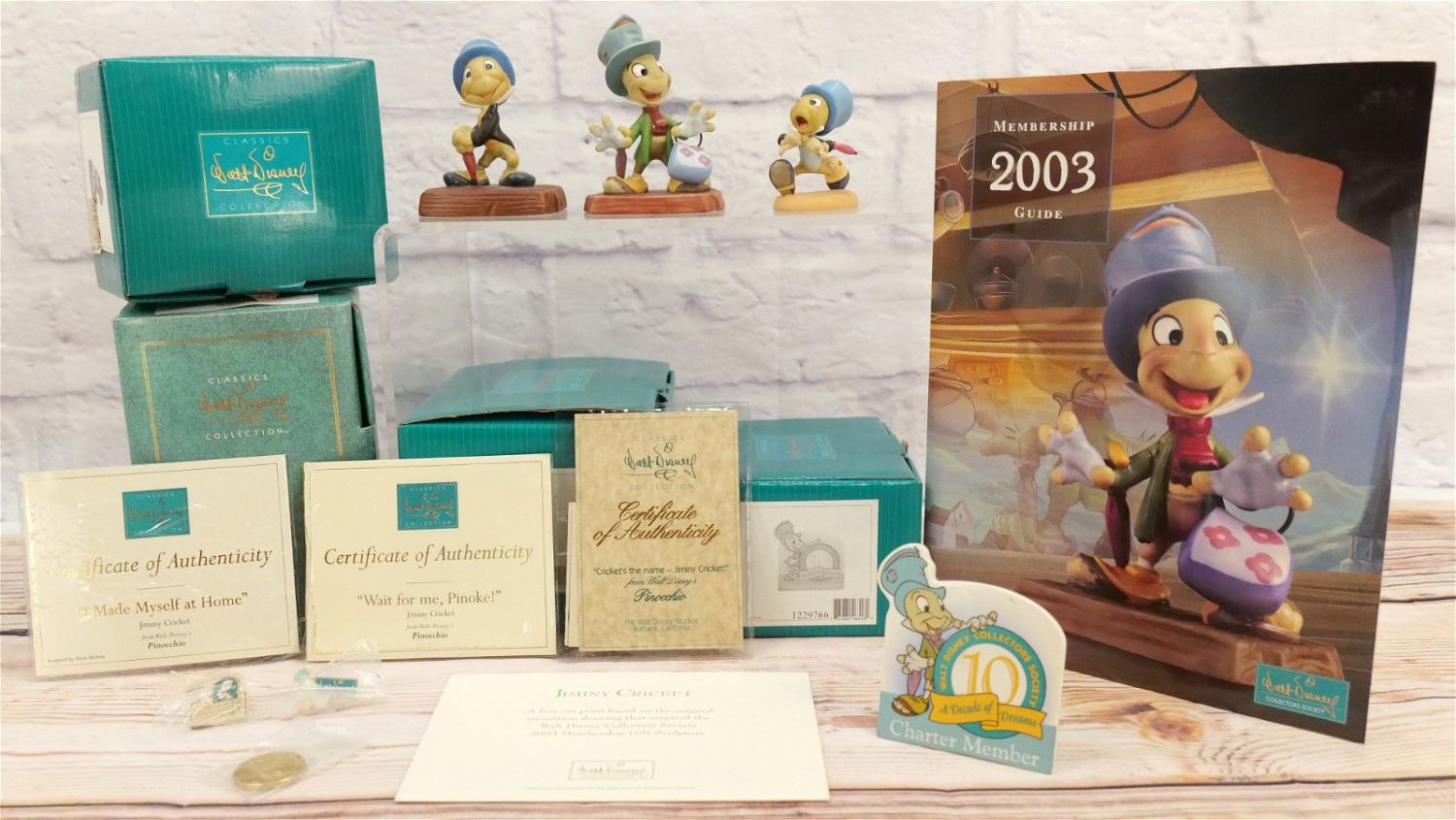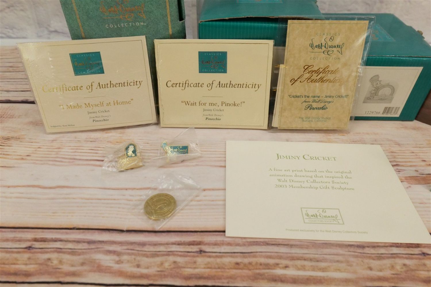 Lot of 4 WDCC Walt Disney Classics Collection Jiminy Cricket Figurines including "Wait for me, Pinoke", "I Made Myself a Home", "Cricket’s the Name – Jiminy Cricket", and "Charter Member Plaque. Comes with 2 Jiminy Cricket Pins, Art Print, and Coin. The Charter Plaque has craze present. Largest measures 4.75" tall. All come with the boxes and COA’s except for the Charter Plaque which is missing the COA. All invoices must be paid within 24 hours of the sale. We offer multiple shipping options, We also offer Pick-Ups Thursday, Friday, Saturday, and Monday immediately following the sale. BY APPOINTMENT ONLY.