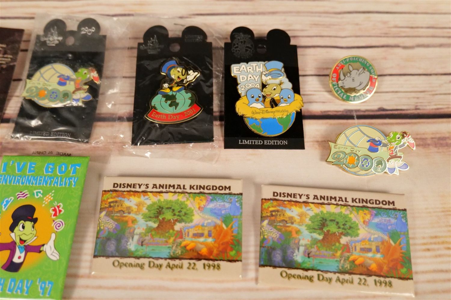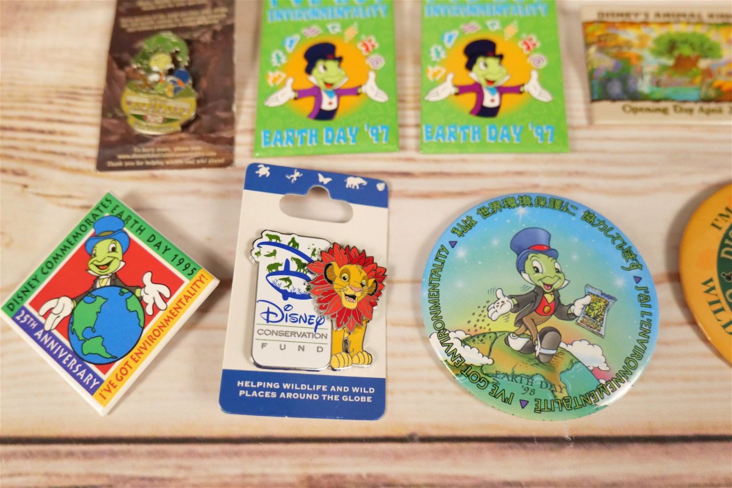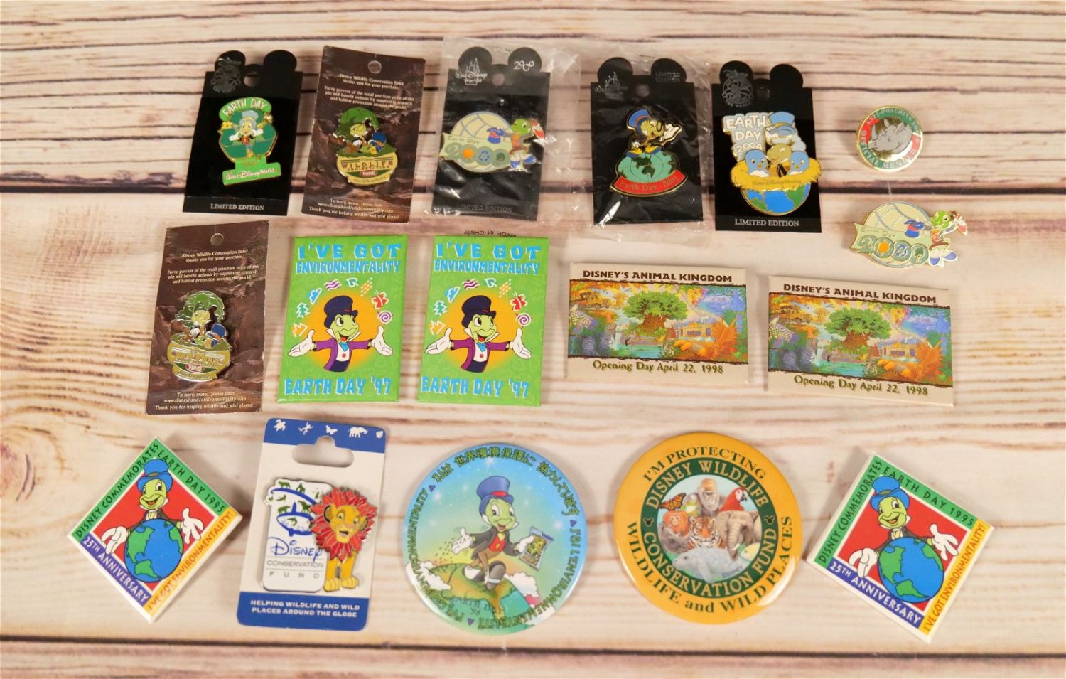 Lot of 17 Disney Environmental and Animal Kingdom Pins and Pinback Buttons including Earth Day, Wildlife Fund, Conservation Fund, Disney Animal Kingdom Opening Day, and Anti-Poaching. Various Characters featured include many Jiminy Cricket and Simba. Some are Limited Editions. 7 come on card backs. One pin is missing the pinback. All invoices must be paid within 24 hours of the sale. We offer multiple shipping options besides the Liveauctioneers Liveship quoted on this listing. We also offer Pick-Ups Thursday, Friday, Saturday, and Monday immediately following the sale. BY APPOINTMENT ONLY.