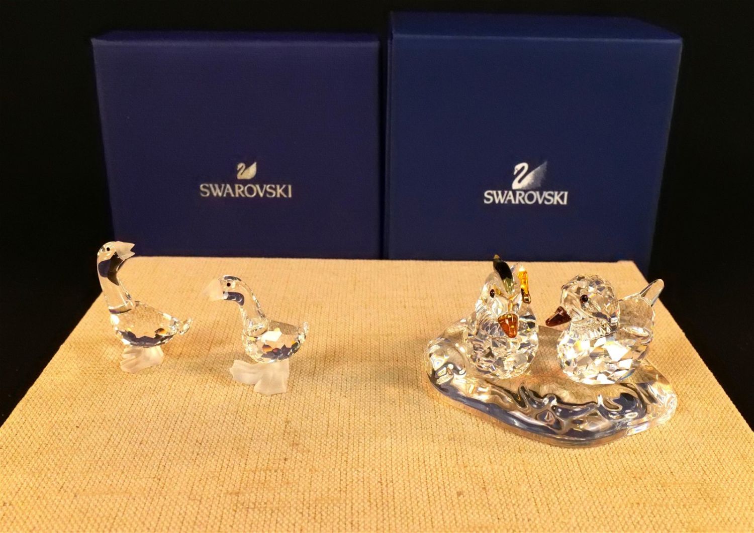 Grouping of Swarovski Bird Figurines including Mandarin Ducks #858736 in original box and Pair of Ducklings – Unsure if box is original to figures. Largest measures 2.25" tall x 3.25" on the pond base. All invoices must be paid within 24 hours of the sale. We offer multiple shipping options besides the Liveauctioneers Liveship quoted on this listing. We also offer Pick-Ups Thursday, Friday, Saturday, and Monday immediately following the sale. BY APPOINTMENT ONLY.