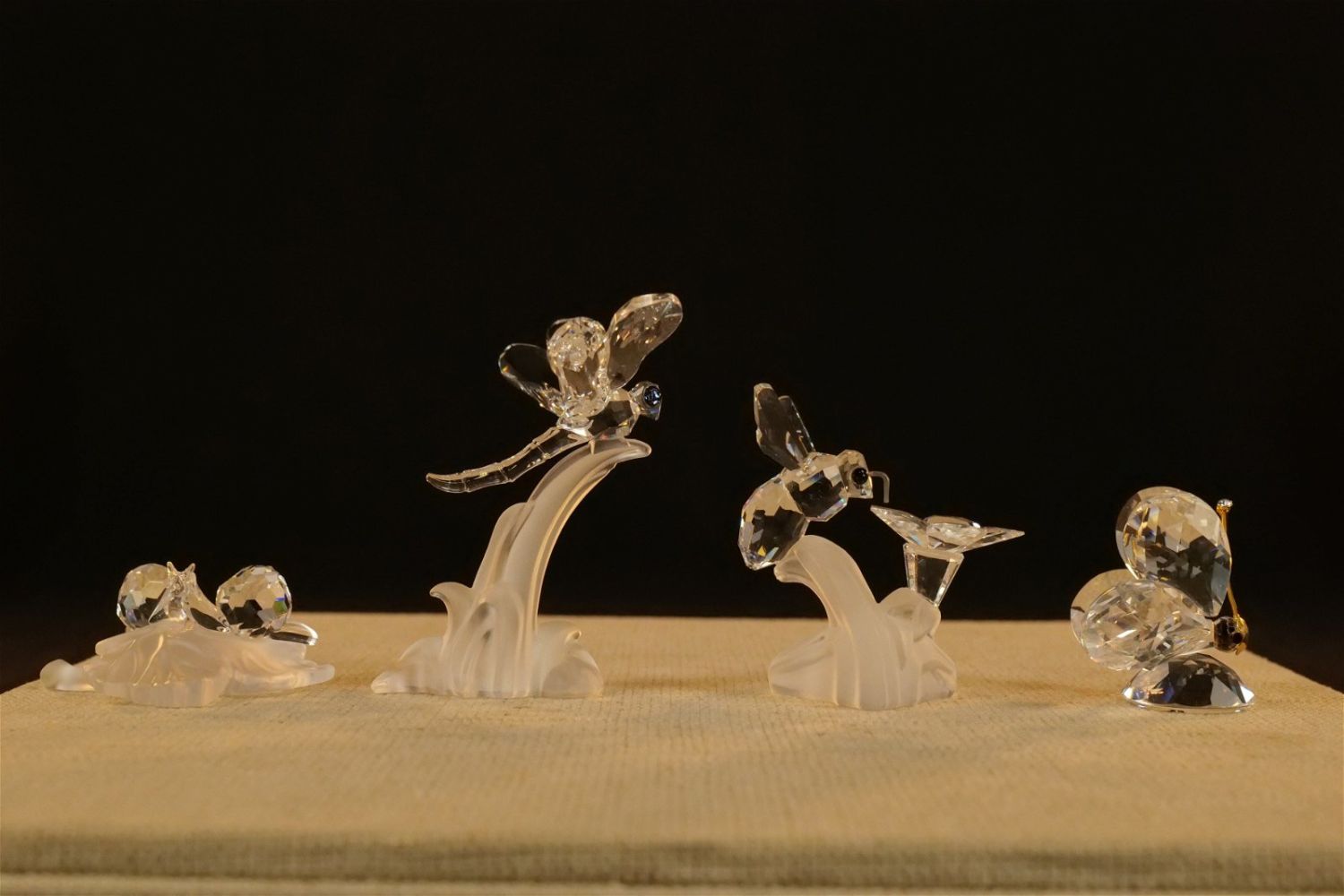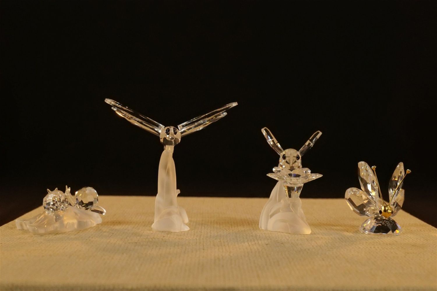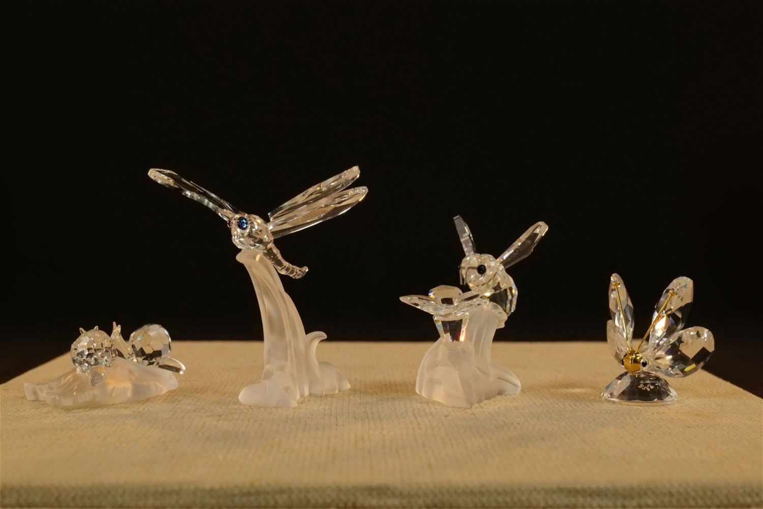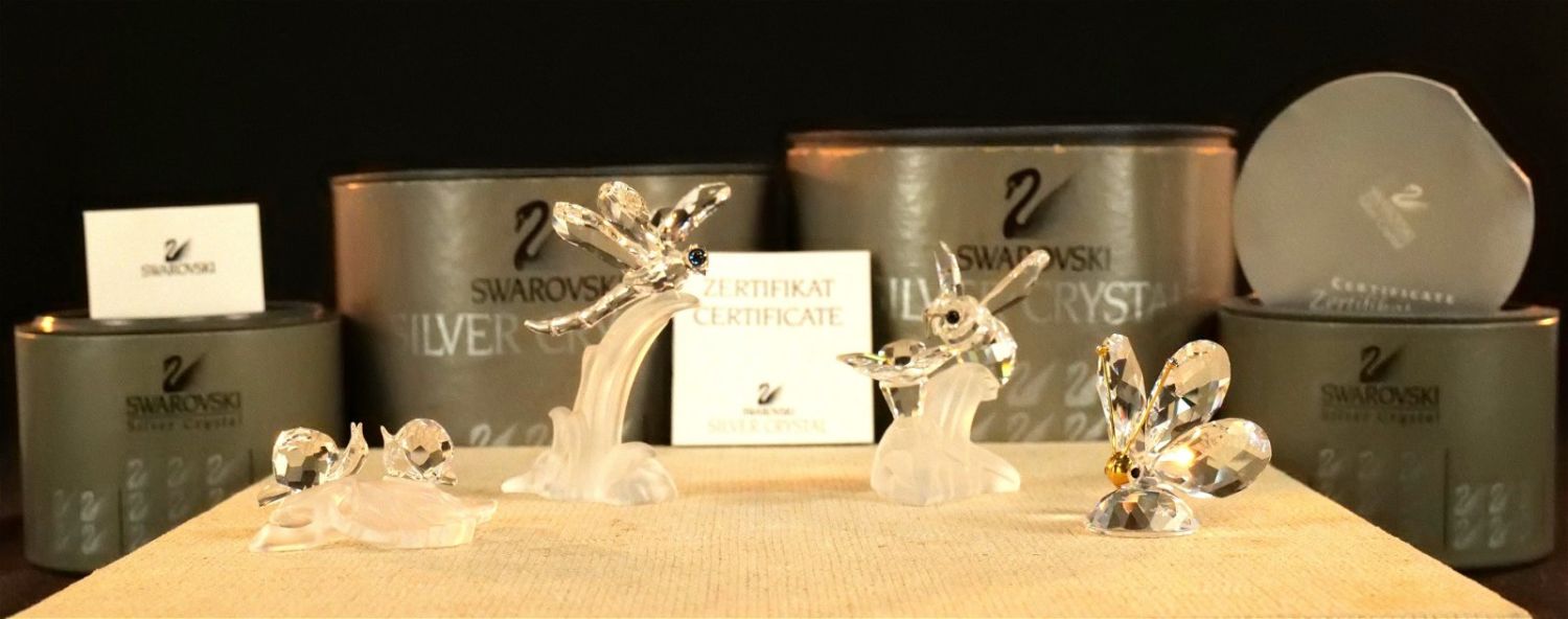 Lot of 4 Swarovski Crystal Figurines including Dragonfly on Frosted Branch #7615, Bumble Bee on Flower #166185 – Not with original box but comes with a box, Mini Butterfly #012774, and Baby Snails on Leaf #268196. Largest measures 2.5" tall x 2.5" wingspan. All except the bee comes with original boxes. All invoices must be paid within 24 hours of the sale. We offer multiple shipping options besides the Liveauctioneers Liveship quoted on this listing. We also offer Pick-Ups Thursday, Friday, Saturday, and Monday immediately following the sale. BY APPOINTMENT ONLY.