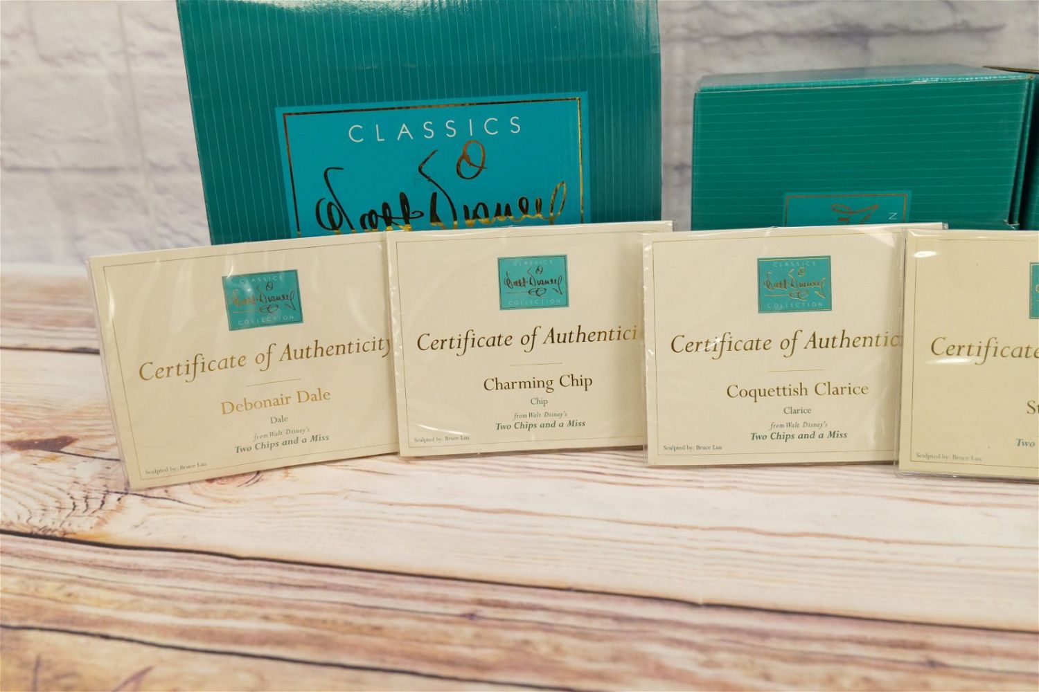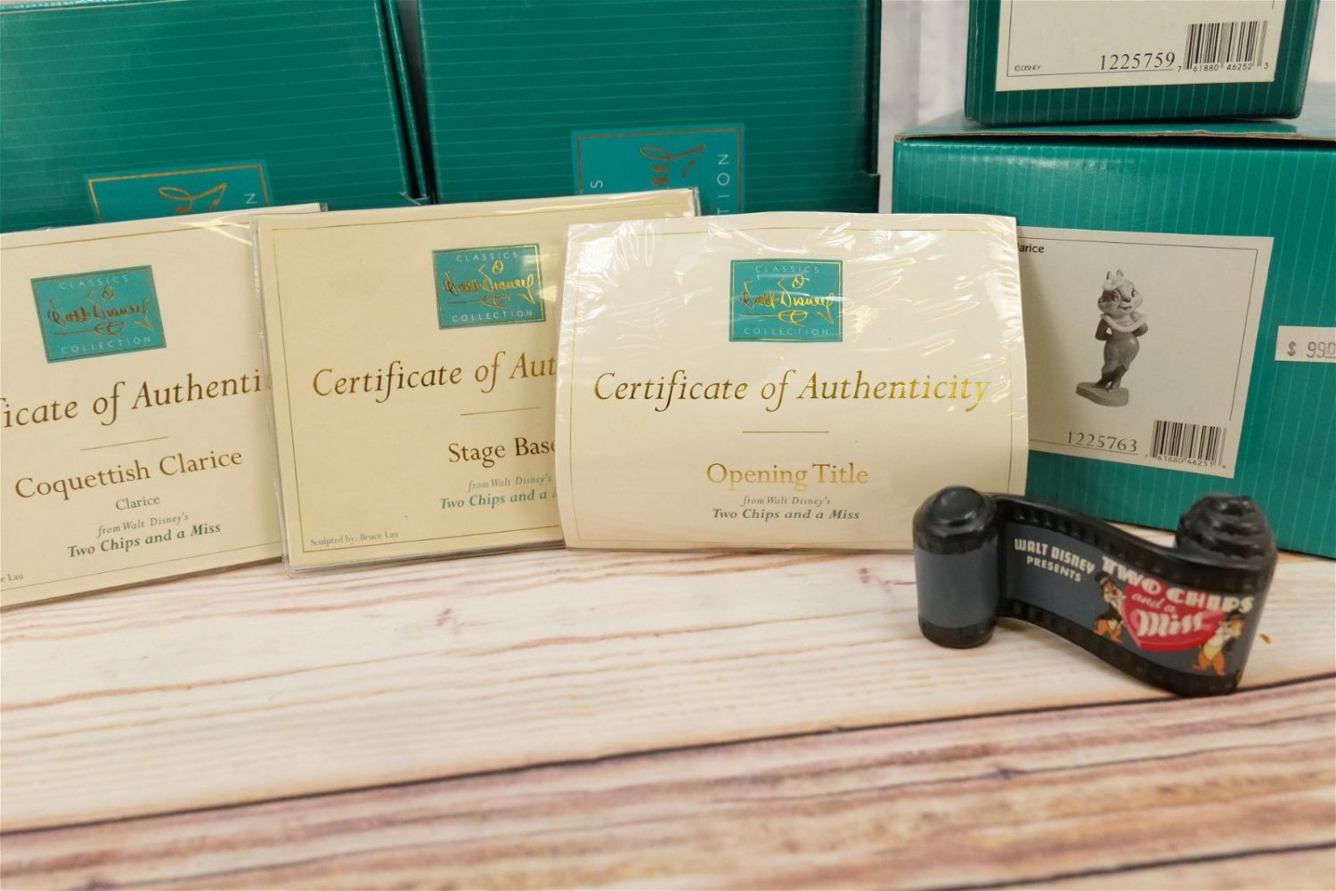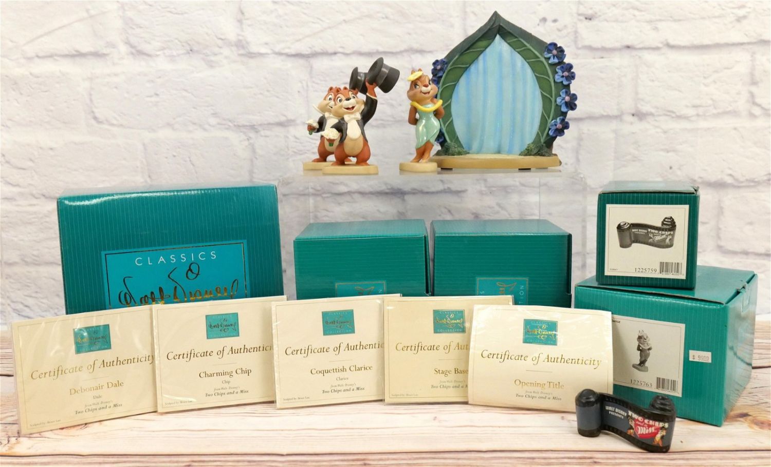 WDCC Walt Disney Classics Collection Two Chips and a Miss Figurine Set. Including "Opening Title", "Stage Base", "Coquettish Clarice", "Debonair Dale", and "Charming Chip". The base measures 7.75" tall. All come with the boxes and COA’s. All invoices must be paid within 24 hours of the sale. We offer multiple shipping options, We also offer Pick-Ups Thursday, Friday, Saturday, and Monday immediately following the sale. BY APPOINTMENT ONLY.