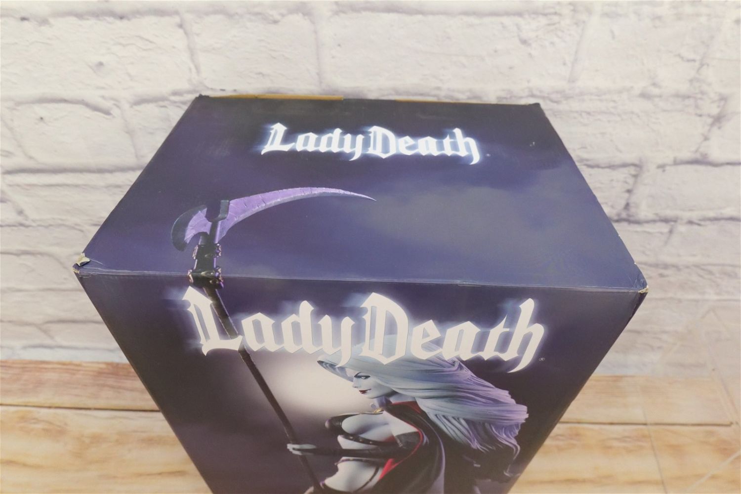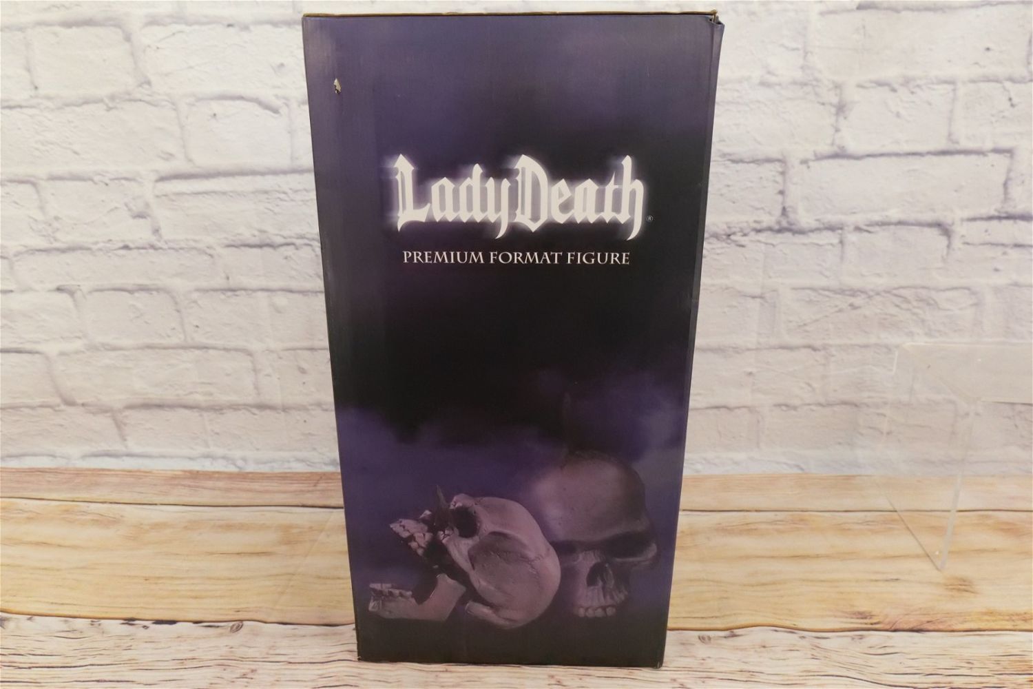 Sideshow Lady Death Premium Format Figure. Appears to be in New Condition inside box. The top back edge of the box does have some tearing and creasing. All invoices must be paid within 24 hours of the sale. We offer multiple shipping options besides the Liveauctioneers Liveship quoted on this listing. We also offer Pick-Ups Friday, Saturday, and Monday immediately following the sale. BY APPOINTMENT ONLY.
