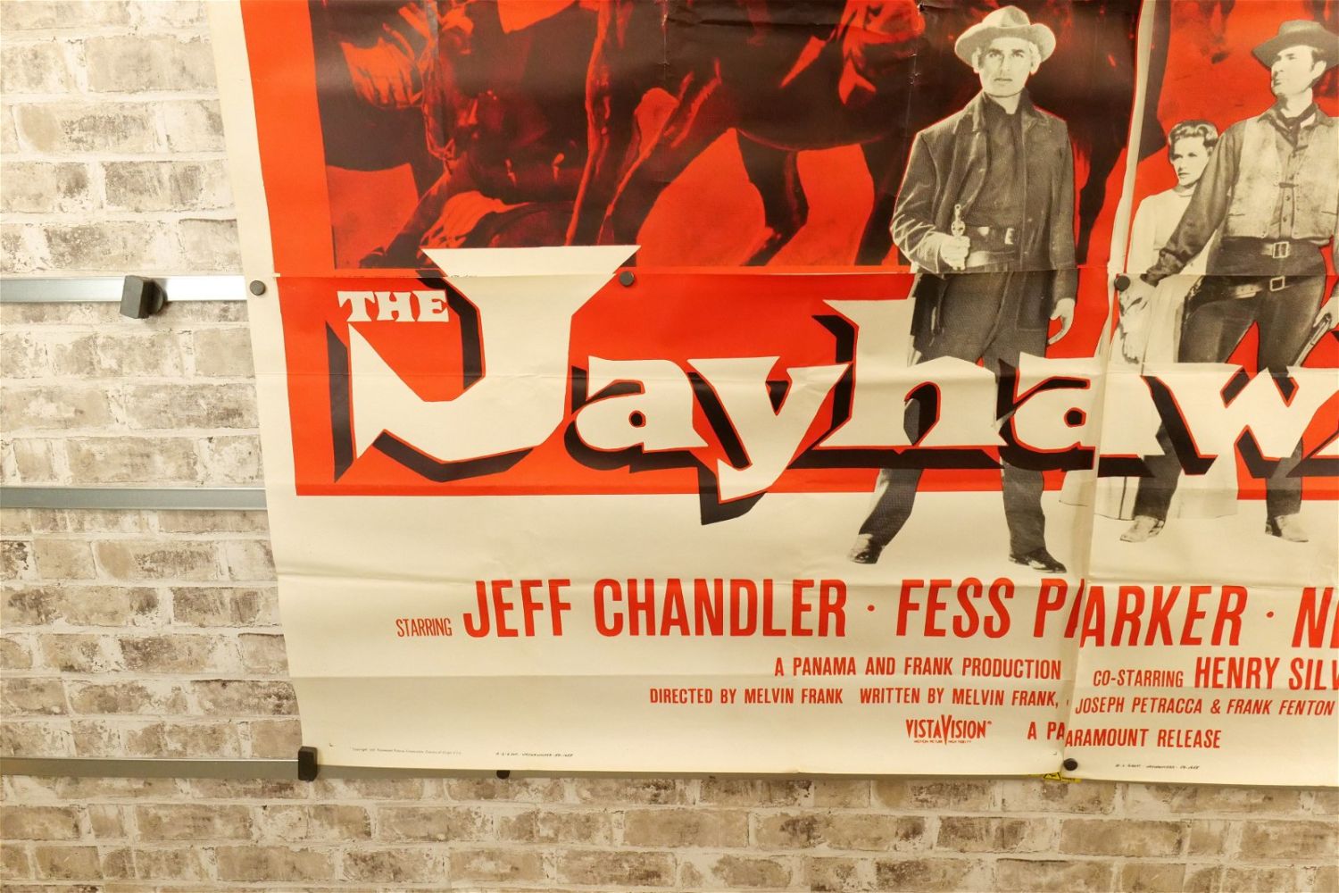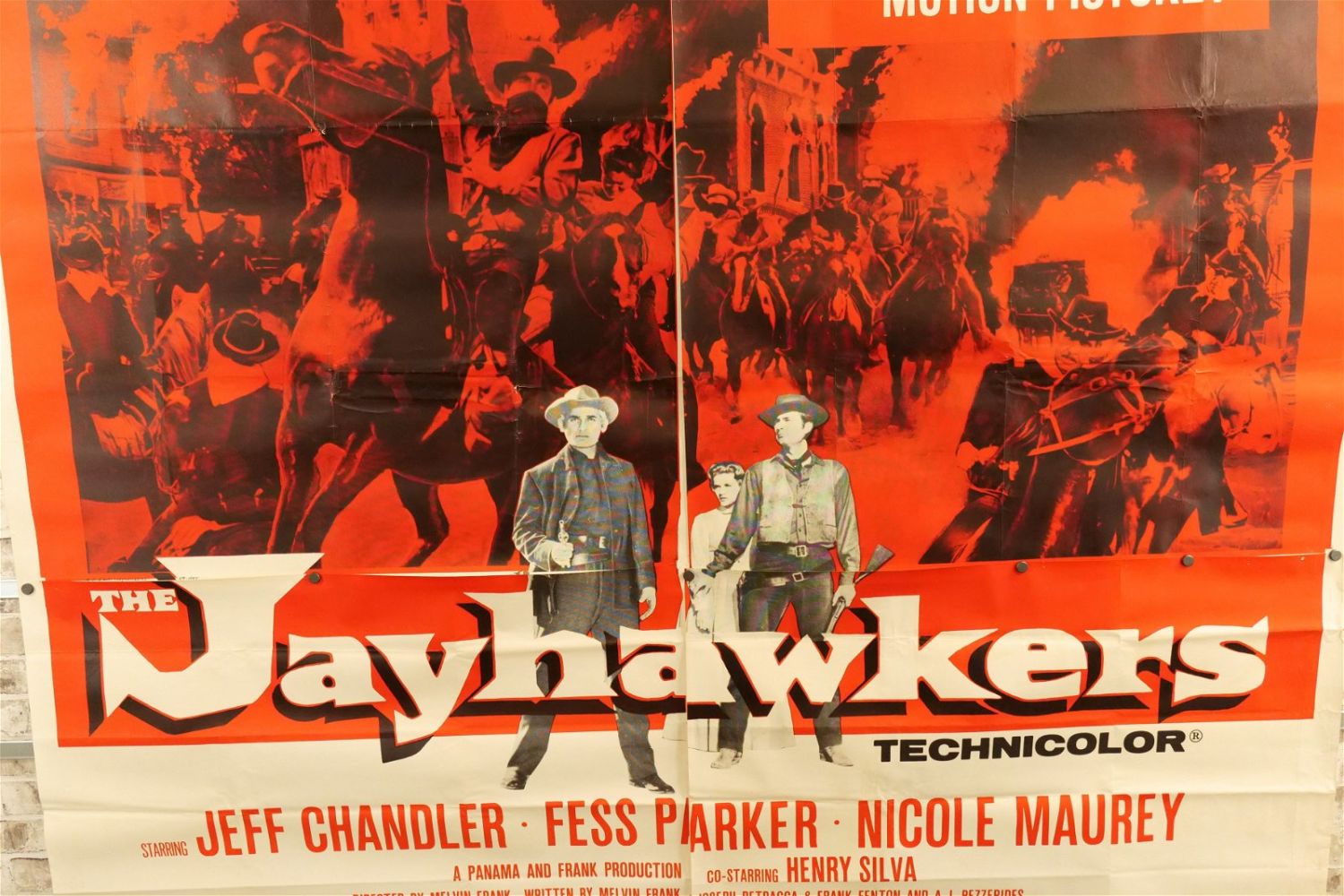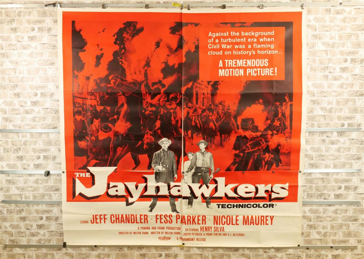 Jayhawkers 6 Sheet Movie Poster (1959) #59/321. Starring Jay Chandler and Fess Parker. Has some loss to paper at the bottom, crinkling, small tears, and small pinholes throughout from staples. Otherwise very good condition. Measures approx. 81" wide x 79.5" long. All have minor tearing and creasing unless noted in good condition. All invoices must be paid within 24 hours of the sale. We offer multiple shipping options please read the shipping terms for your options. We also offer Pick-Ups Thursday, Friday, Saturday, and Monday immediately following the sale. BY APPOINTMENT ONLY.