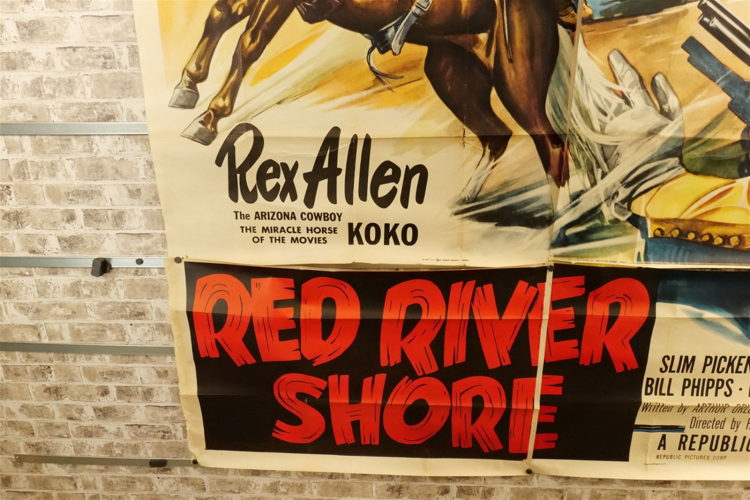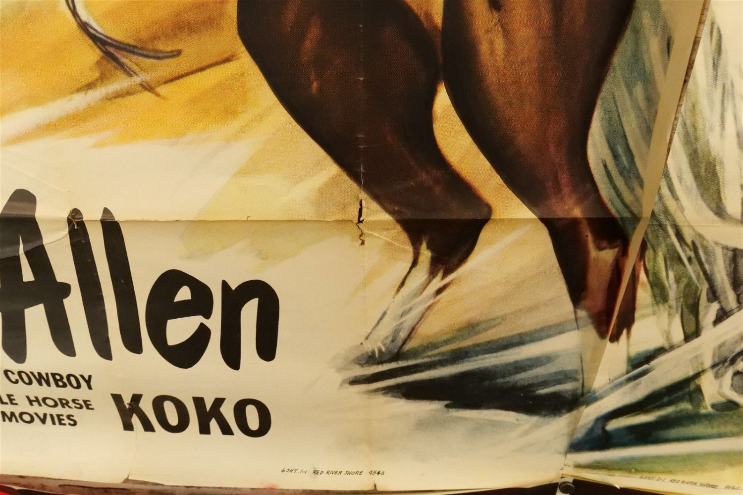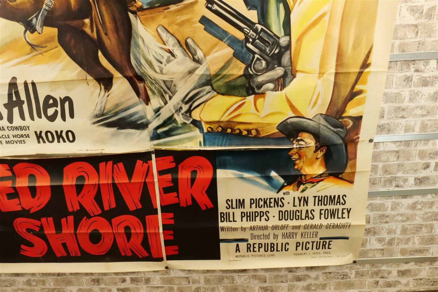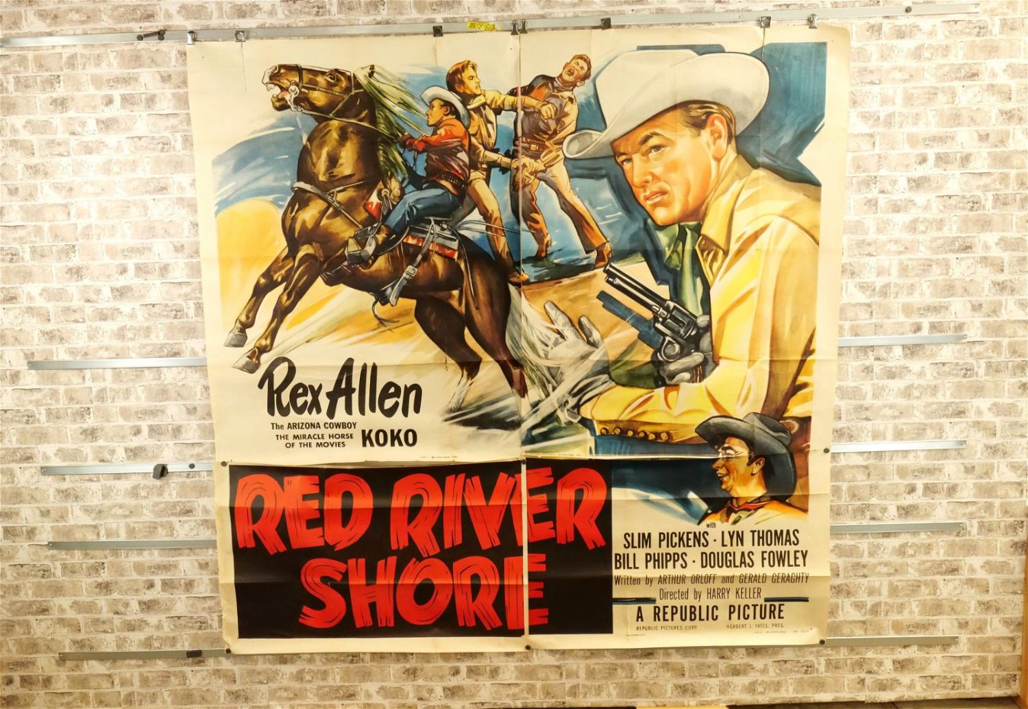 Red River Shore 6 Sheet Movie Poster (1953) #53/674 45411. Starring Rex Allen, Slim Pickens, and Lyn Thomas. Has tears and crinkling. Measures approx. 81" wide x 79.5" long. All have minor tearing and creasing unless noted in good condition. All invoices must be paid within 24 hours of the sale. We offer multiple shipping options please read the shipping terms for your options. We also offer Pick-Ups Thursday, Friday, Saturday, and Monday immediately following the sale. BY APPOINTMENT ONLY.