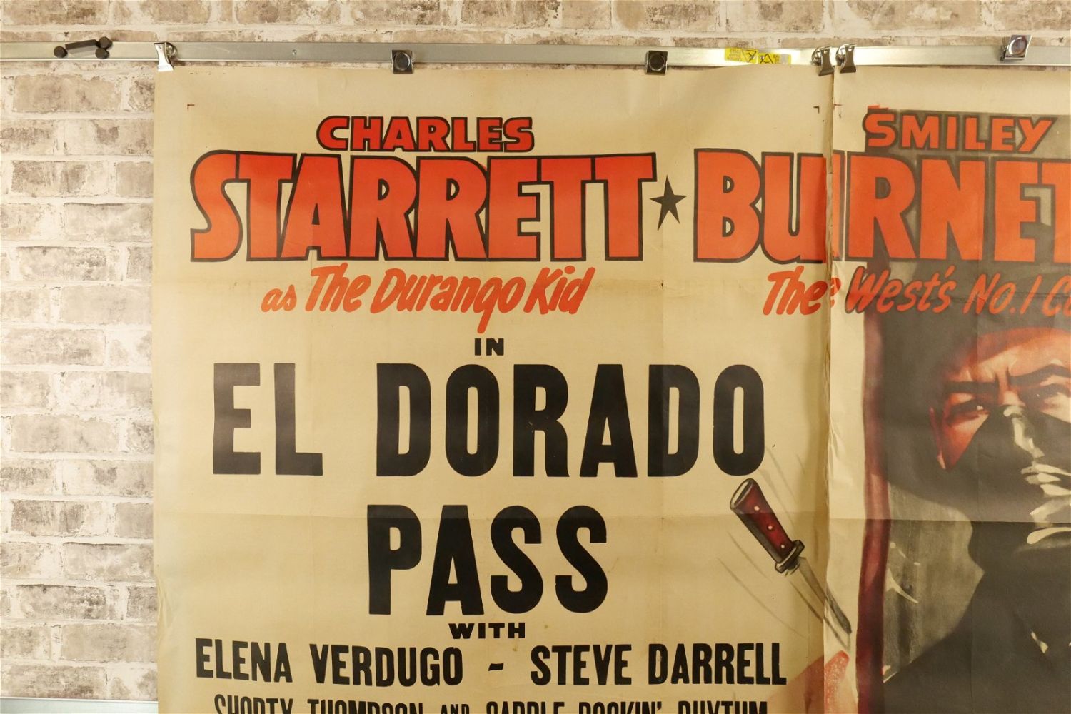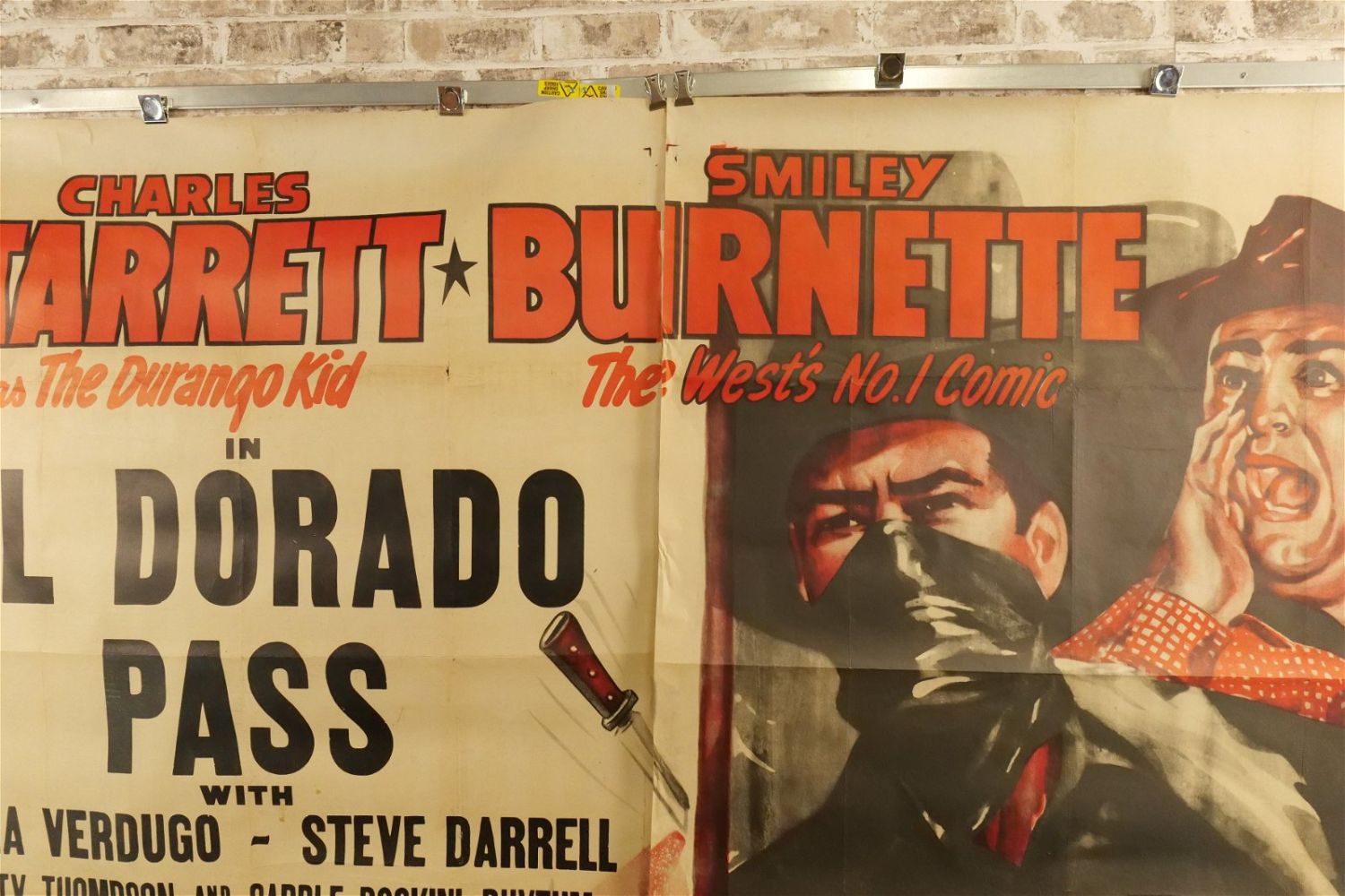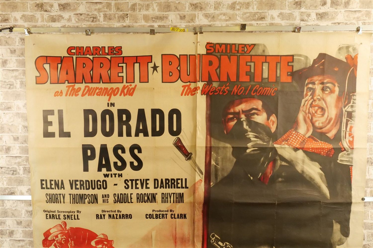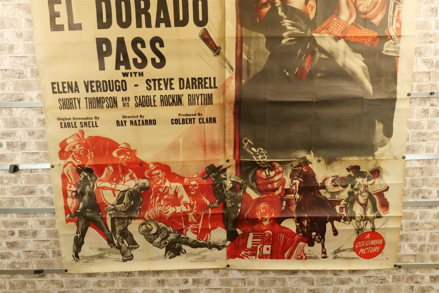 El Dorado Pass 6 Sheet Movie Poster (1948) #48/1395. Starring Elena Verdugo and Steve Darrell. Has loss to edges and tears at creases. Measures approx. 81" wide x 79.5" long. All have minor tearing and creasing unless noted in good condition. All invoices must be paid within 24 hours of the sale. We offer multiple shipping options please read the shipping terms for your options. We also offer Pick-Ups Thursday, Friday, Saturday, and Monday immediately following the sale. BY APPOINTMENT ONLY.
