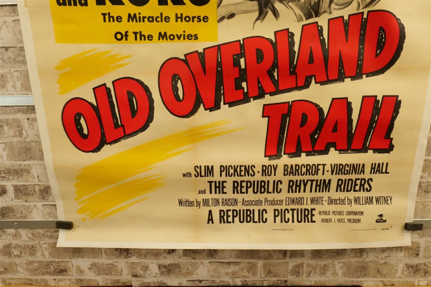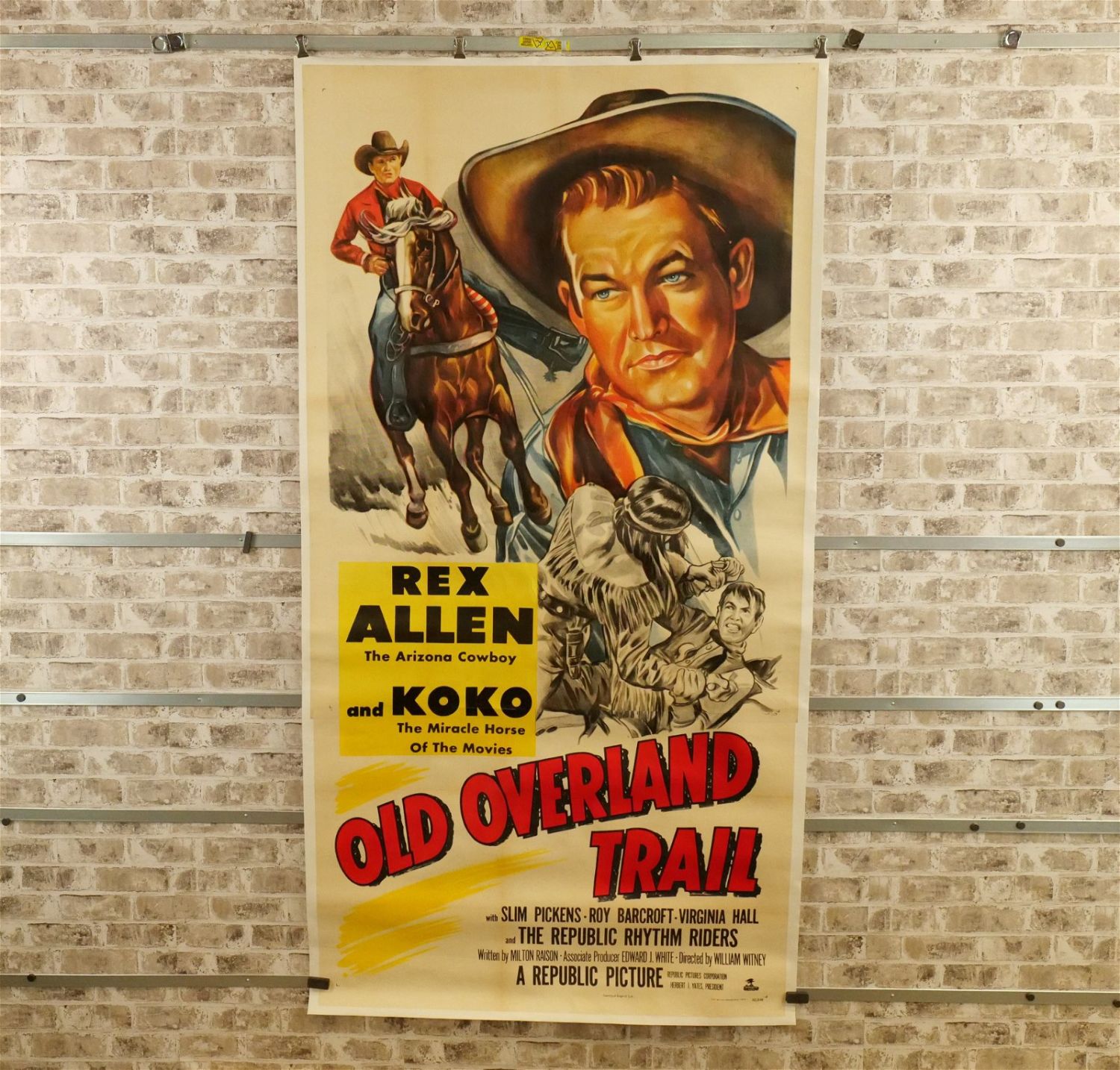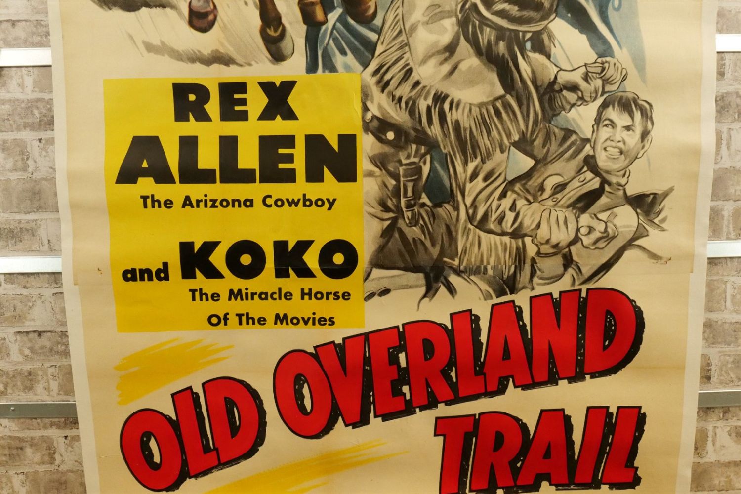 Old Overland Trail Three Sheet Movie Poster (1953). Linen Backed. #52/538. Starring Rex Allen and Koko The Miracle Horse. Restored at the word Koko and slight discoloration. Measures 42.5" wide x 81" long. All have minor tearing and creasing unless noted in good condition. All invoices must be paid within 24 hours of the sale. We offer multiple shipping options please read the shipping terms for your options. We also offer Pick-Ups Thursday, Friday, Saturday, and Monday immediately following the sale. BY APPOINTMENT ONLY.