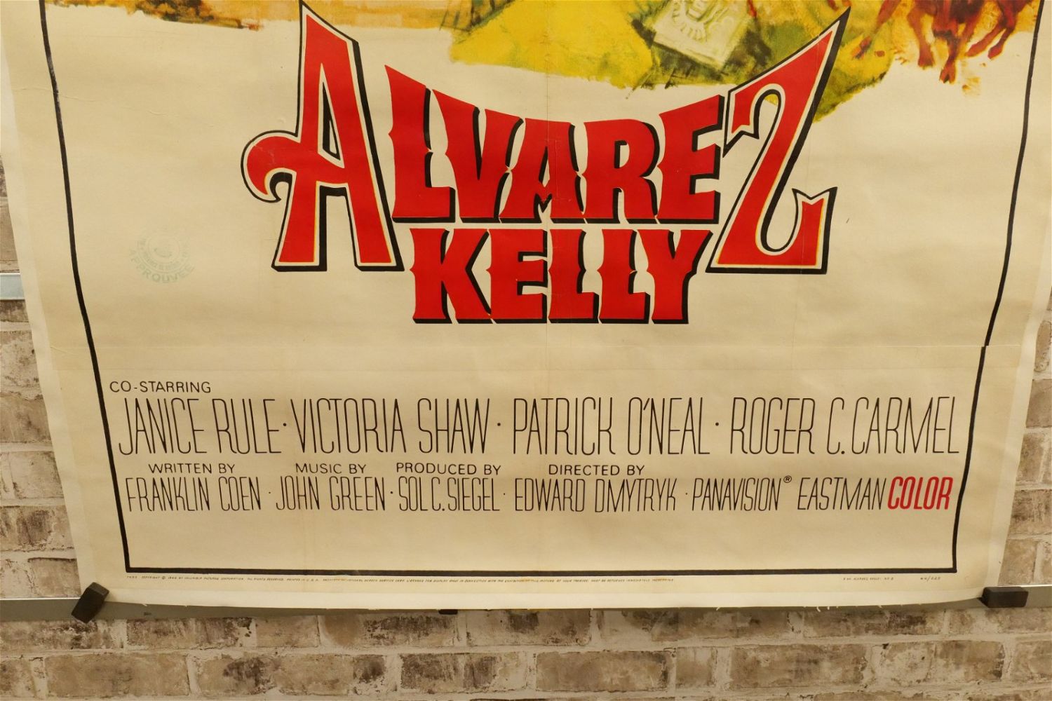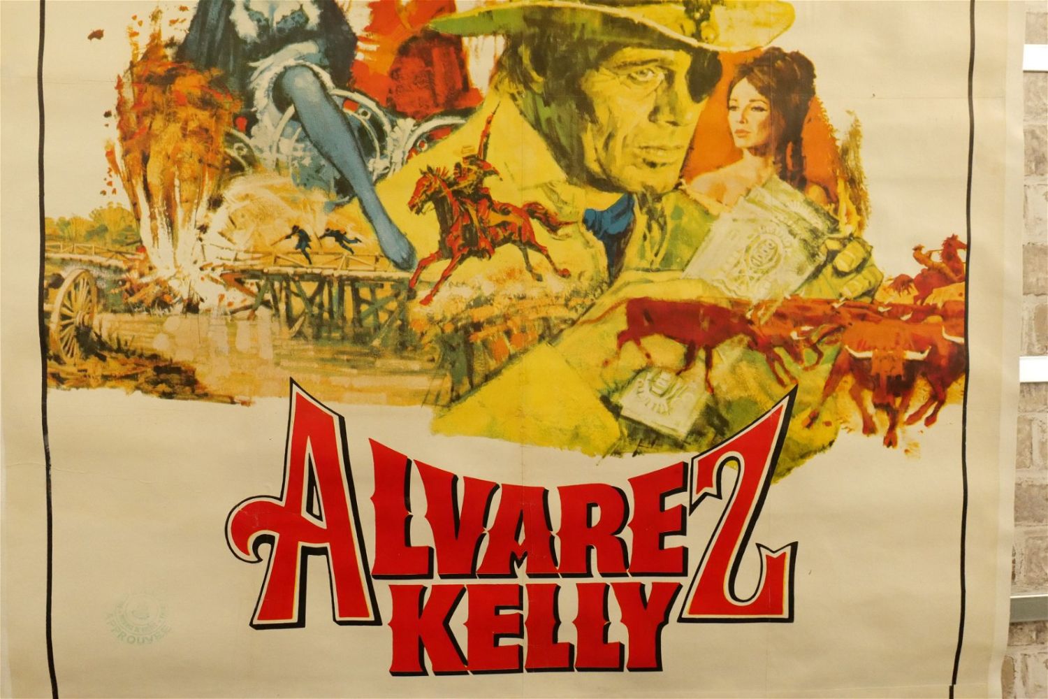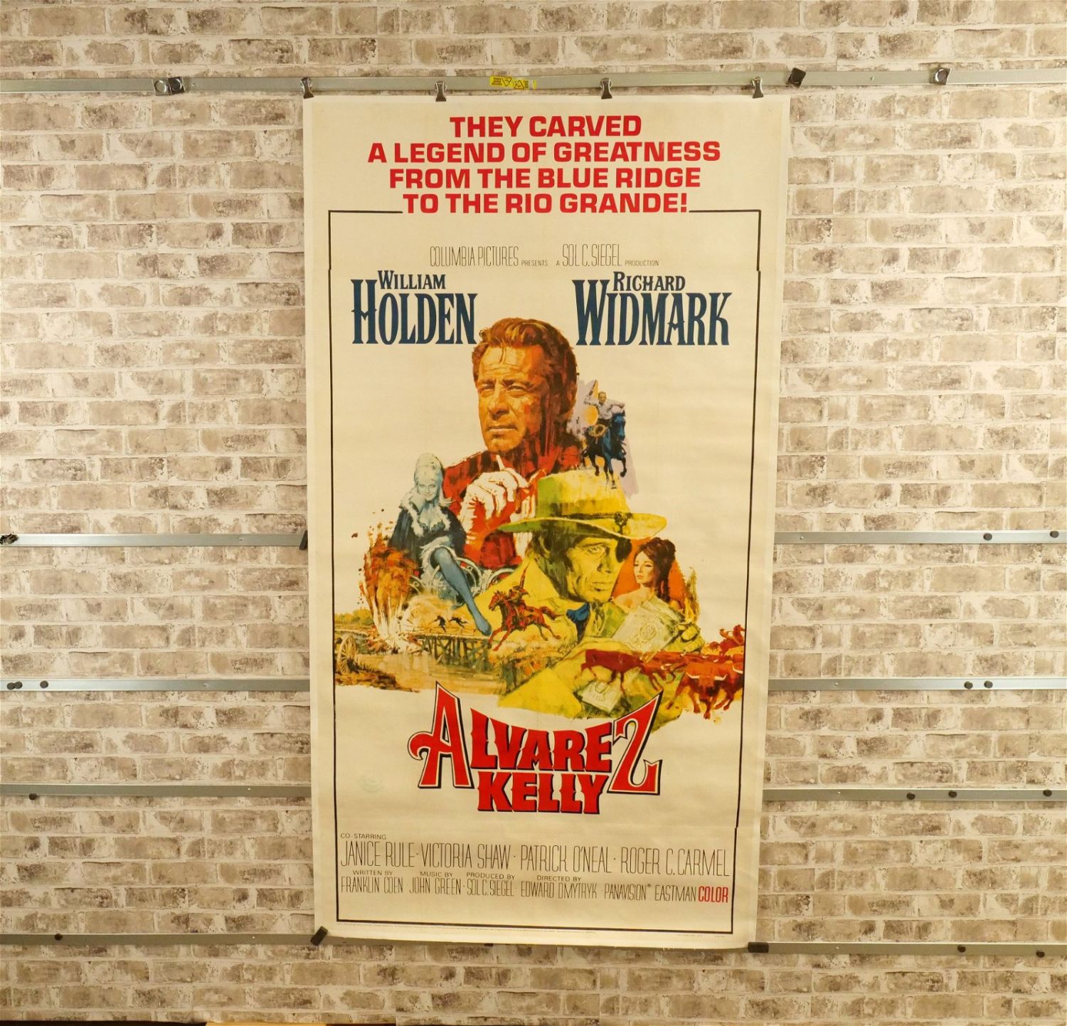 Alvarez Kelly Three Sheet Movie Poster (1966). Linen Backed. #66/225. Starring William Holden and Richard Widmark. Paint restoration throughout. Otherwise excellent condition. Measures 42.5" wide x 81" long. All have minor tearing and creasing unless noted in good condition. All invoices must be paid within 24 hours of the sale. We offer multiple shipping options please read the shipping terms for your options. We also offer Pick-Ups Thursday, Friday, Saturday, and Monday immediately following the sale. BY APPOINTMENT ONLY.