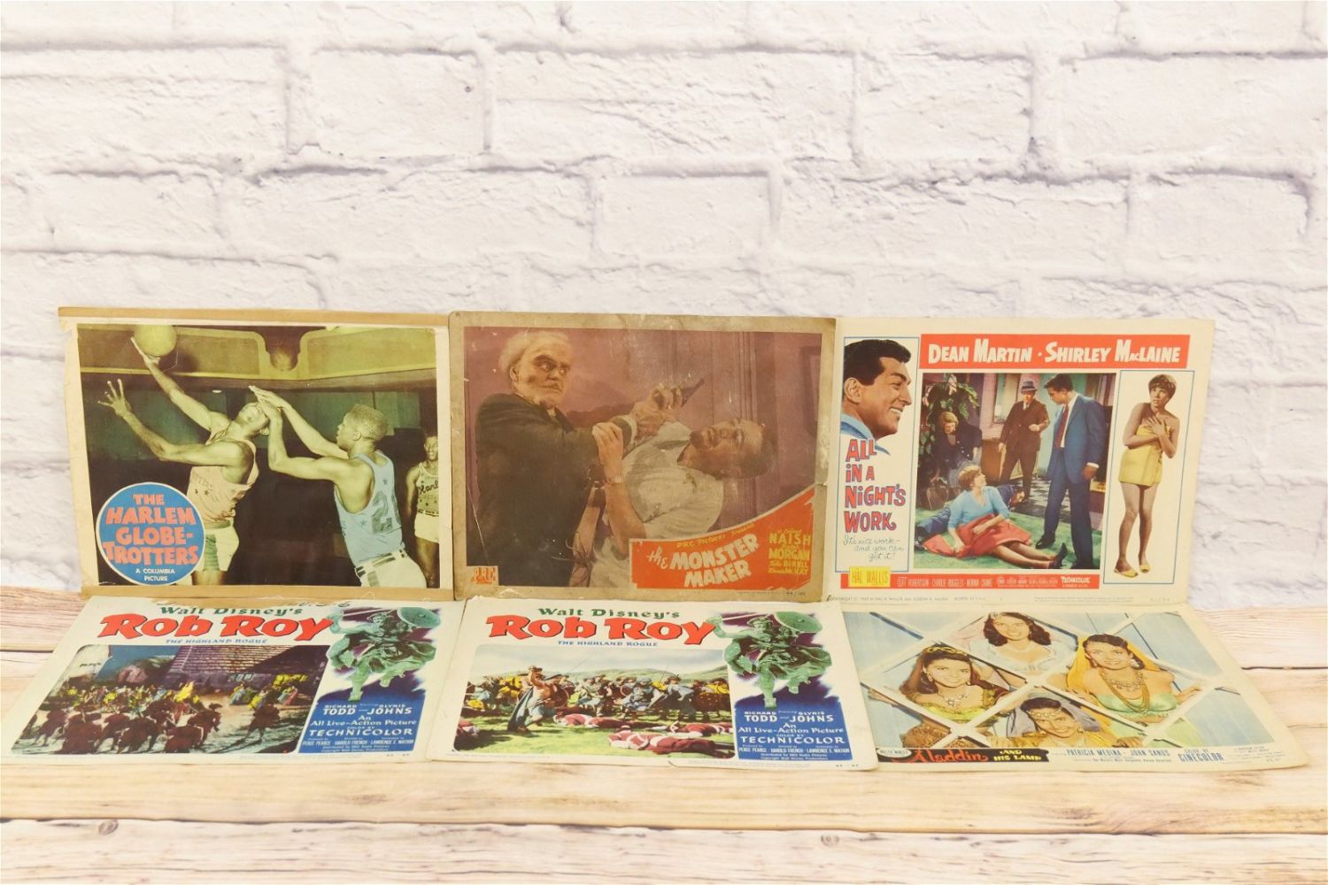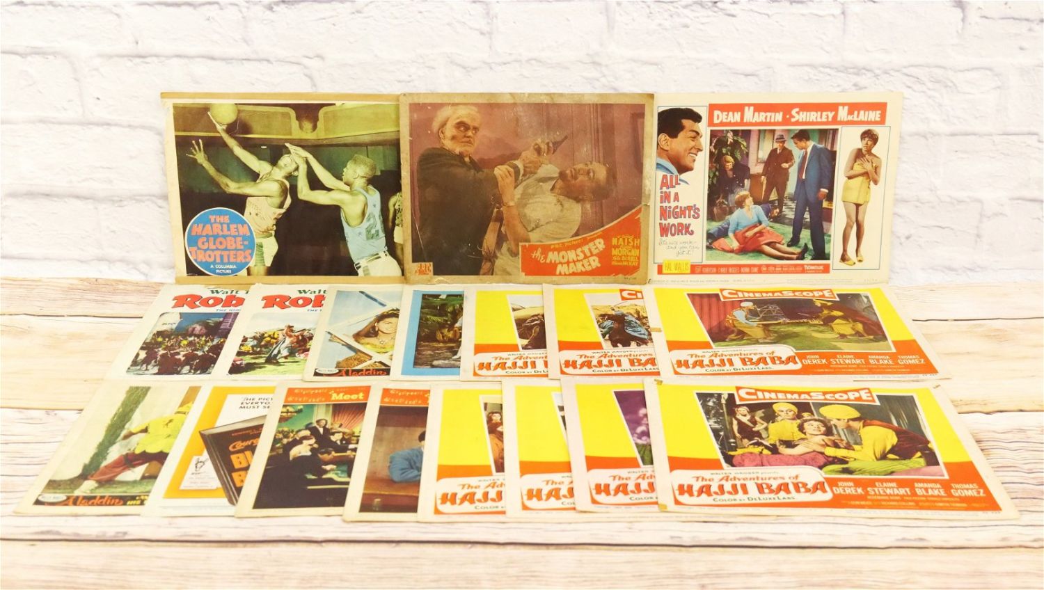 Lot of 18 Lobby Cards. Including The Harlem Globetrotters, The Monster Maker, Walt Disney’s Rob Roy, Aladdin and His Lamp, Black Beauty, The Adventures of Hajji Baba #2-8 and More. All invoices must be paid within 24 hours of the sale. We offer multiple shipping options please read the shipping terms for your options. We also offer Pick-Ups Thursday, Friday, Saturday, and Monday immediately following the sale. BY APPOINTMENT ONLY.