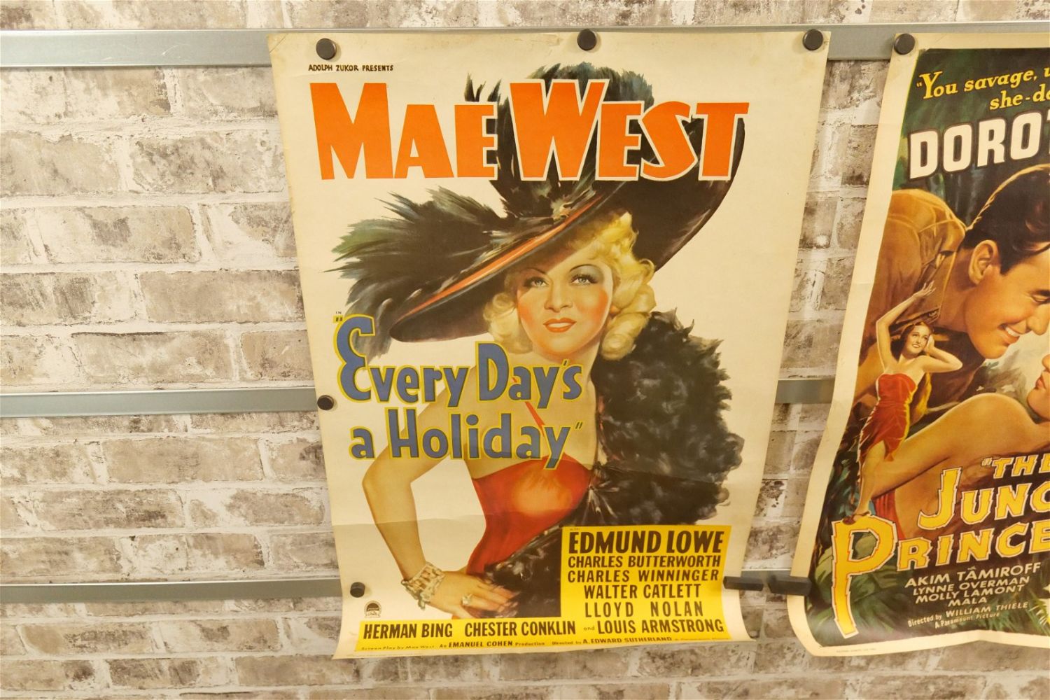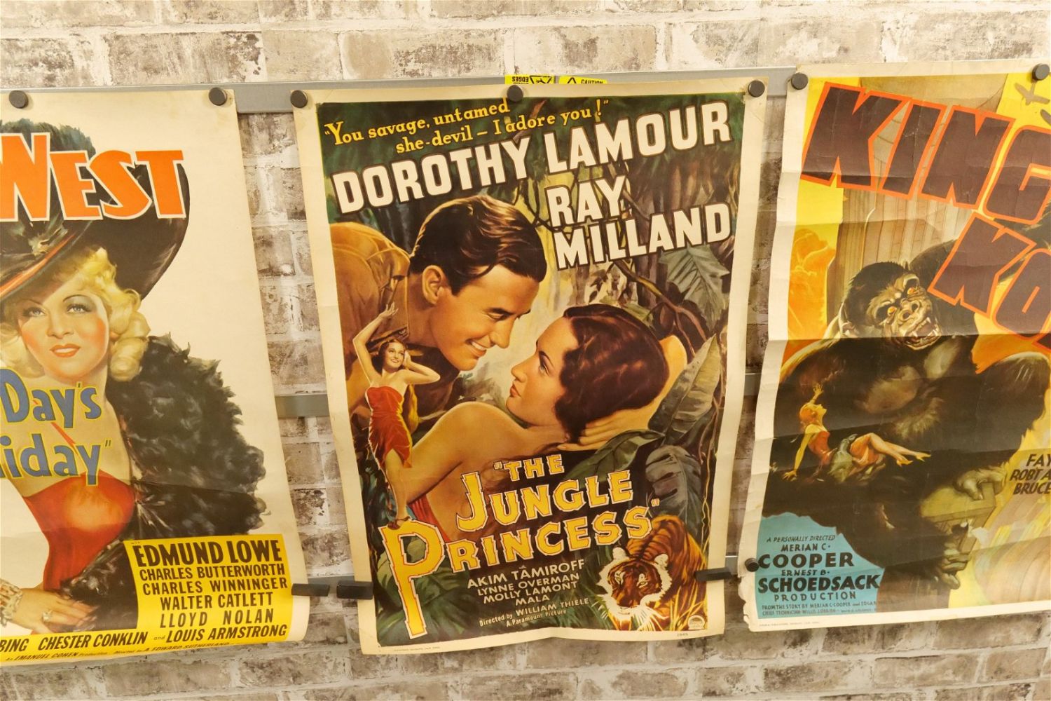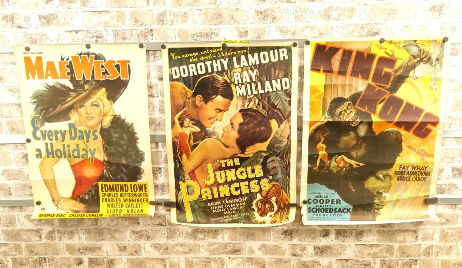 Lot of 3 Portal Publications Reprint Window/Lobby Cards. Including Every Days a Holiday 1938 The Malcom Willis Collection Starring Mae West. Second – The Jungle Princess 1945 Starring Dorothy Lamour and King Kong 1933 Starring Fay Wray. Largest measures 20.5" wide x 28.5" long. All have minor tearing and creasing unless noted in good condition. All invoices must be paid within 24 hours of the sale. We offer multiple shipping options please read the shipping terms for your options. We also offer Pick-Ups Thursday, Friday, Saturday, and Monday immediately following the sale. BY APPOINTMENT ONLY.