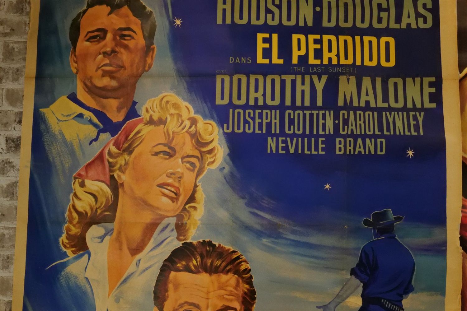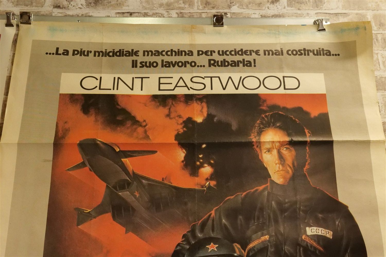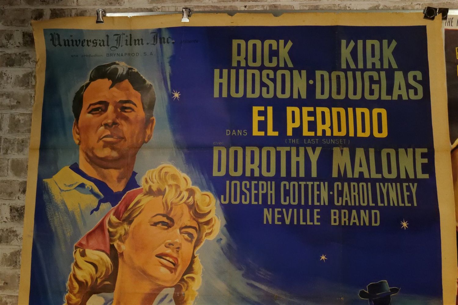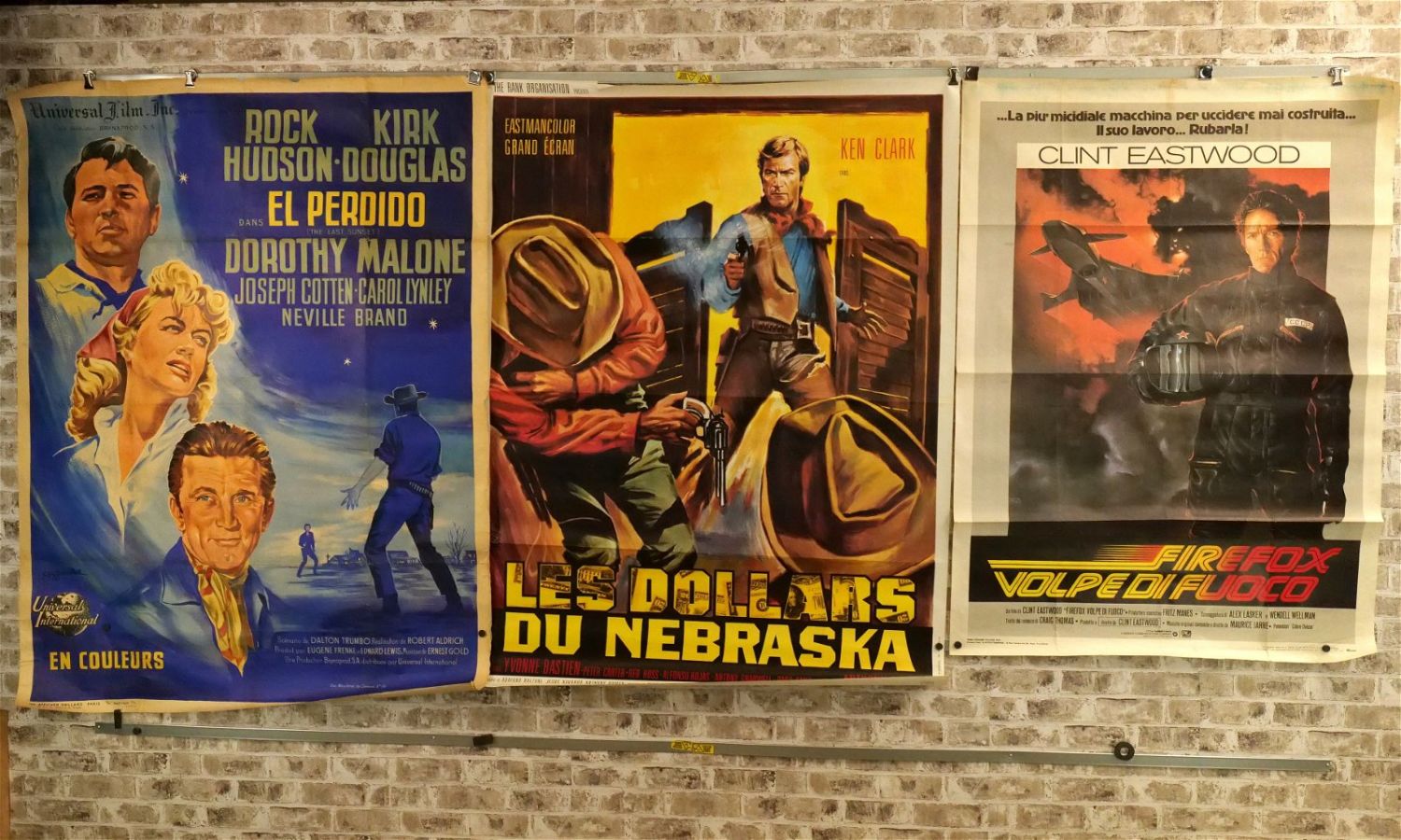 Lot of 3 Oversized One Sheet Movie Posters. Including El Perdido (1961) US Title Translation (The Lost) US Movie Translation "The Last Sunset" Starring Rock Hudson and Kirk Douglass – Discoloration to paper, reinforcements at seams, loss to right edge and top and small holes at center crease. Second – Firefox Volpe di Duoco (1982) – Italian – US Movie Name "Firefox" Starring Clint Eastwood – Repair to top center crease and pinholes at creases. Some loss to edges. Third – Les Dollars du Nebraska (1966) – Italian. US Movie Translation "Nebraska Dollars" Starring Clint Eastwood – Small tears at top crease and some holes at center crease. All have minor tearing and creasing unless noted in good condition. Measures 49" wide x 64" long. All invoices must be paid within 24 hours of the sale. We offer multiple shipping options please read the shipping terms for your options. We also offer Pick-Ups Thursday, Friday, Saturday, and Monday immediately following the sale. BY APPOINTMENT ONLY.