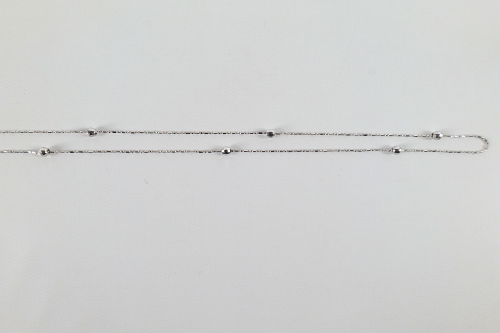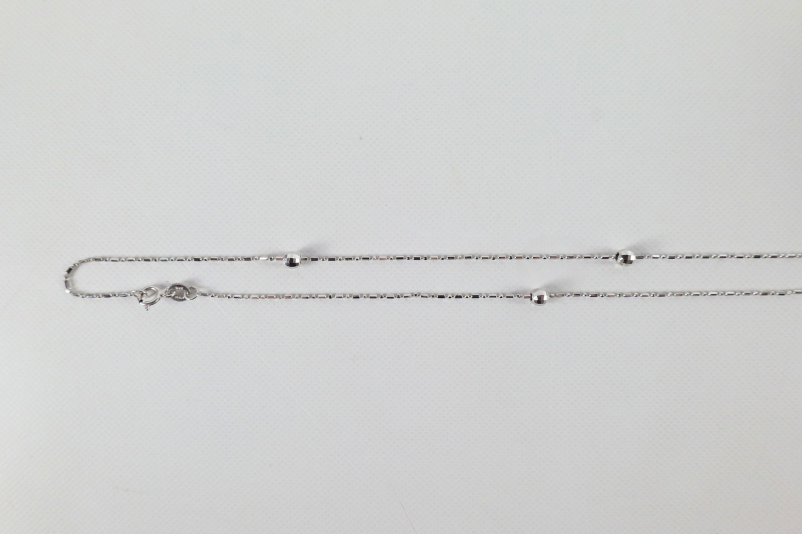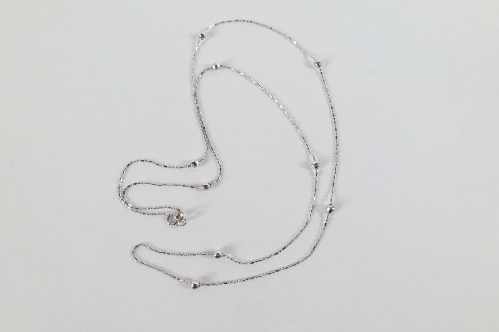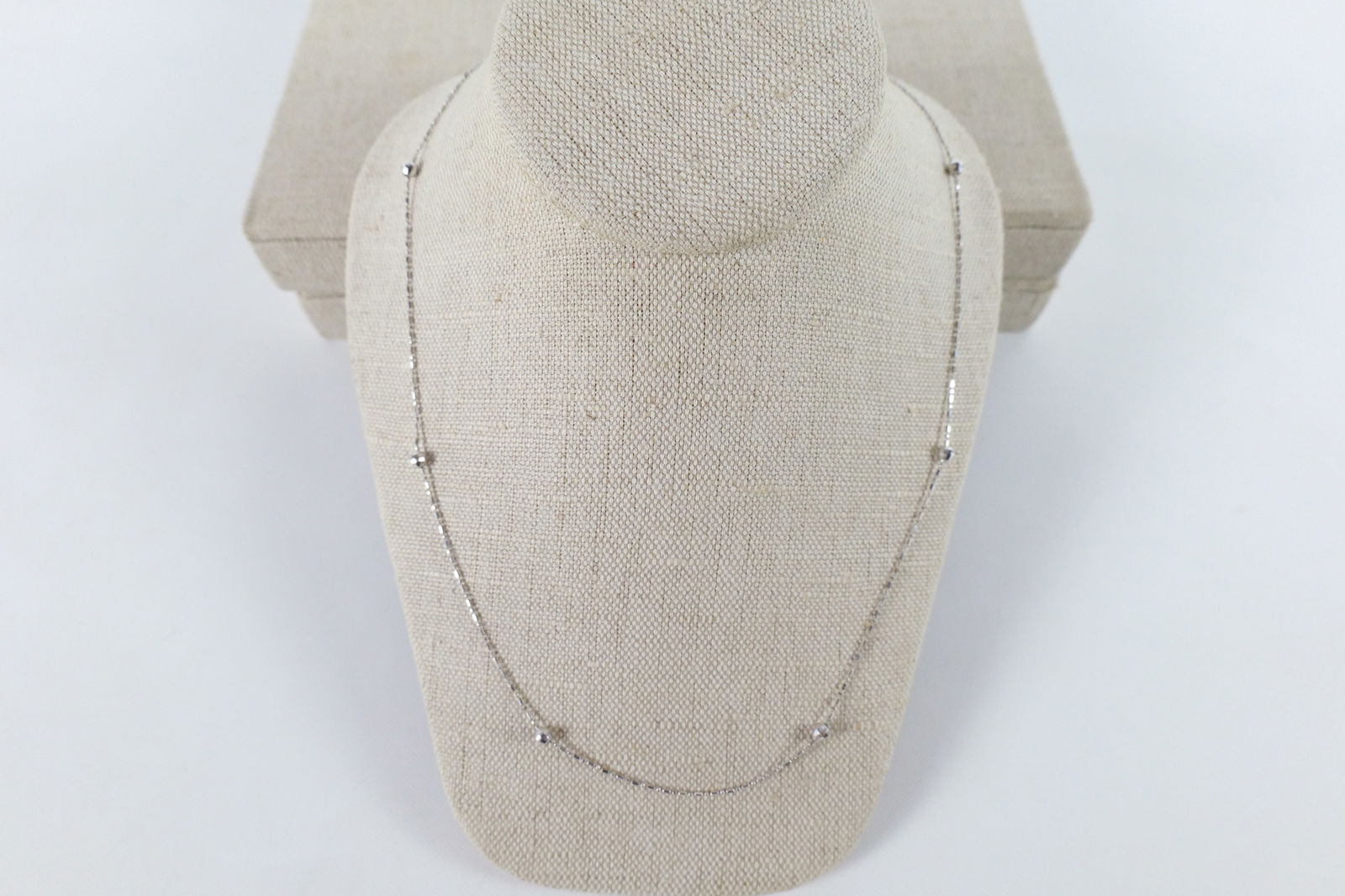 14K White Gold Italian Made Necklace. The lot includes a 28” long Italian made 14K white gold necklace made of alternating round and oblong bead chain with 3.6mm faceted 14K white gold bead stations and a spring ring closure. It weighs 3.6 grams and is marked 14K Italy. All invoices must be paid within 24 hours of the sale. We offer multiple shipping options please read the shipping terms to understand your options. We also offer Pick-Ups Wednesday, Thursday and Friday immediately following the sale. BY APPOINTMENT ONLY.