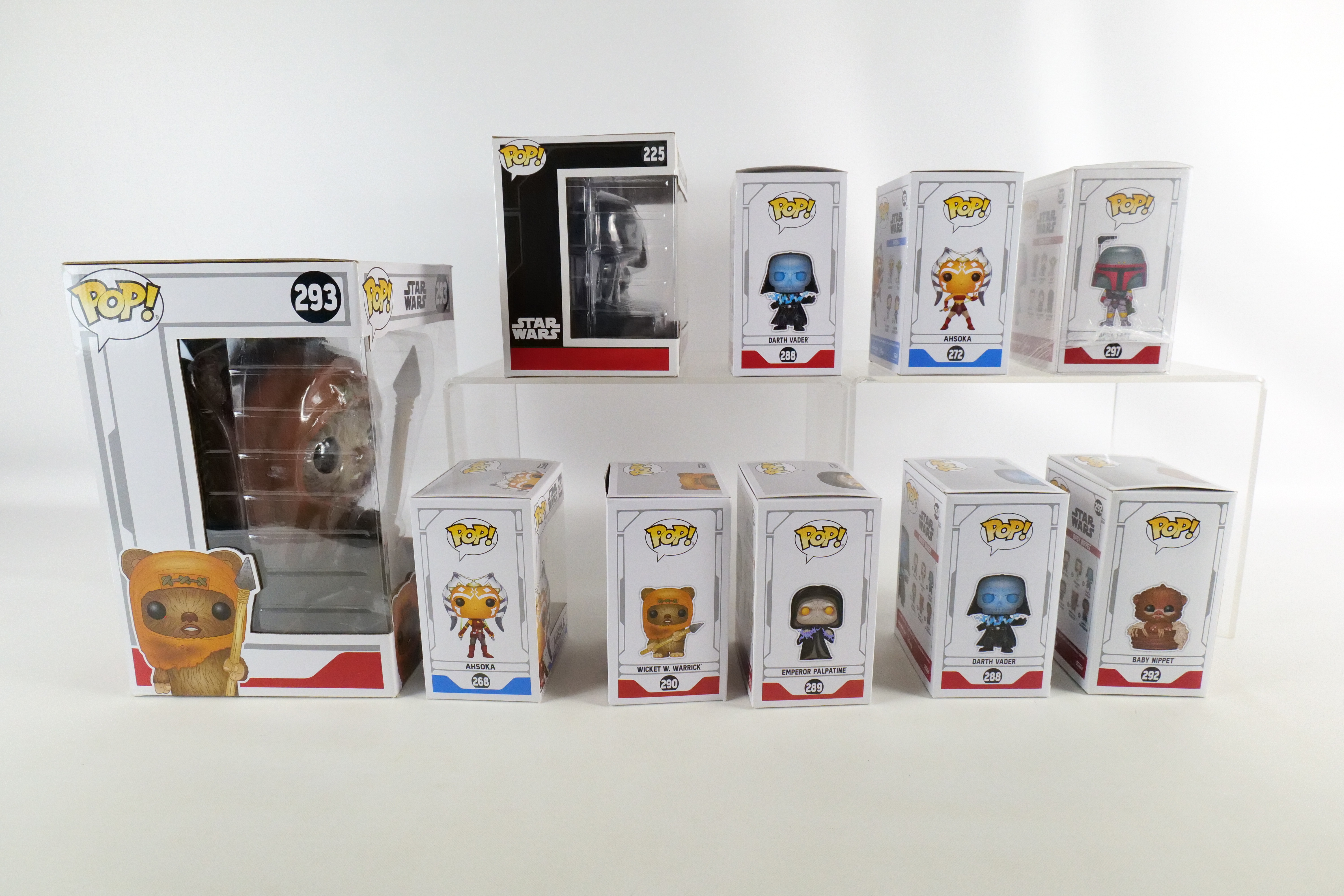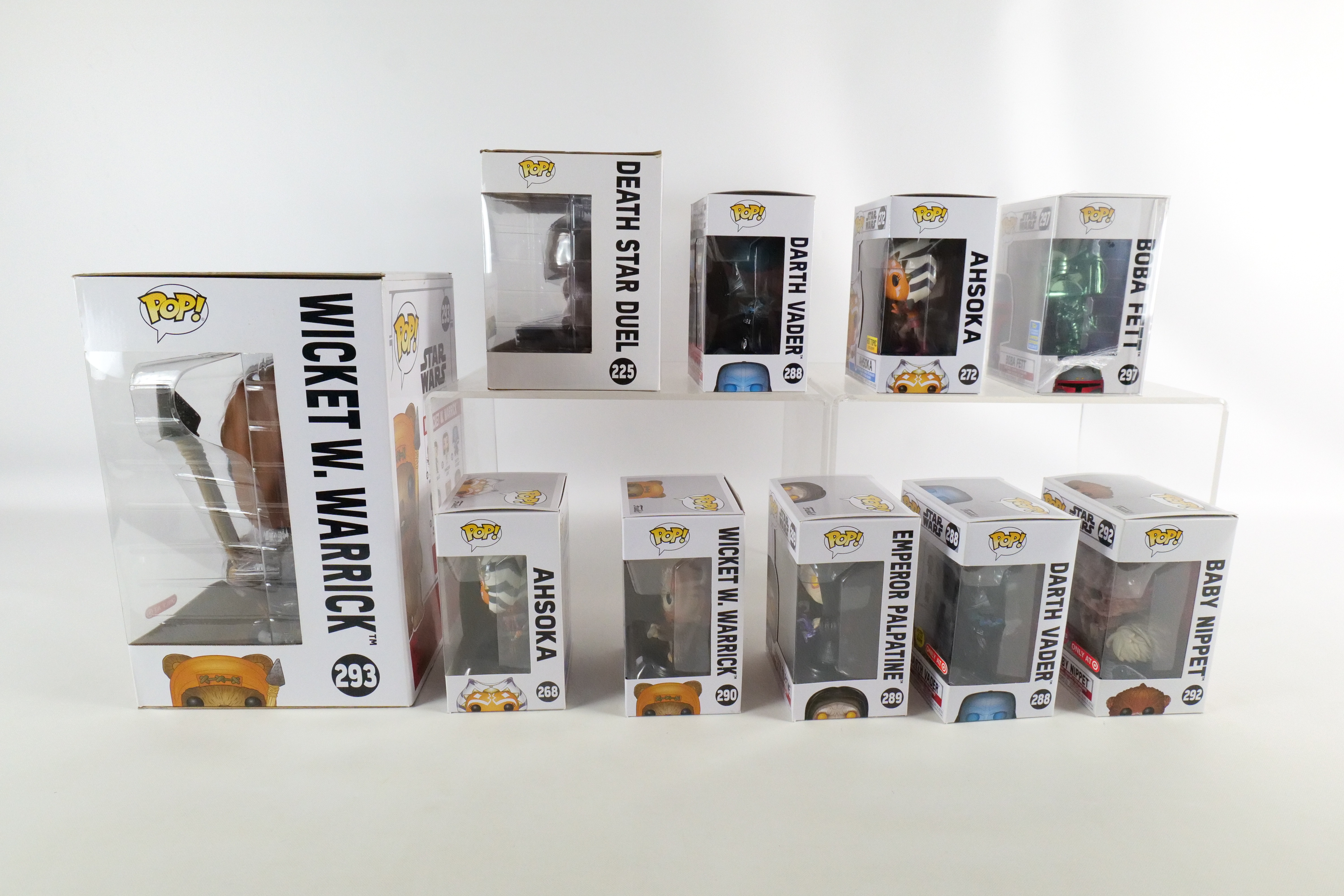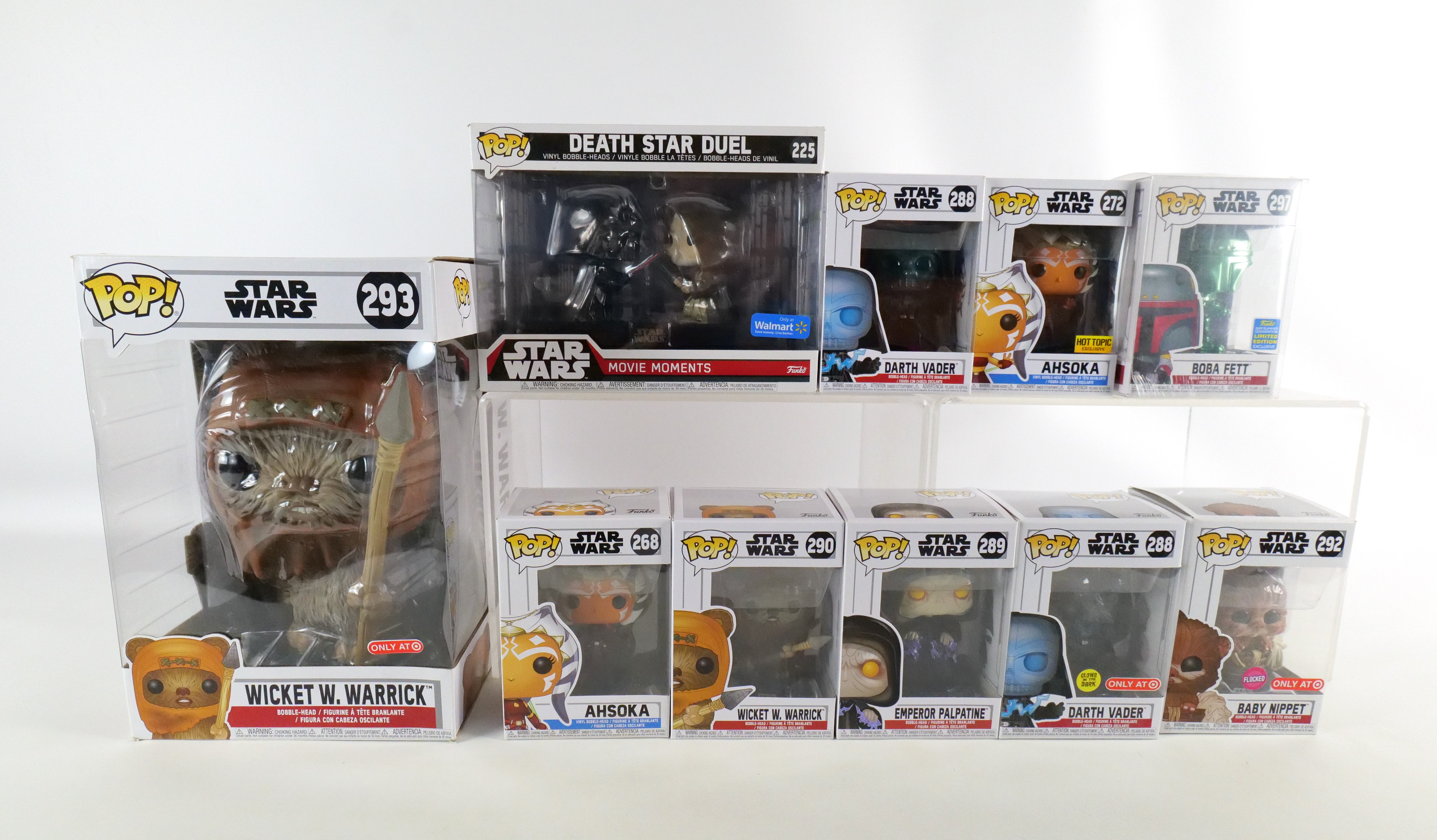 Lot of 10 Funko Star Wars Pops. Including Death Star Duel #225 Walmart Exclusive, Ahsoka #268, Ahsoka #272 Hot Topic Exclusive, Darth Vader #288 Common and Target Glow in the Dark Exclusive, Emperor Palpatine #289, Wicket W. Warrick #290, Baby Nippet #292 Target Exclusive Flocked, Wicket W. Warrick #293 Target Exclusive 10″ Pop, and Boba Fett #297 Summer Convention Exclusive. All pops are in new condition and come in the original boxes. The boxes may have slight wear/slight creasing/dings from storage. All invoices must be paid within 24 hours of the sale. We offer multiple shipping options please read the shipping terms to understand your options. We also offer Pick-Ups Friday, Saturday, and Monday immediately following the sale. BY APPOINTMENT ONLY.