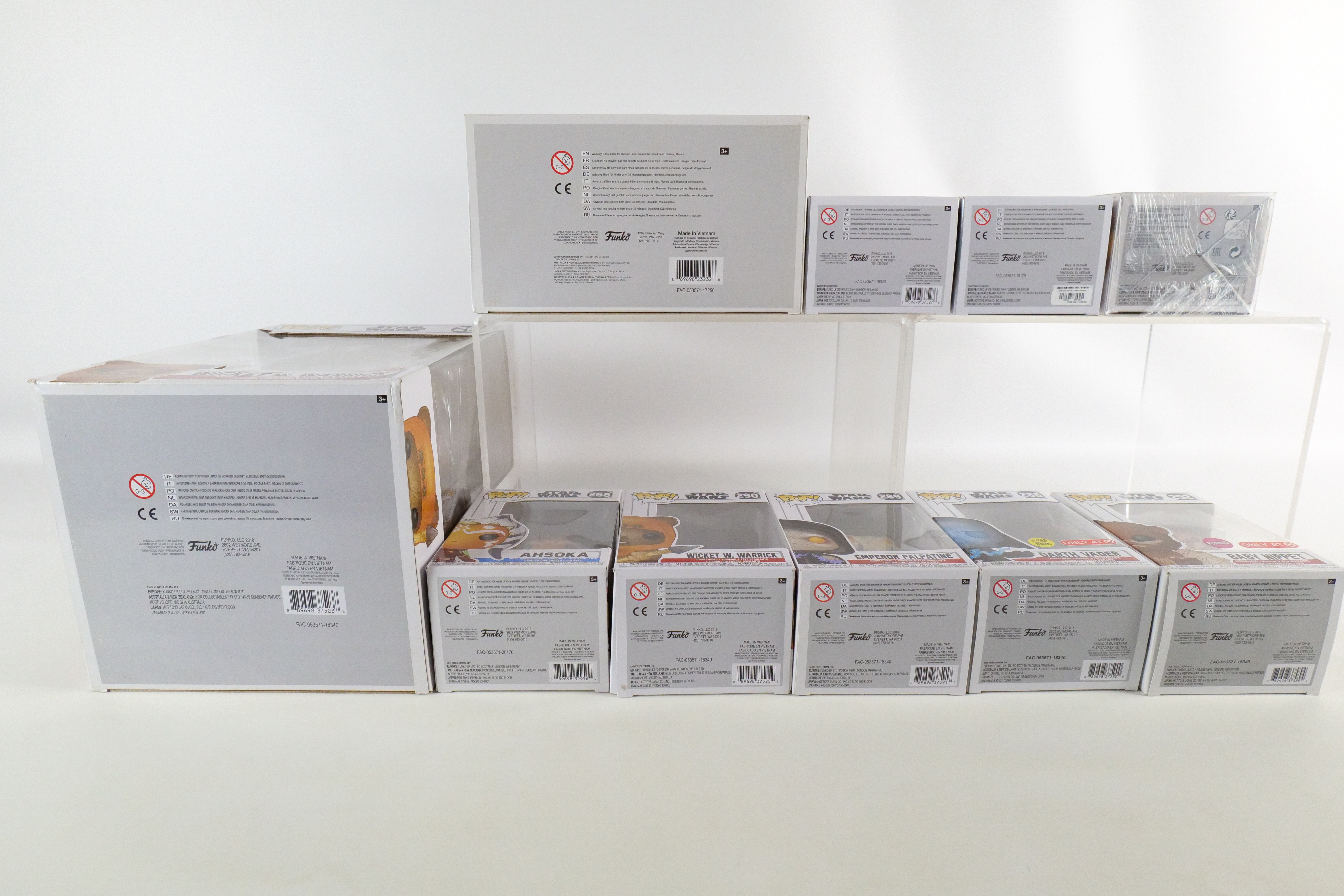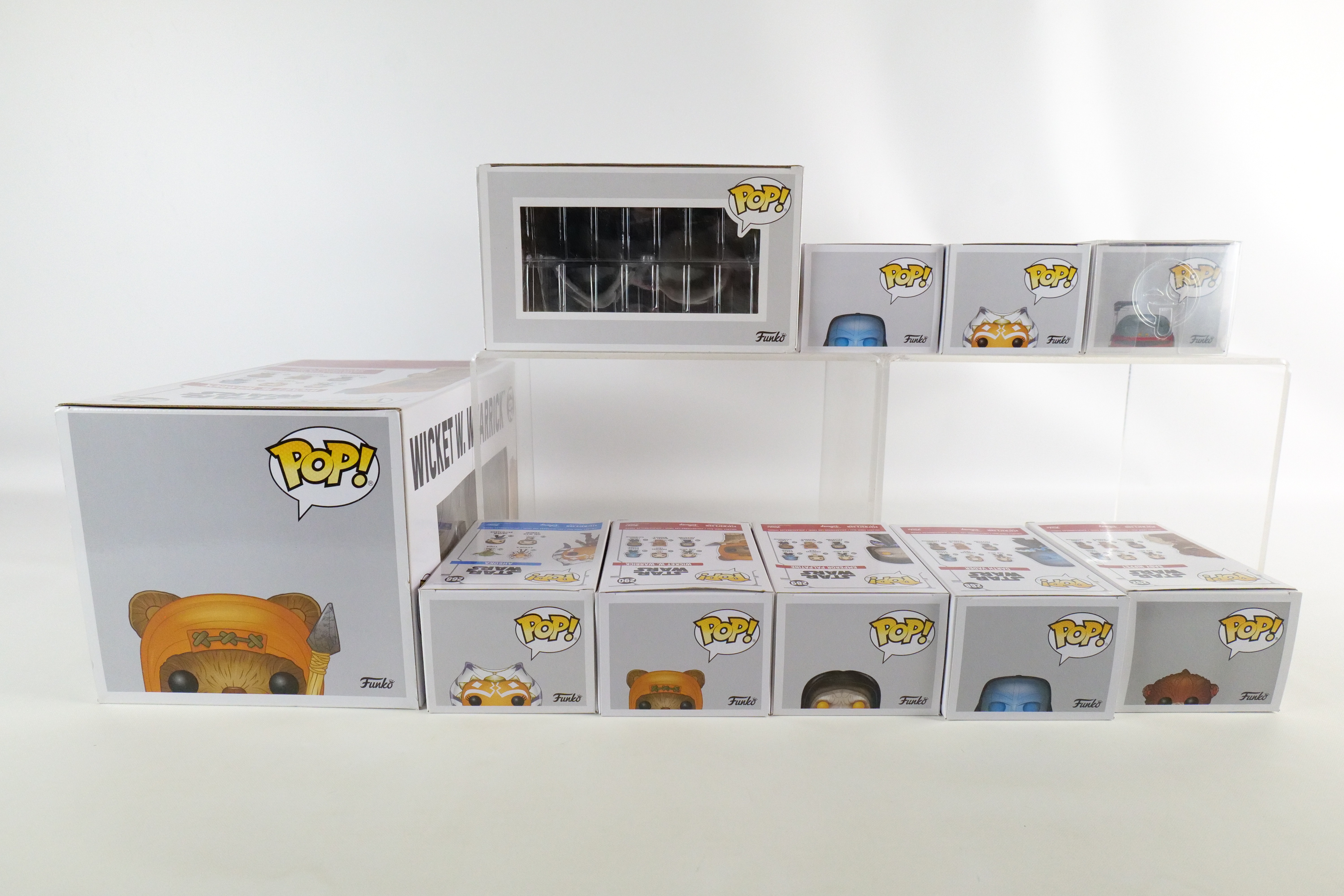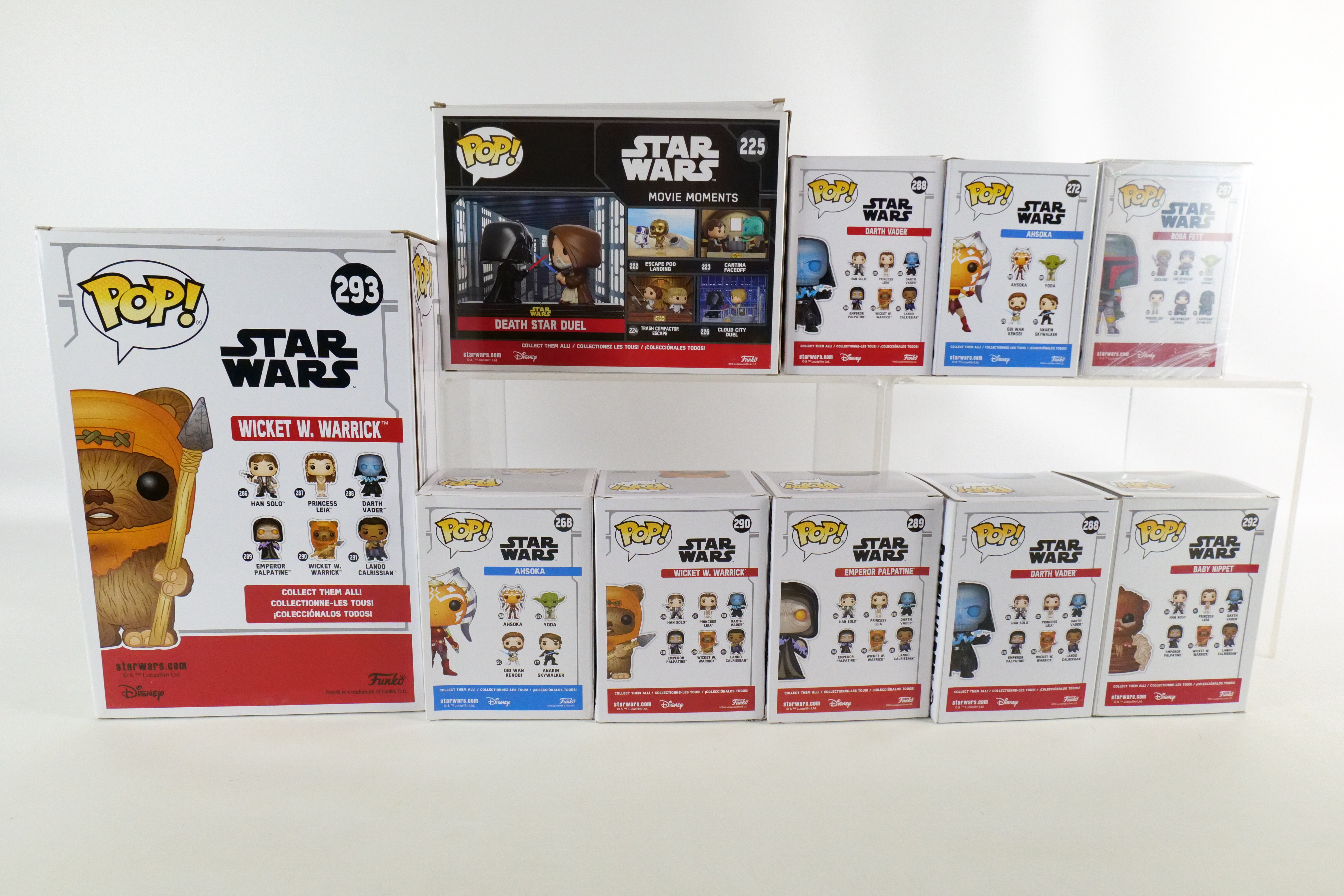 Lot of 10 Funko Star Wars Pops. Including Death Star Duel #225 Walmart Exclusive, Ahsoka #268, Ahsoka #272 Hot Topic Exclusive, Darth Vader #288 Common and Target Glow in the Dark Exclusive, Emperor Palpatine #289, Wicket W. Warrick #290, Baby Nippet #292 Target Exclusive Flocked, Wicket W. Warrick #293 Target Exclusive 10″ Pop, and Boba Fett #297 Summer Convention Exclusive. All pops are in new condition and come in the original boxes. The boxes may have slight wear/slight creasing/dings from storage. All invoices must be paid within 24 hours of the sale. We offer multiple shipping options please read the shipping terms to understand your options. We also offer Pick-Ups Friday, Saturday, and Monday immediately following the sale. BY APPOINTMENT ONLY.