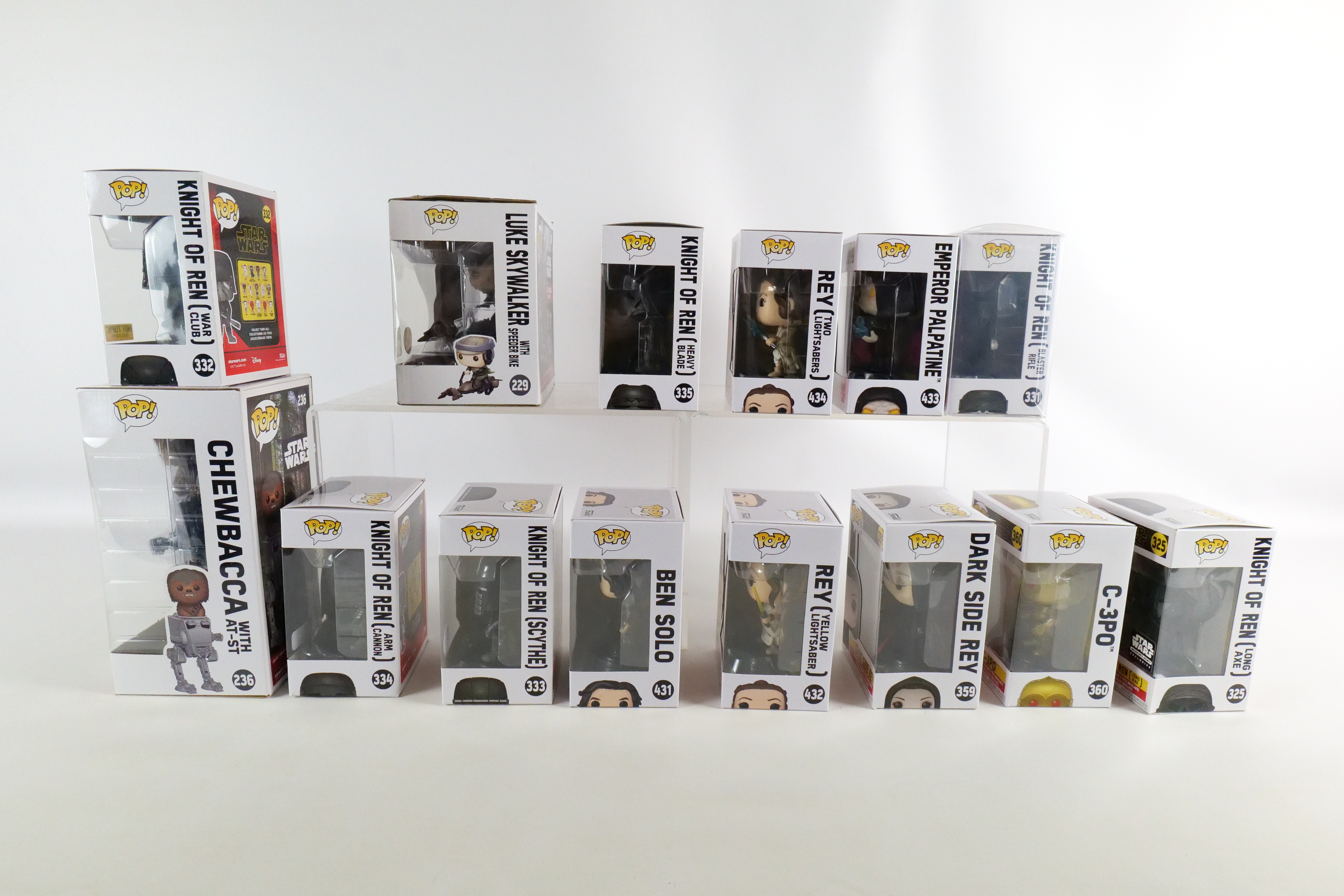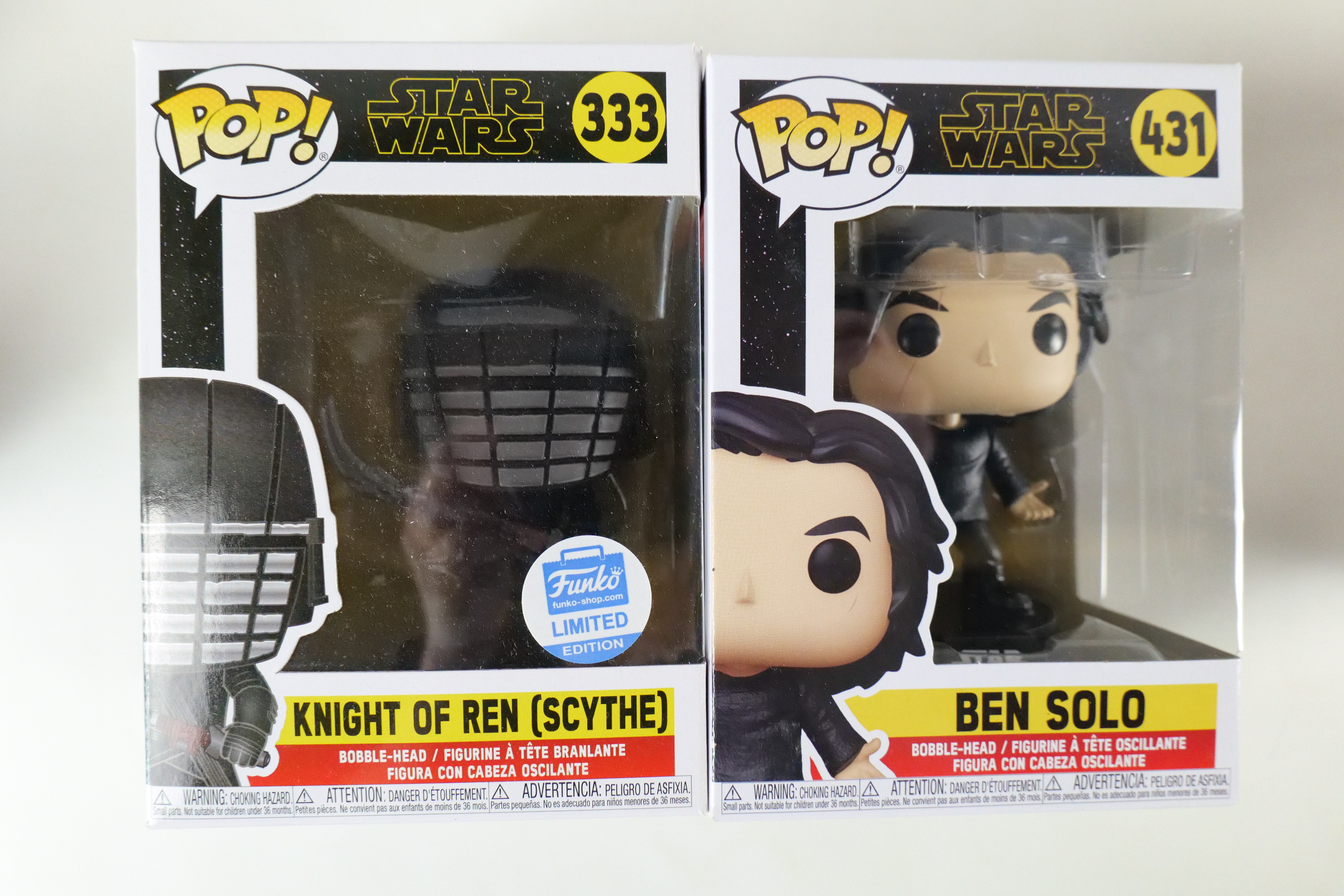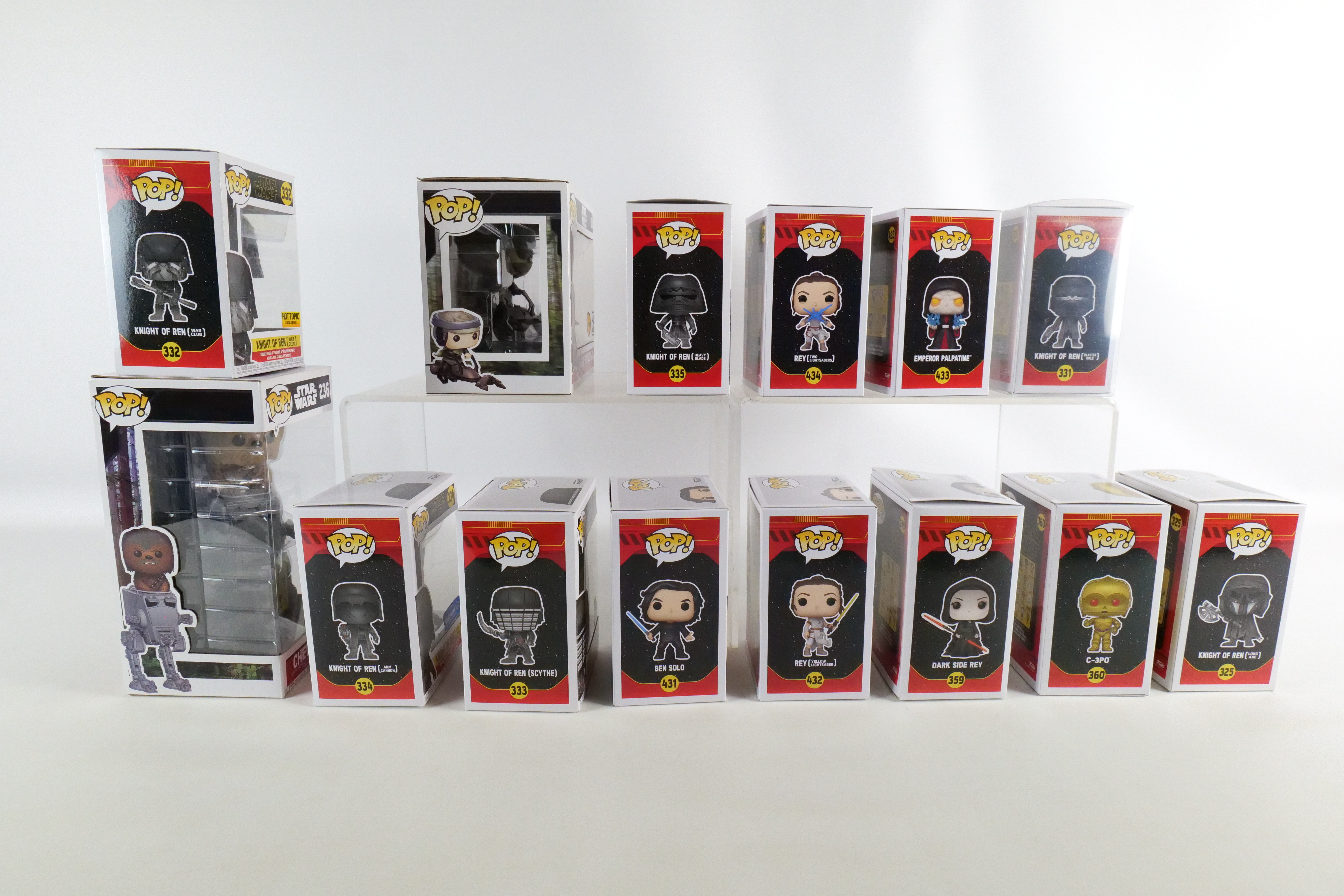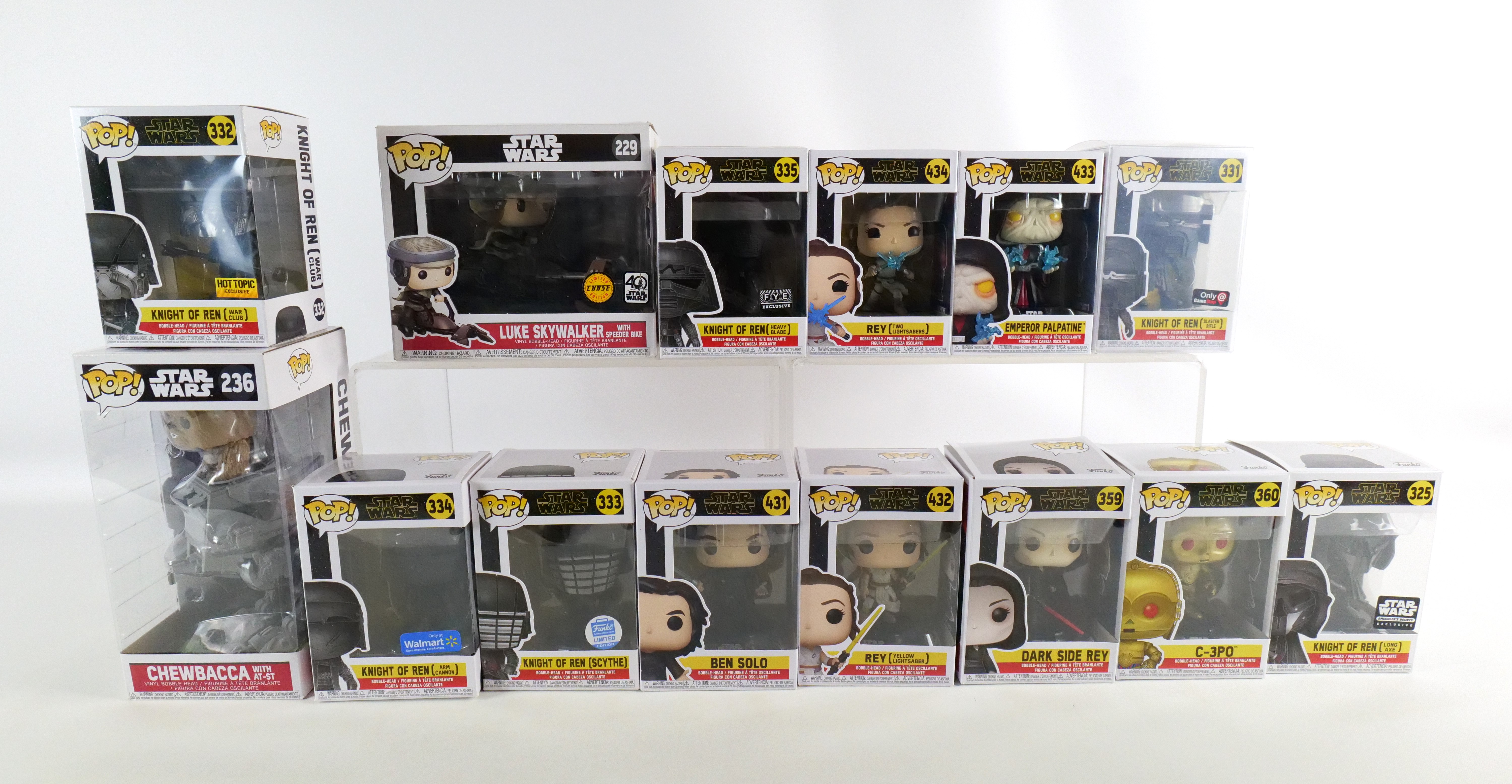 Lot of 14 Funko Star Wars Pops. Including Luke Skywalker with Speeder Bike #229 Chase, Chewbacca with AT-ST #236, Knight of Ren (Long Axe) #325 Smugglers Bounty Exclusive, Knight of Ren (Blaster Rifle) #331 GameStop Exclusive, Knight of Ren (War Club) #332 Hot Topic Exclusive, Knight of Ren (Scythe) #333 Limited Edition, Knight of Ren (Arm Cannon) #334 Walmart Exclusive, Knight of Ren (Heavy Blade) #335 FYE Exclusive, Dark Side Rey #359, C-3PO #360, Ben Solo #431, Rey (Yellow Lightsaber) #432, Emperor Palpatine #433 and Rey (Two Lightsabers) #434. All pops are in new condition and come in the original boxes. The boxes may have slight wear/slight creasing/dings from storage. All invoices must be paid within 24 hours of the sale. We offer multiple shipping options please read the shipping terms to understand your options. We also offer Pick-Ups Friday, Saturday, and Monday immediately following the sale. BY APPOINTMENT ONLY.
