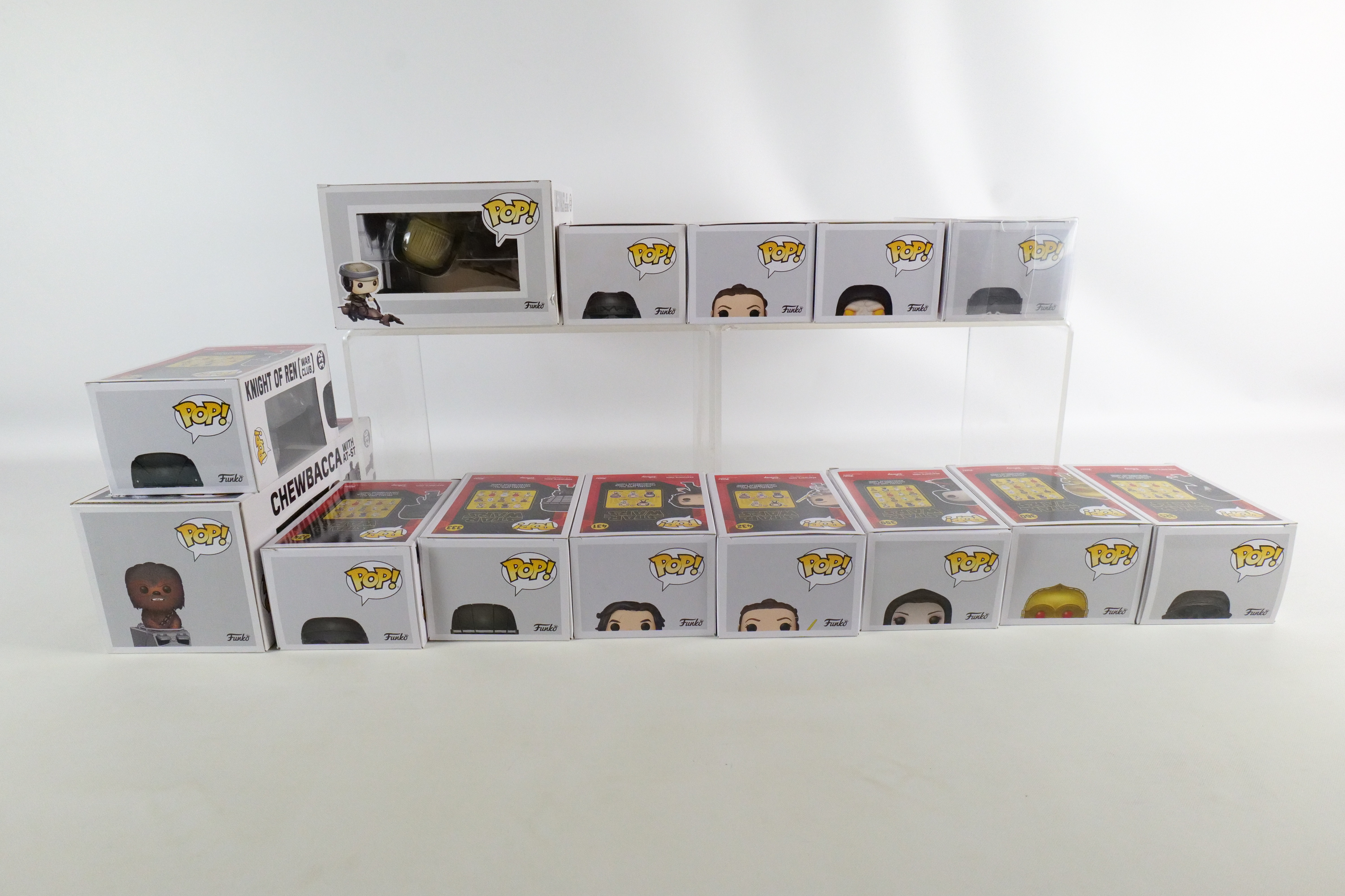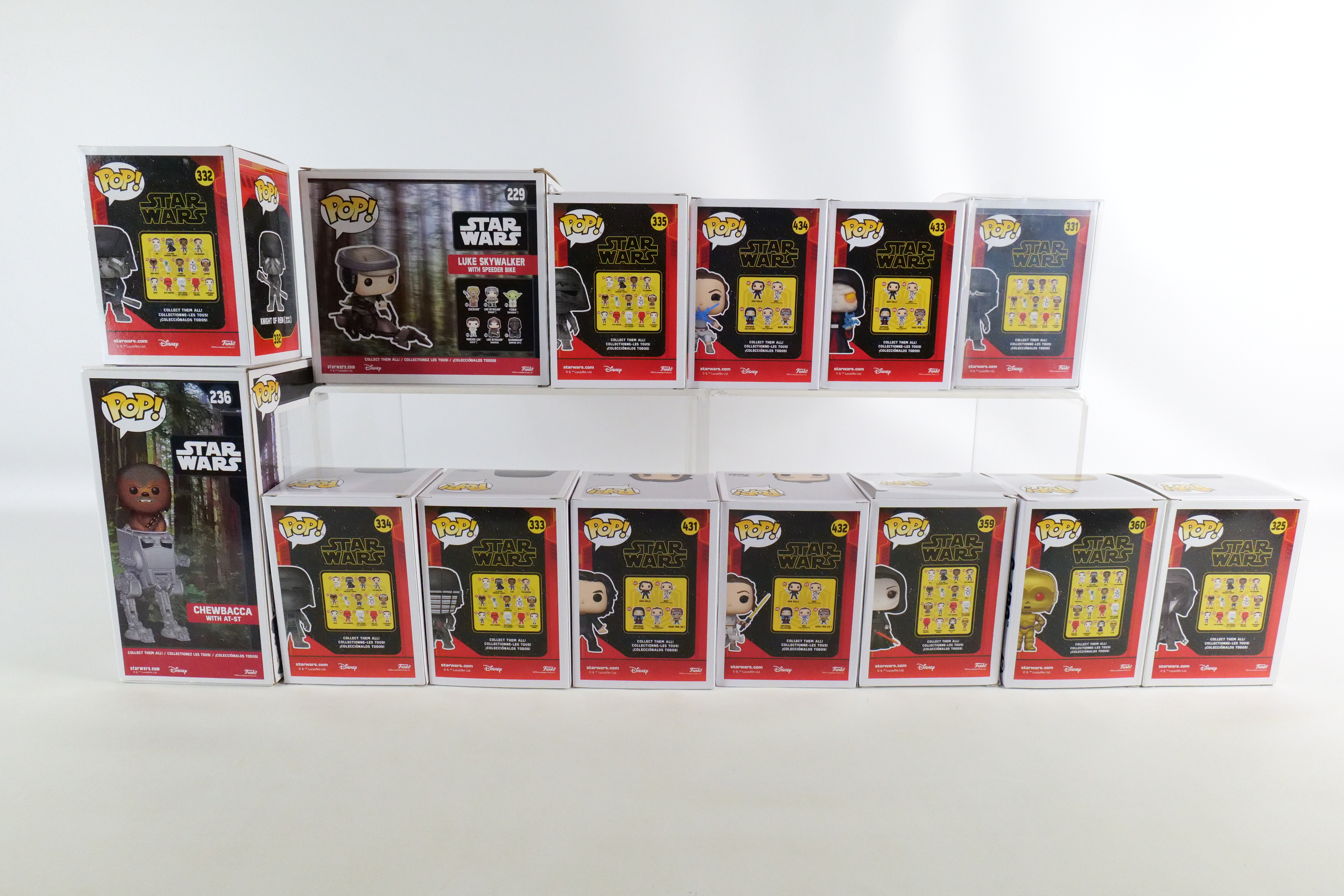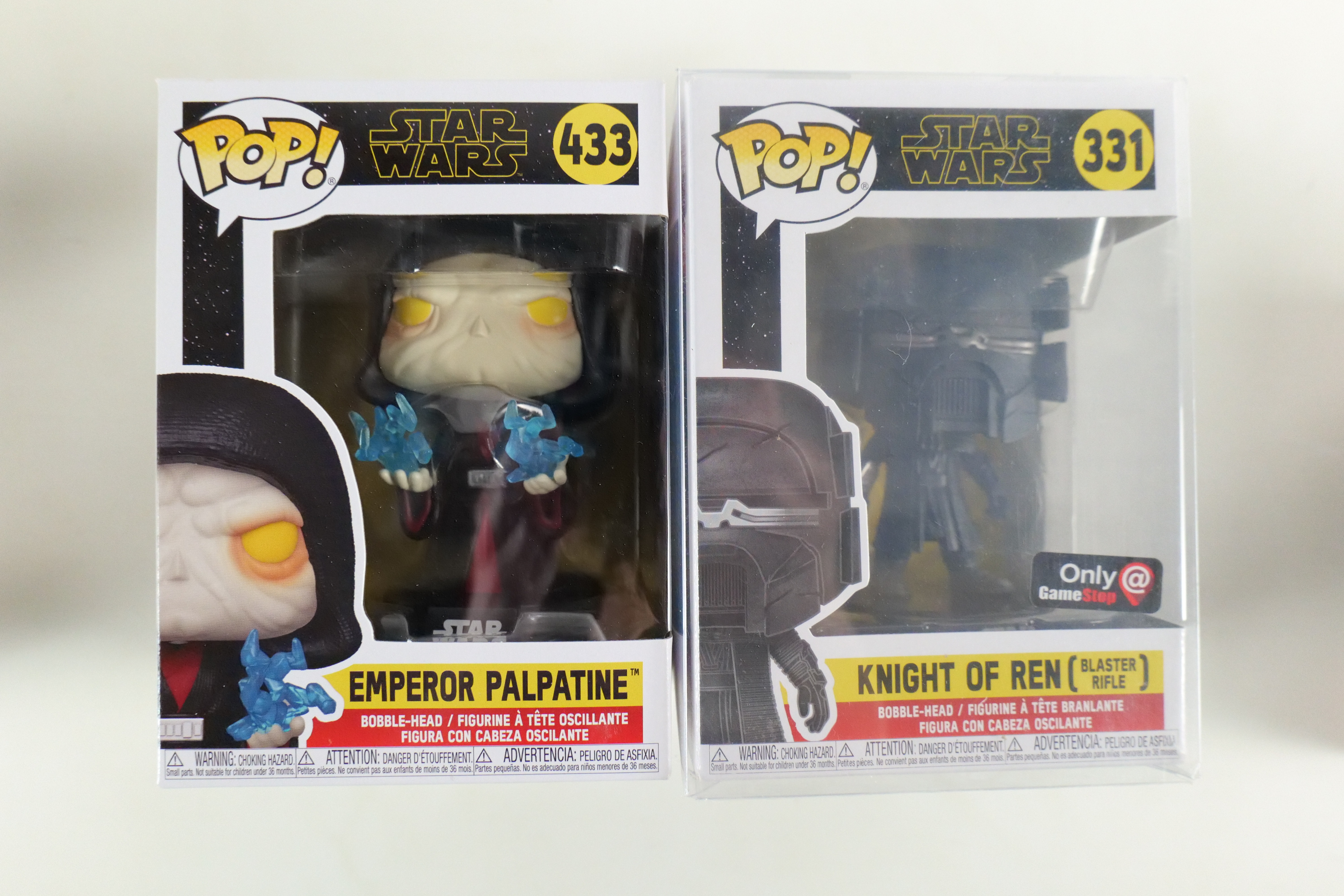 Lot of 14 Funko Star Wars Pops. Including Luke Skywalker with Speeder Bike #229 Chase, Chewbacca with AT-ST #236, Knight of Ren (Long Axe) #325 Smugglers Bounty Exclusive, Knight of Ren (Blaster Rifle) #331 GameStop Exclusive, Knight of Ren (War Club) #332 Hot Topic Exclusive, Knight of Ren (Scythe) #333 Limited Edition, Knight of Ren (Arm Cannon) #334 Walmart Exclusive, Knight of Ren (Heavy Blade) #335 FYE Exclusive, Dark Side Rey #359, C-3PO #360, Ben Solo #431, Rey (Yellow Lightsaber) #432, Emperor Palpatine #433 and Rey (Two Lightsabers) #434. All pops are in new condition and come in the original boxes. The boxes may have slight wear/slight creasing/dings from storage. All invoices must be paid within 24 hours of the sale. We offer multiple shipping options please read the shipping terms to understand your options. We also offer Pick-Ups Friday, Saturday, and Monday immediately following the sale. BY APPOINTMENT ONLY.