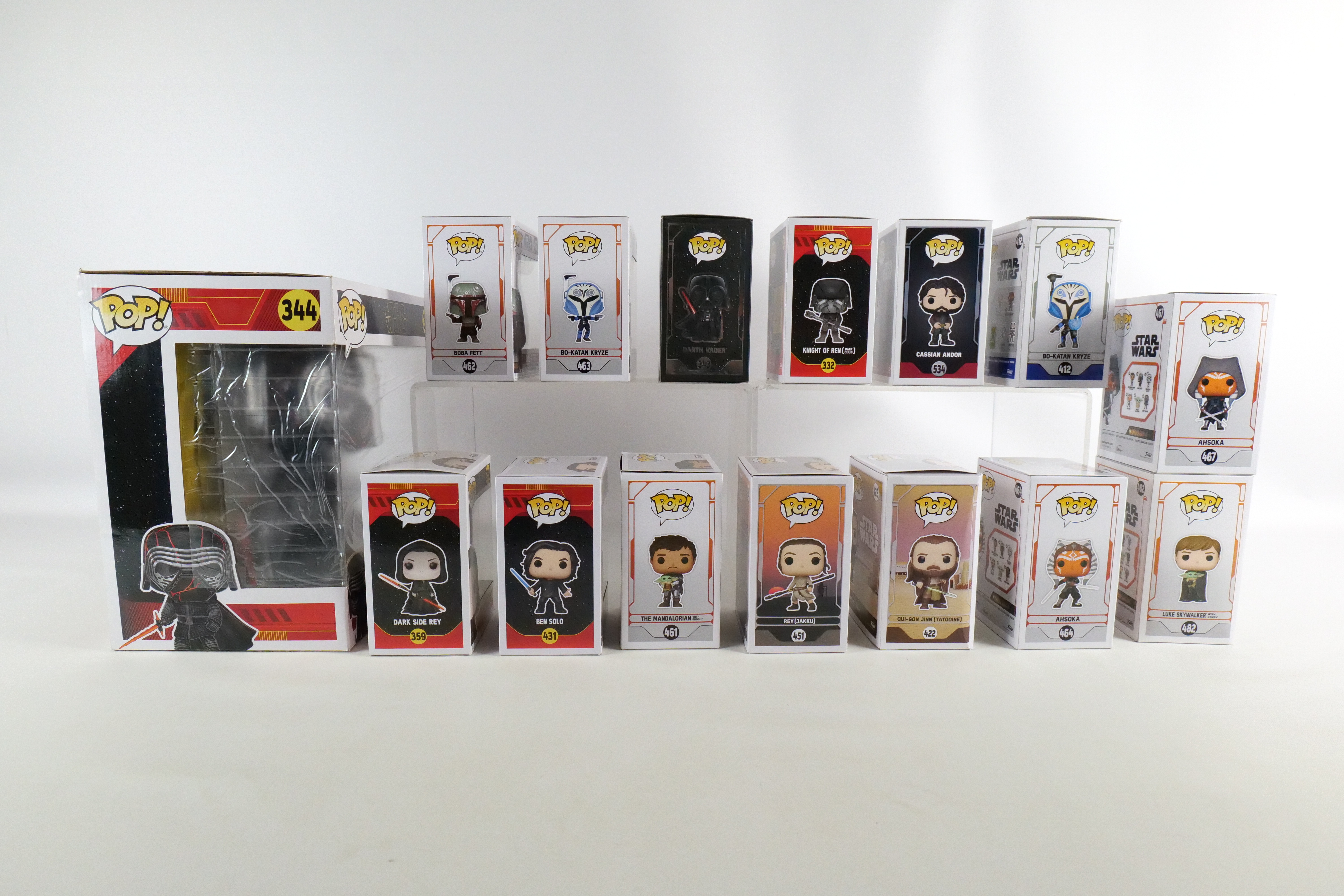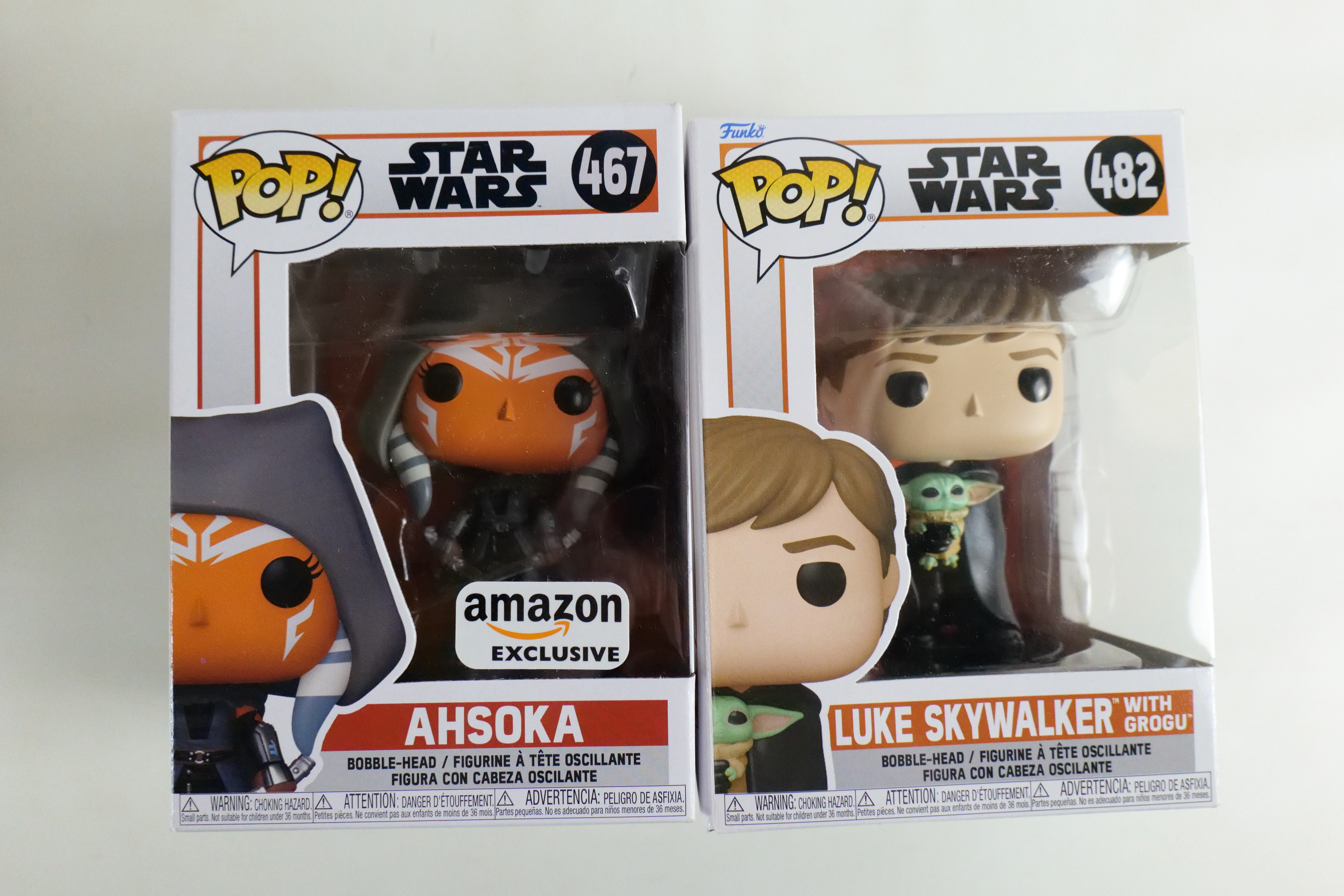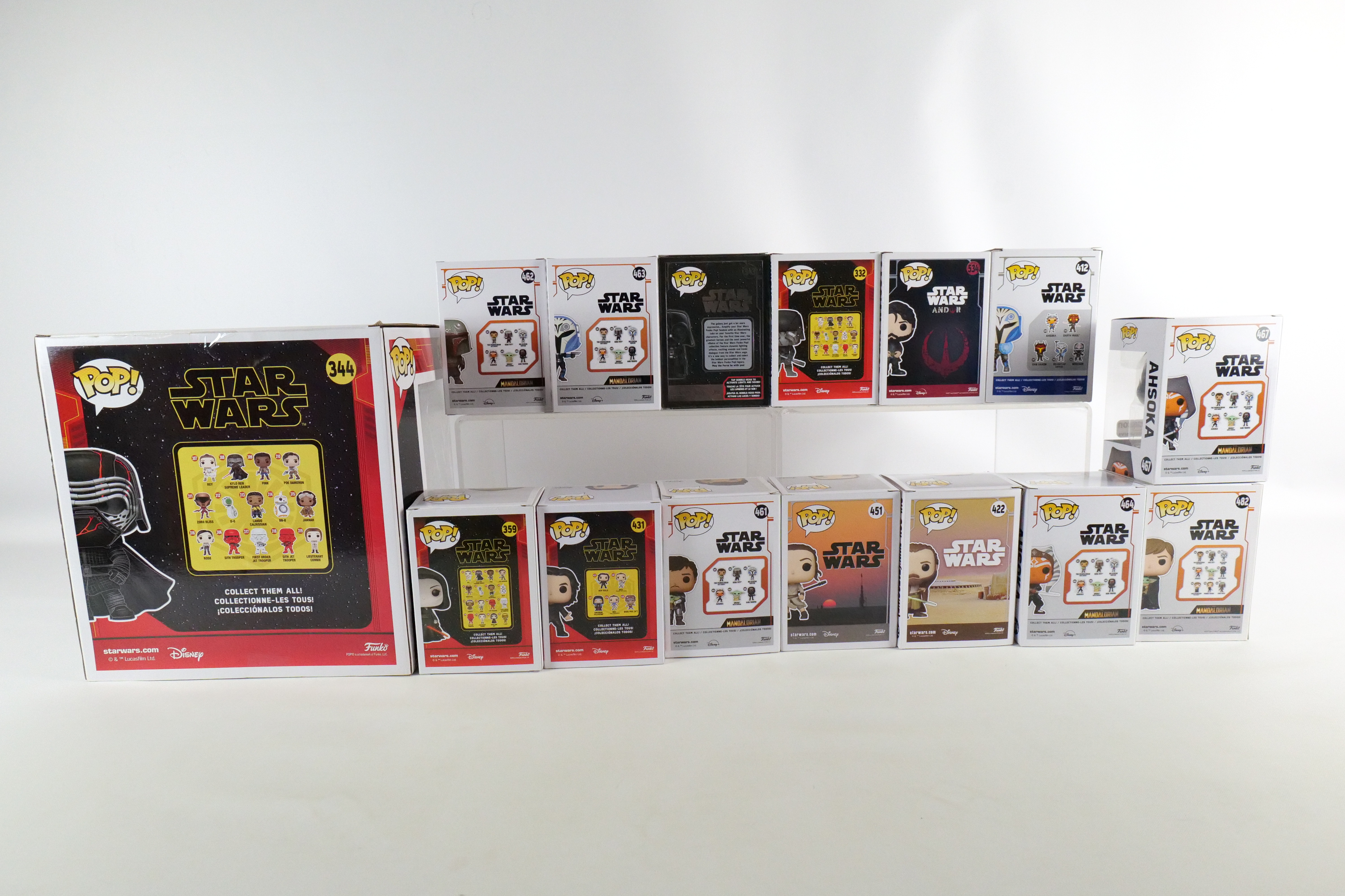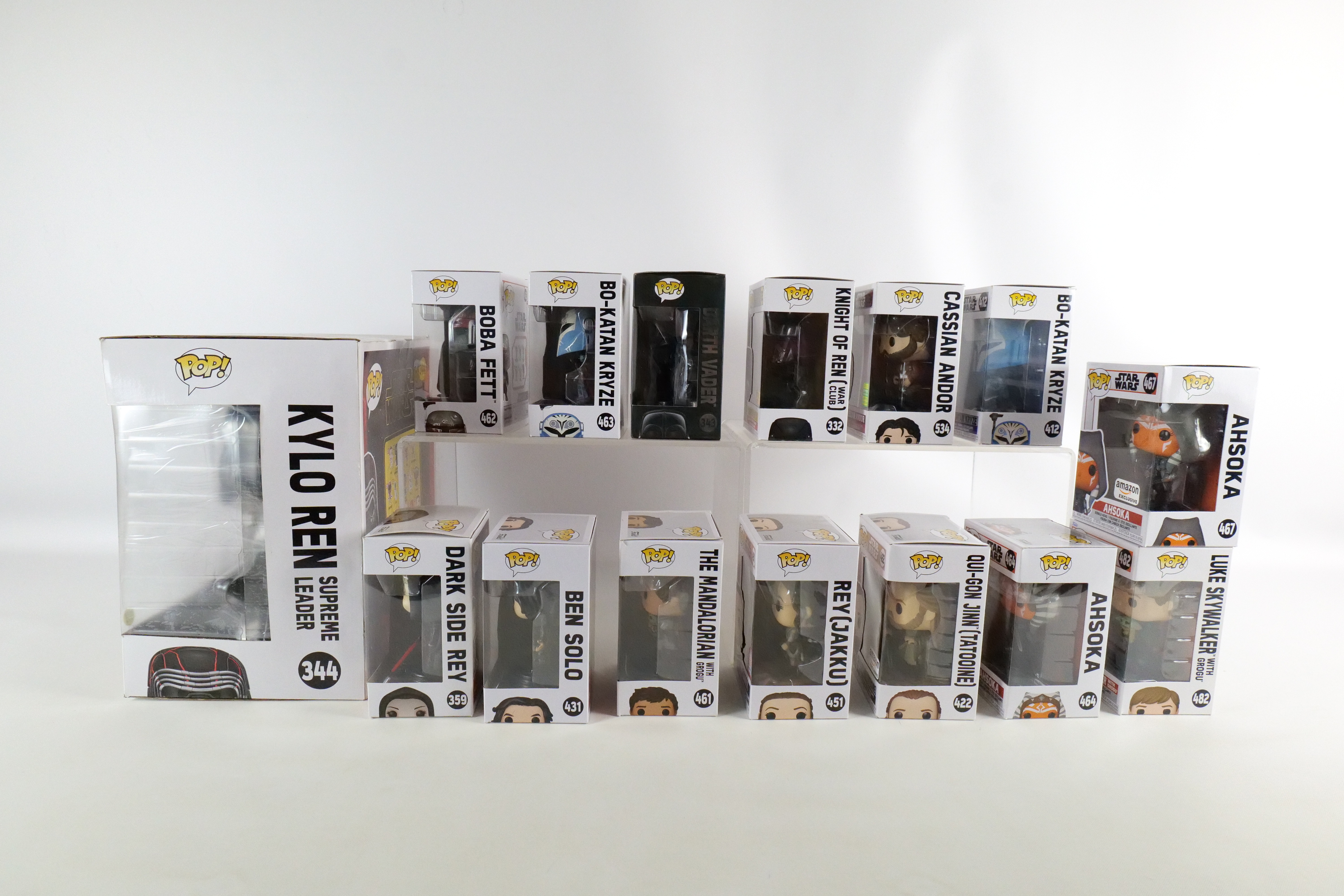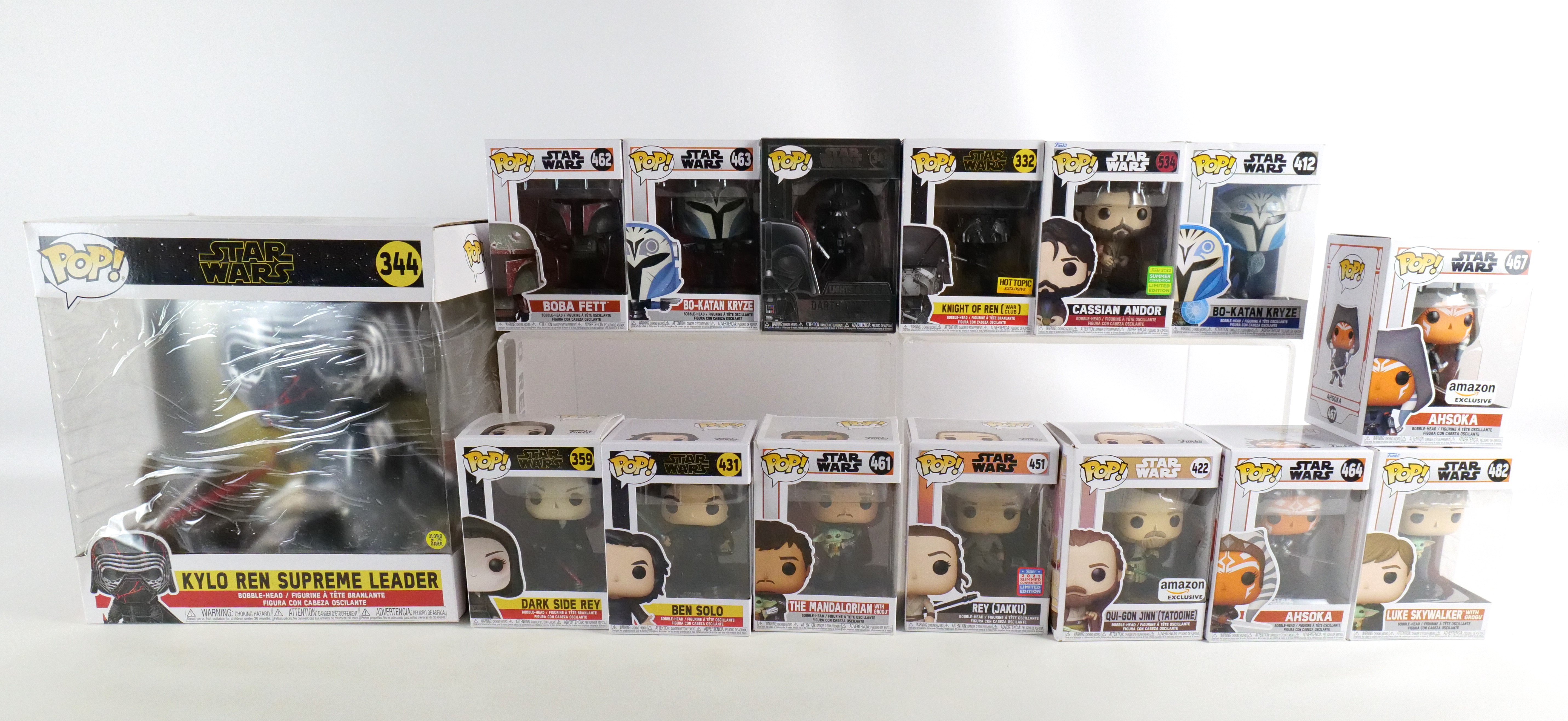 Lot of 15 Funko Star Wars Pops. Including Knight of Ren (War Club) #332, Darth Vader #343 Lights and Sound, Kylo Ren Supreme Leader #344 Glow in the Dark, Dark Side Rey #359, Bo-Katan Kryze #412, Qui-Gon Jinn #422 Amazon Exclusive – Some box dings, Ben Solo #431, Rey (Jakku) #451 Summer Convention Exclusive, The Mandalorian with Grogu #461, Boba Fett #462, Bo-Katan Kryze #463, Ahsoka #464, Ahsoka #467 Amazon Exclusive, Luke Skywalker with Grogu #482, and Cassian Andor #534 Summer Convention Exclusive. All pops are in new condition and come in the original boxes. The boxes may have slight wear/slight creasing/dings from storage. All invoices must be paid within 24 hours of the sale. We offer multiple shipping options please read the shipping terms to understand your options. We also offer Pick-Ups Friday, Saturday, and Monday immediately following the sale. BY APPOINTMENT ONLY.